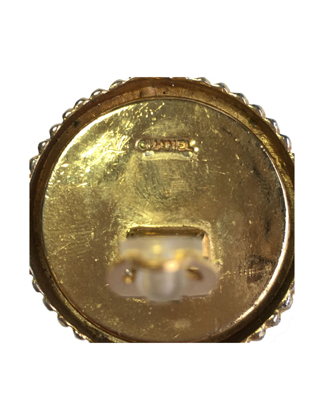En bon état. Les perles portent des marques (voir photo). Marque CHANEL gravée au dos de chaque clip. Bijou vintage.