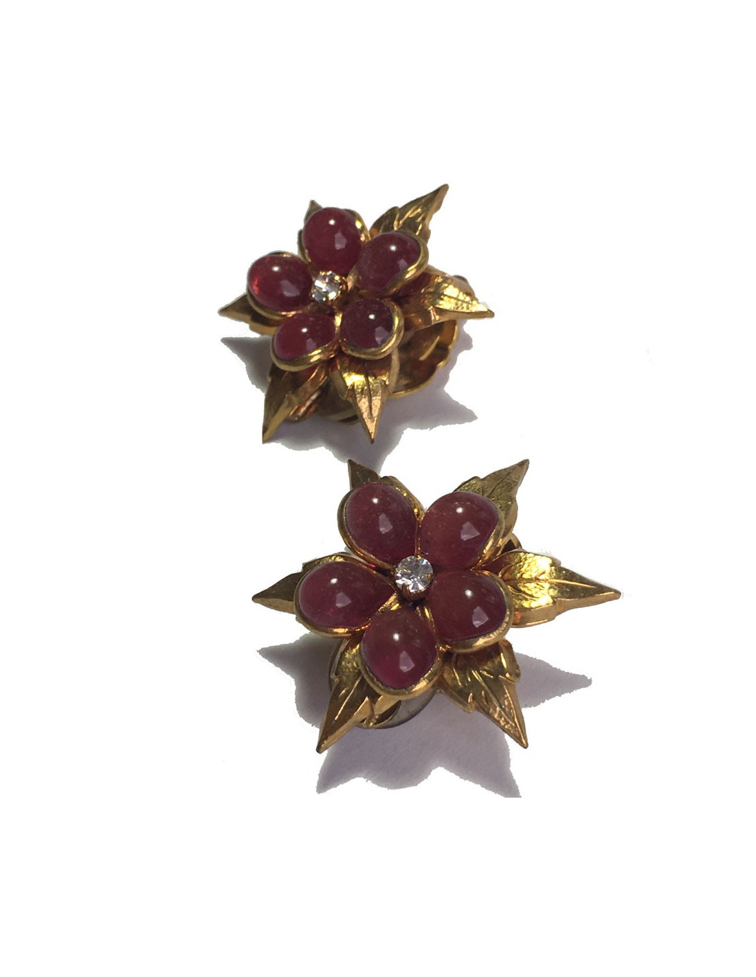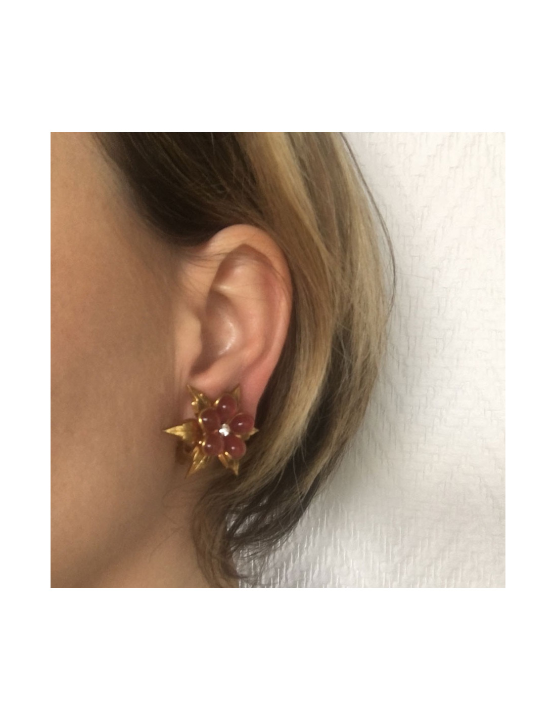 Magnifiques boucles d'oreille clips Marguerite de Valois "FLEURS & FEUILLES" en pâte de verre rose mélé, coeur en strass Swarovski & métal doré à l'or fin.