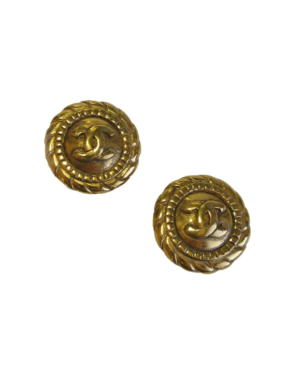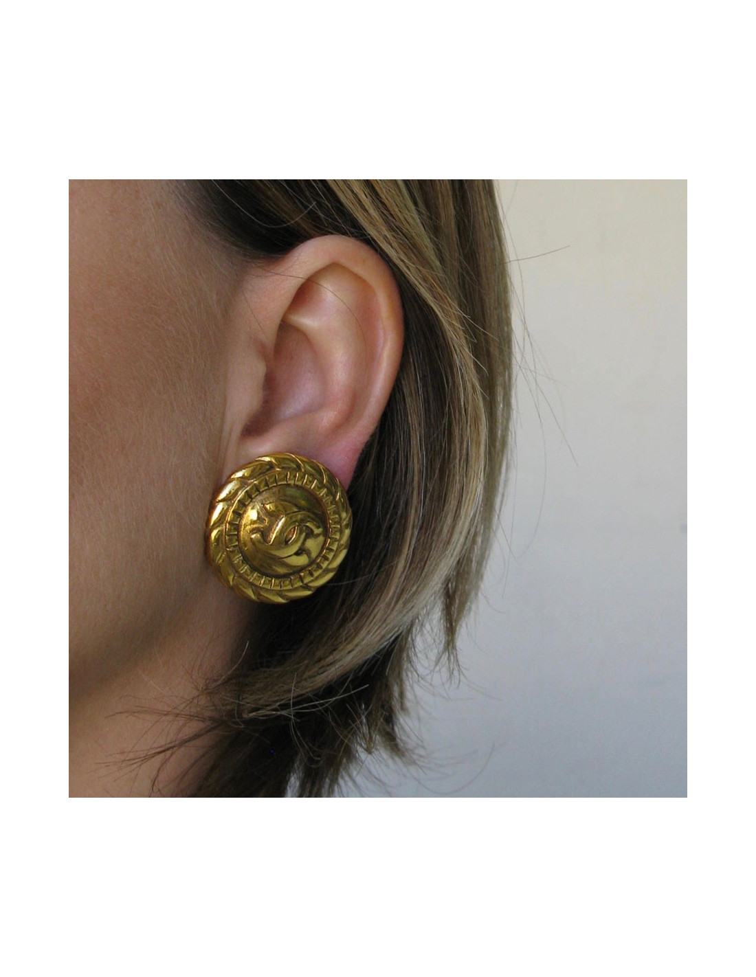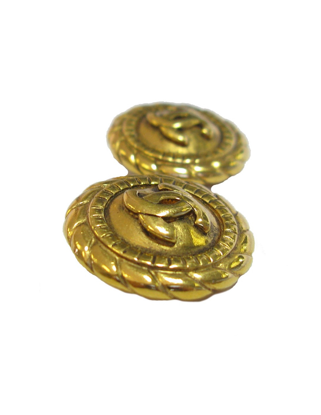 Boucles d'oreille clips Chanel rondes en métal doré. Un CC se situe au centre de chaque boucle.