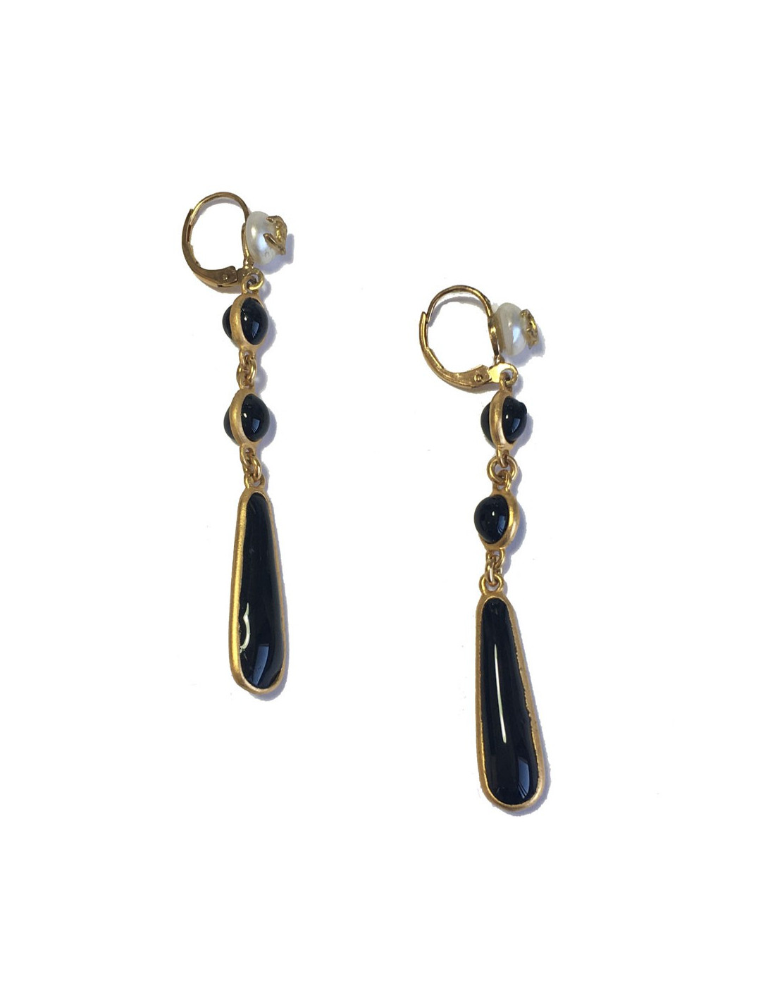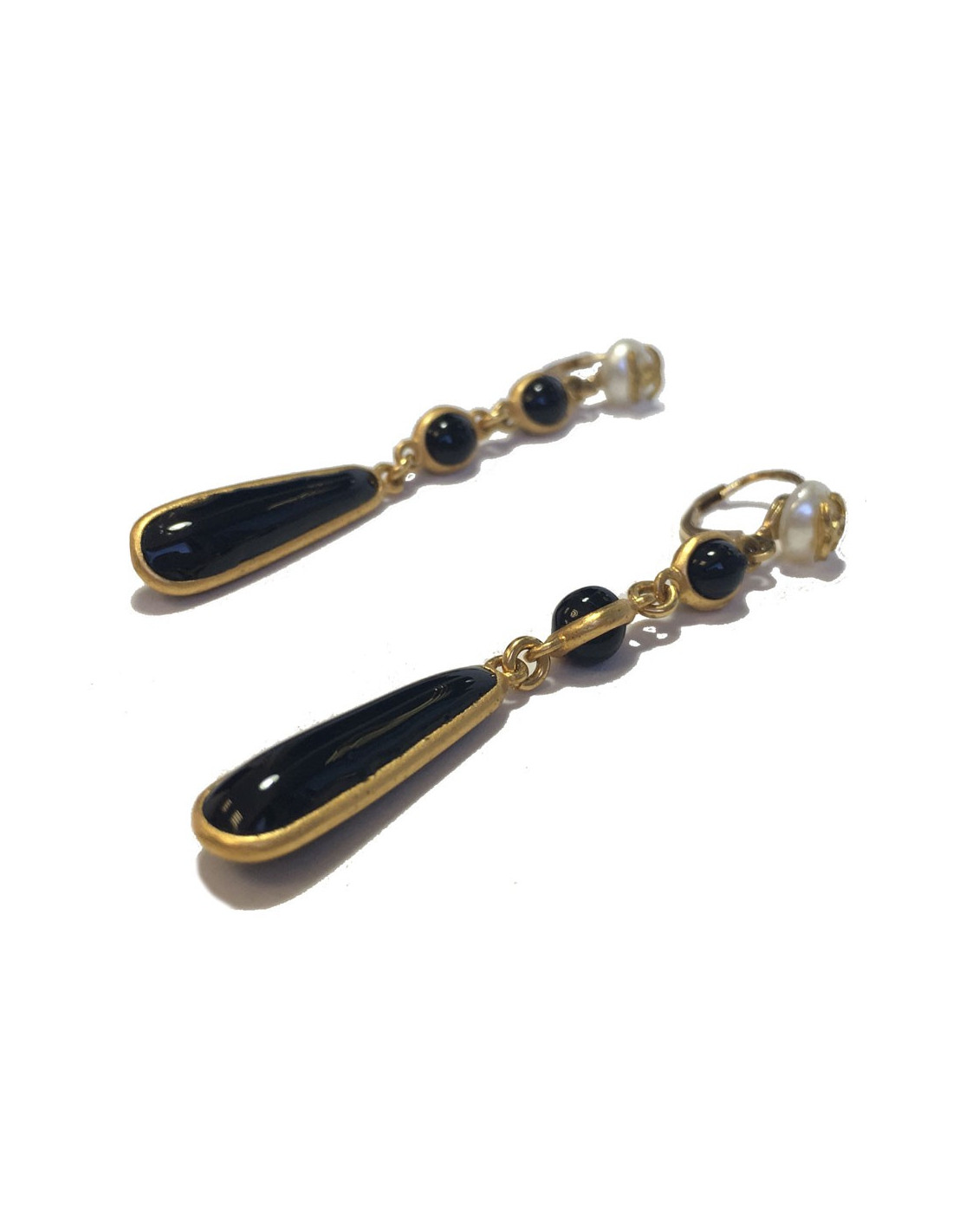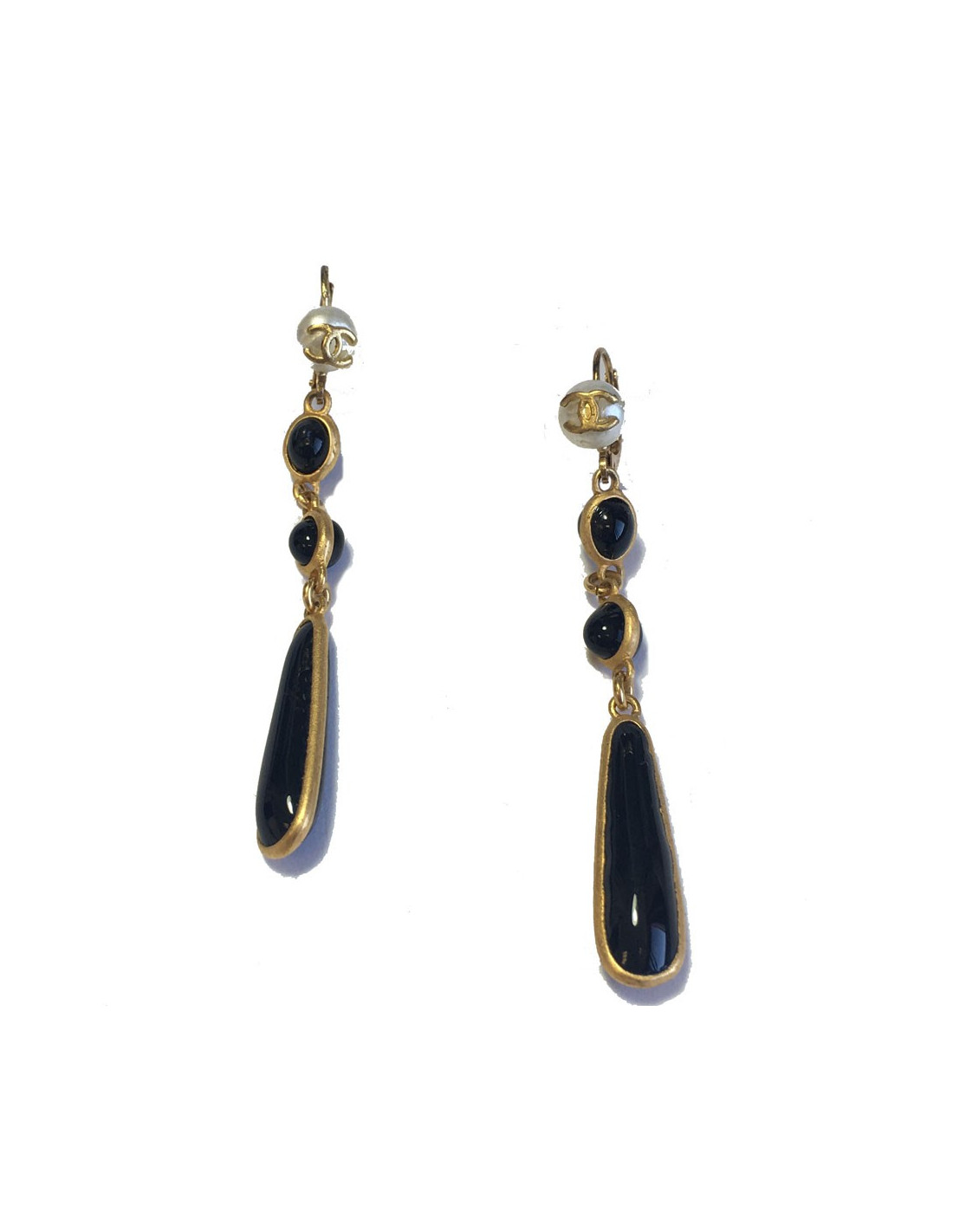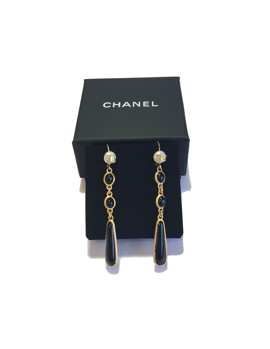 Boucles d'oreilles clous CHANEL pendantes en métal doré, pâte de verre noire et perle nacrée