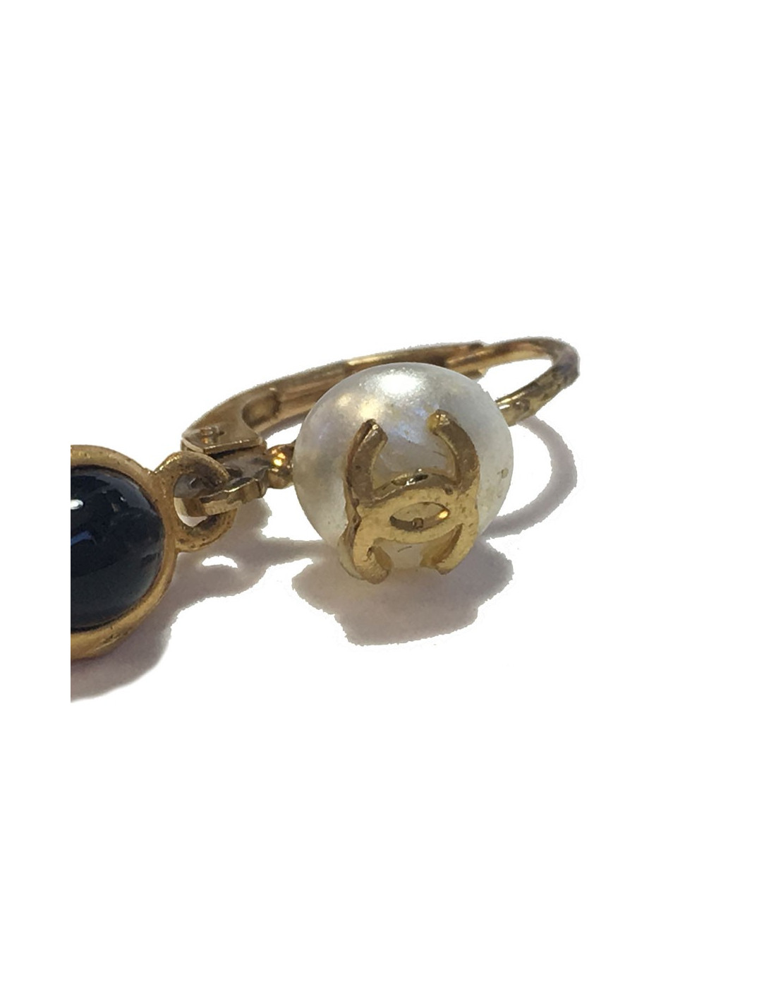 En métal couleur or mat, petite perle nacrée sur laquelle est apposé un double C doré et de la pâte de verre noire.