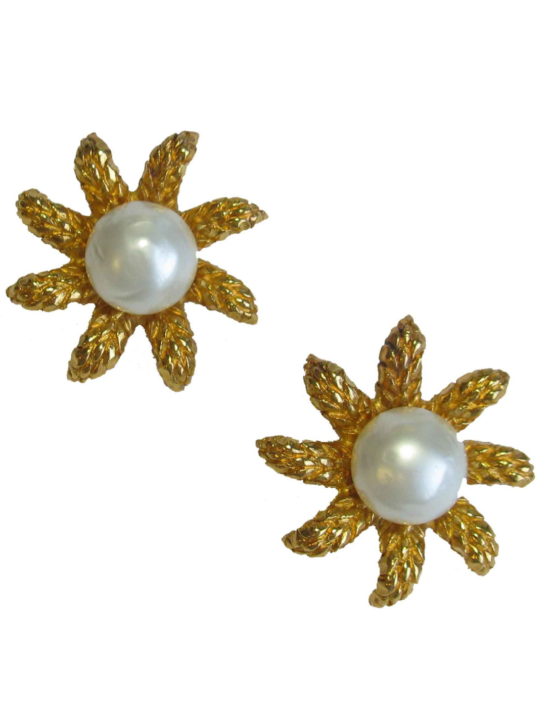 Superbes boucles d'oreille clips Chanel forme épis de blé avec une belle perle nacrée en pâte de verre en son centre. CHANEL gravé au dos de chaque boucle d'oreille.