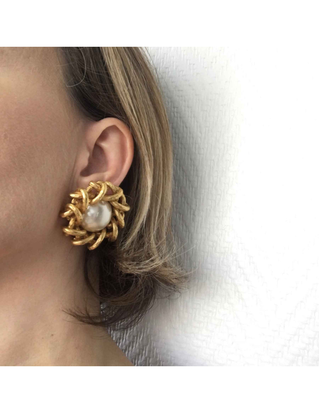 Boucles d'oreille clips CHANEL martelées et perles nacrées Couture