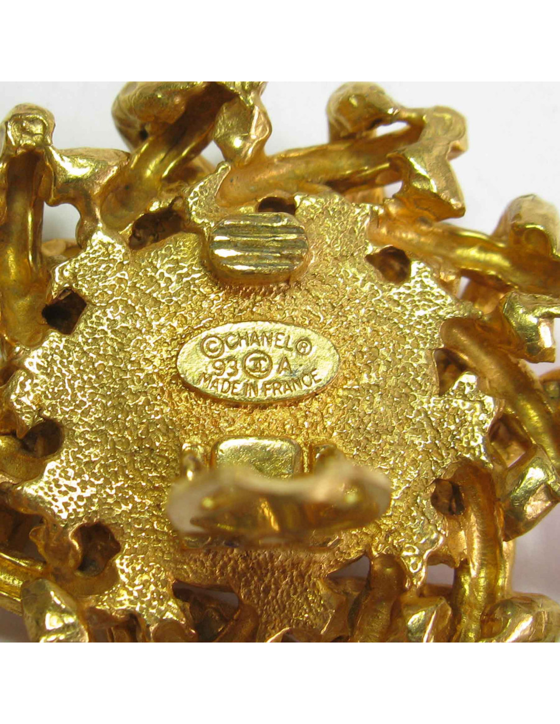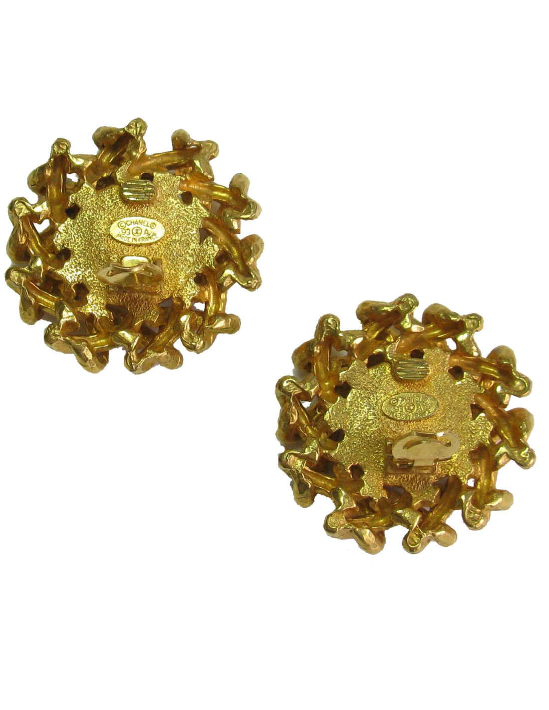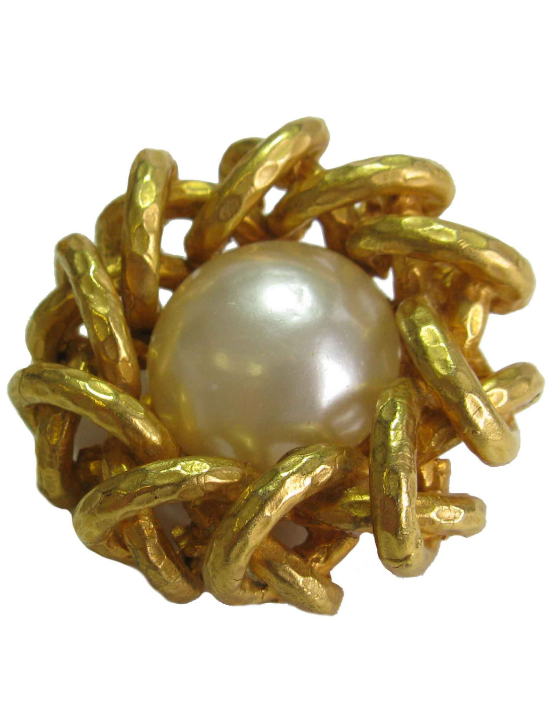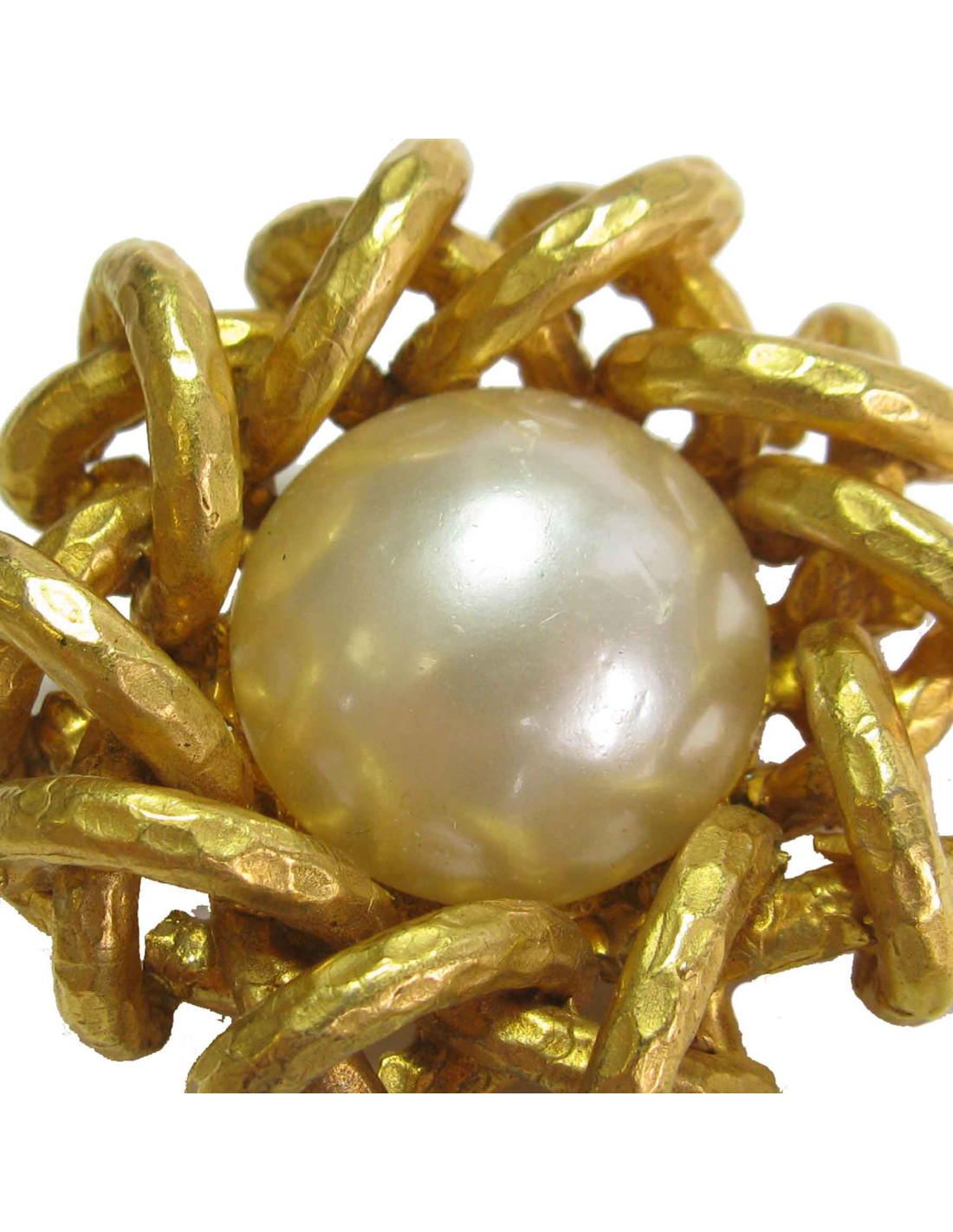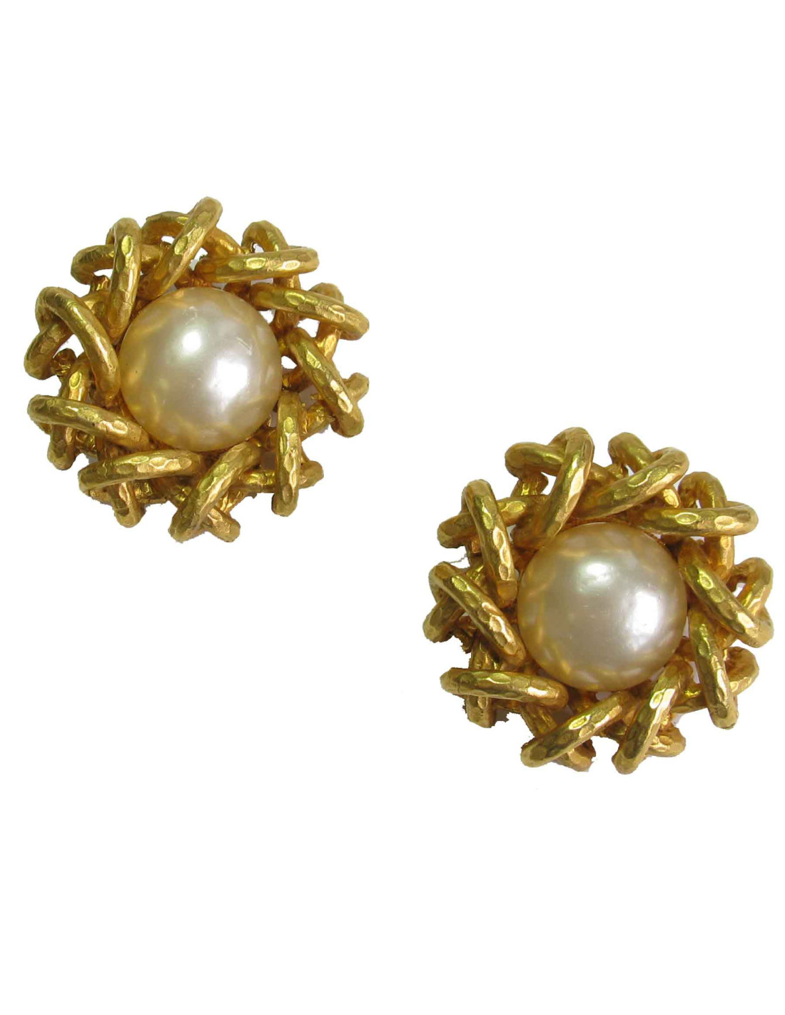 Couture! belles boucles d'oreille clips Chanel en métal doré martelé et perles nacrées.