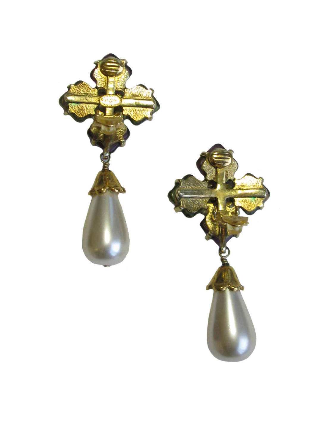 Très belles boucles d'oreille clips Chanel en métal doré, perle nacrée en forme de goutte et pierres fantaisies vertes et rouges. Un CC doré au centre de la boucle d'oreille.