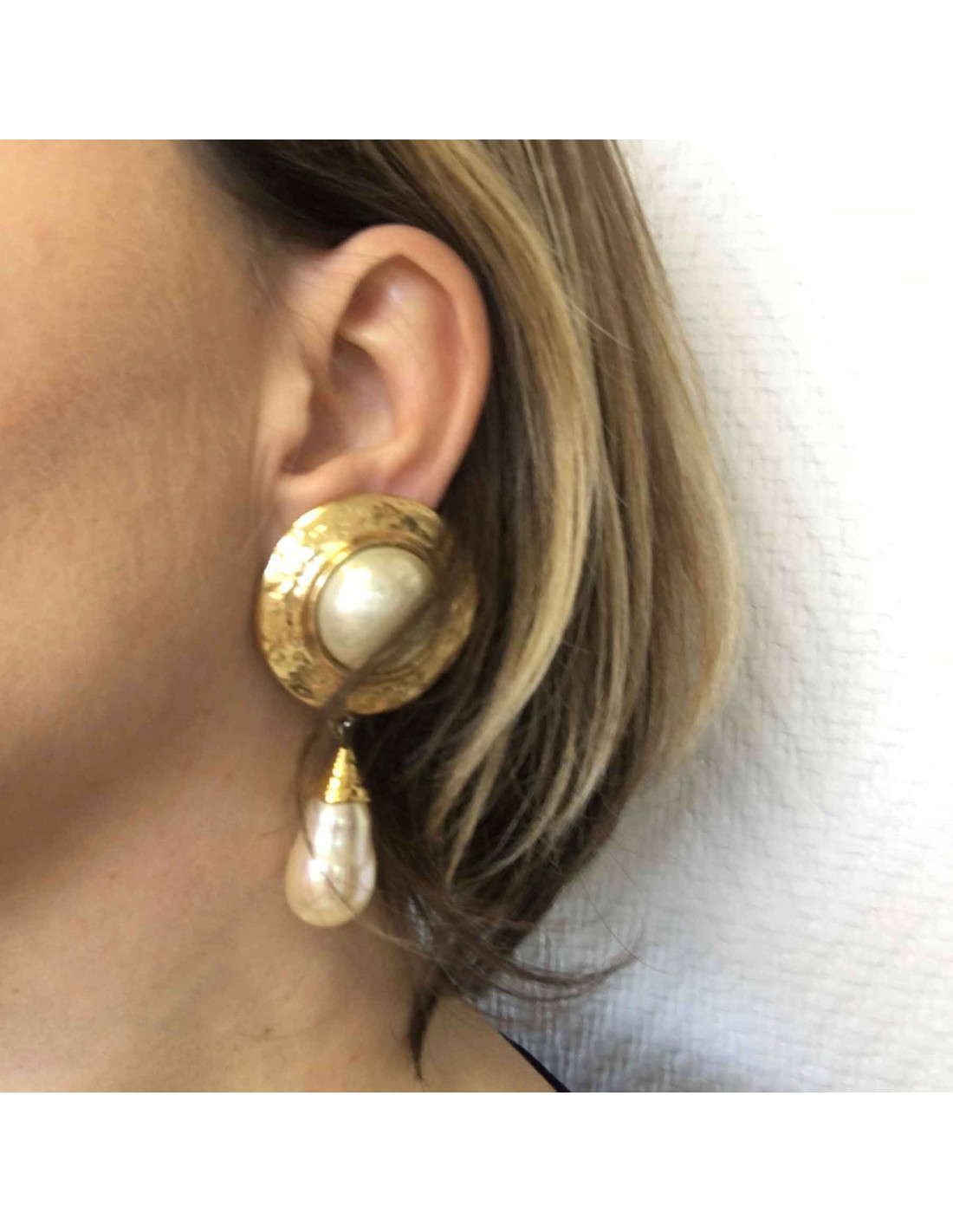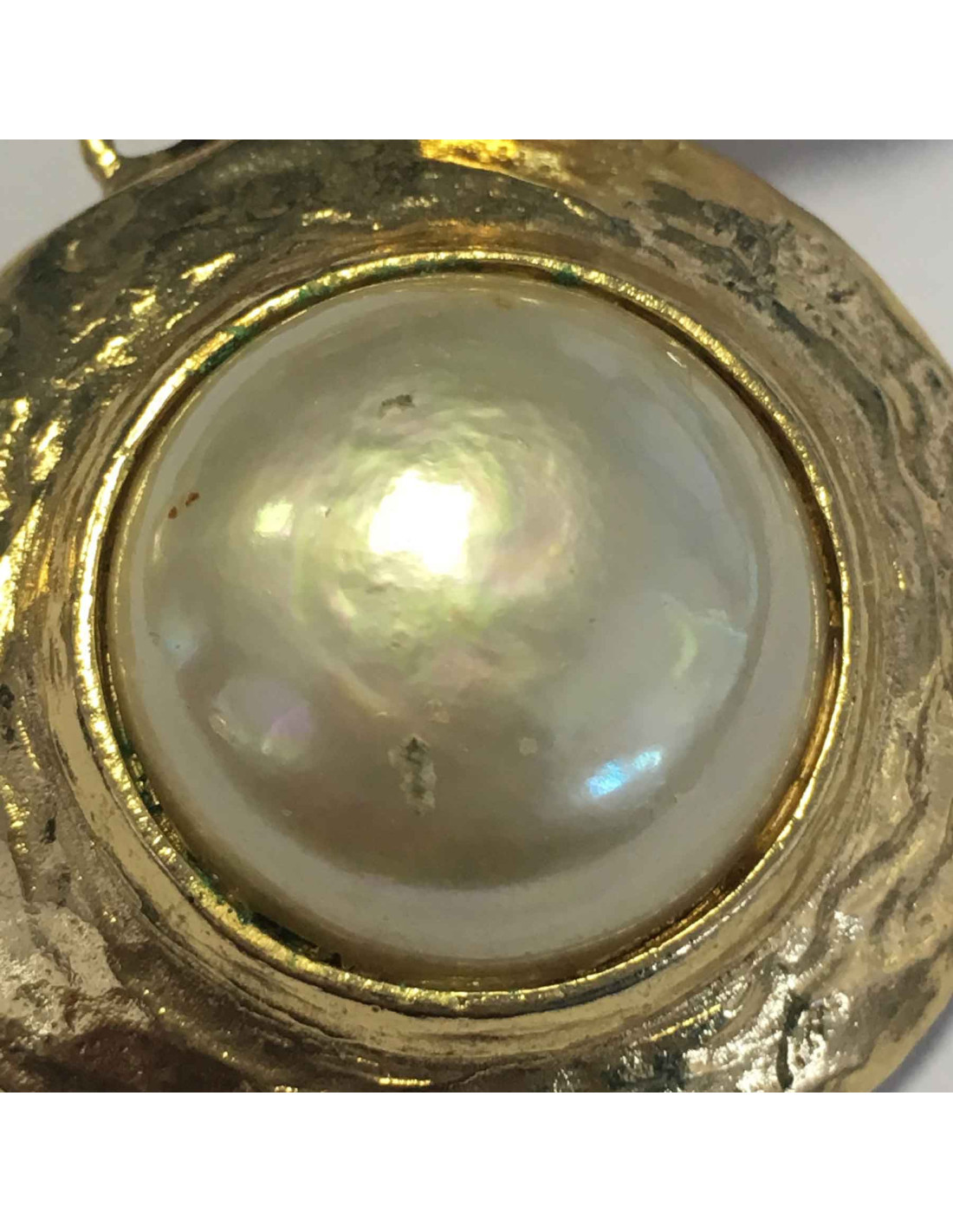 Boucles d'oreille clips YSL Yves Saint Laurent pendantes en métal doré aspect martelé et perles nacrées, rondes et en forme de goutte. Bijou vintage en bon état. De petits éclats sur les perles.