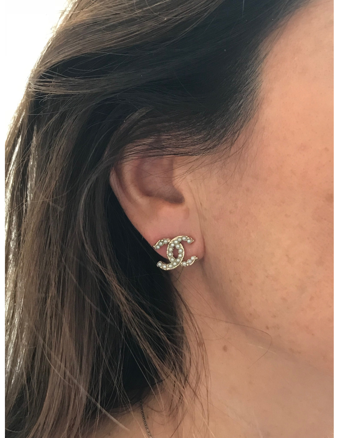 Boucles d'oreille clous CC en métal doré sertis de petites perles nacrées. Les perles nacrées ont pour certaines perdues leur nacre mais cela ne se voit que de très près.