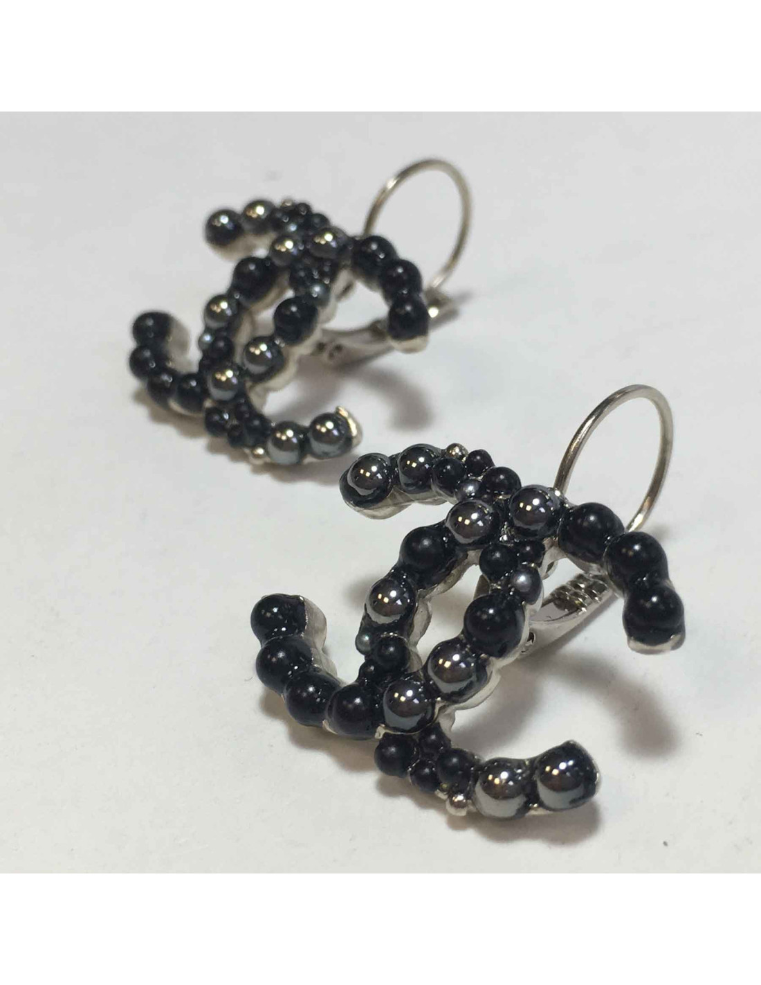 Créoles clous CHANEL CC perlées noir et gris argenté