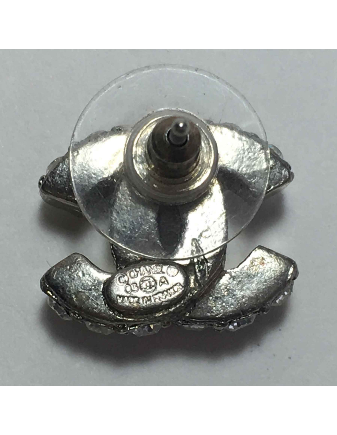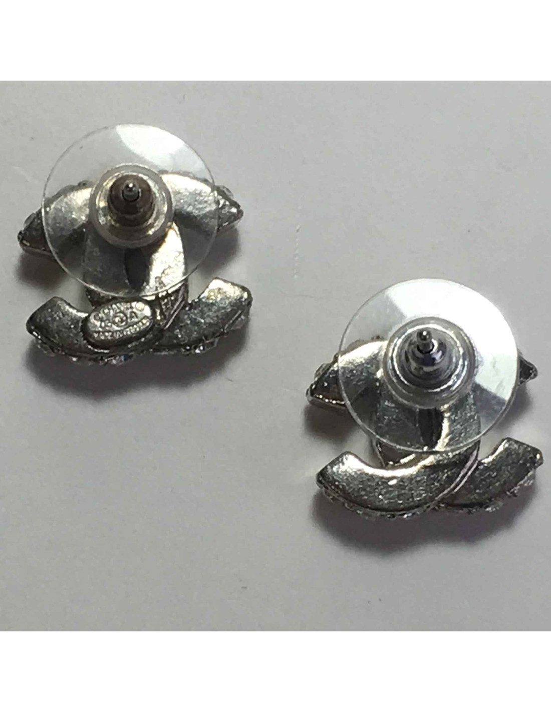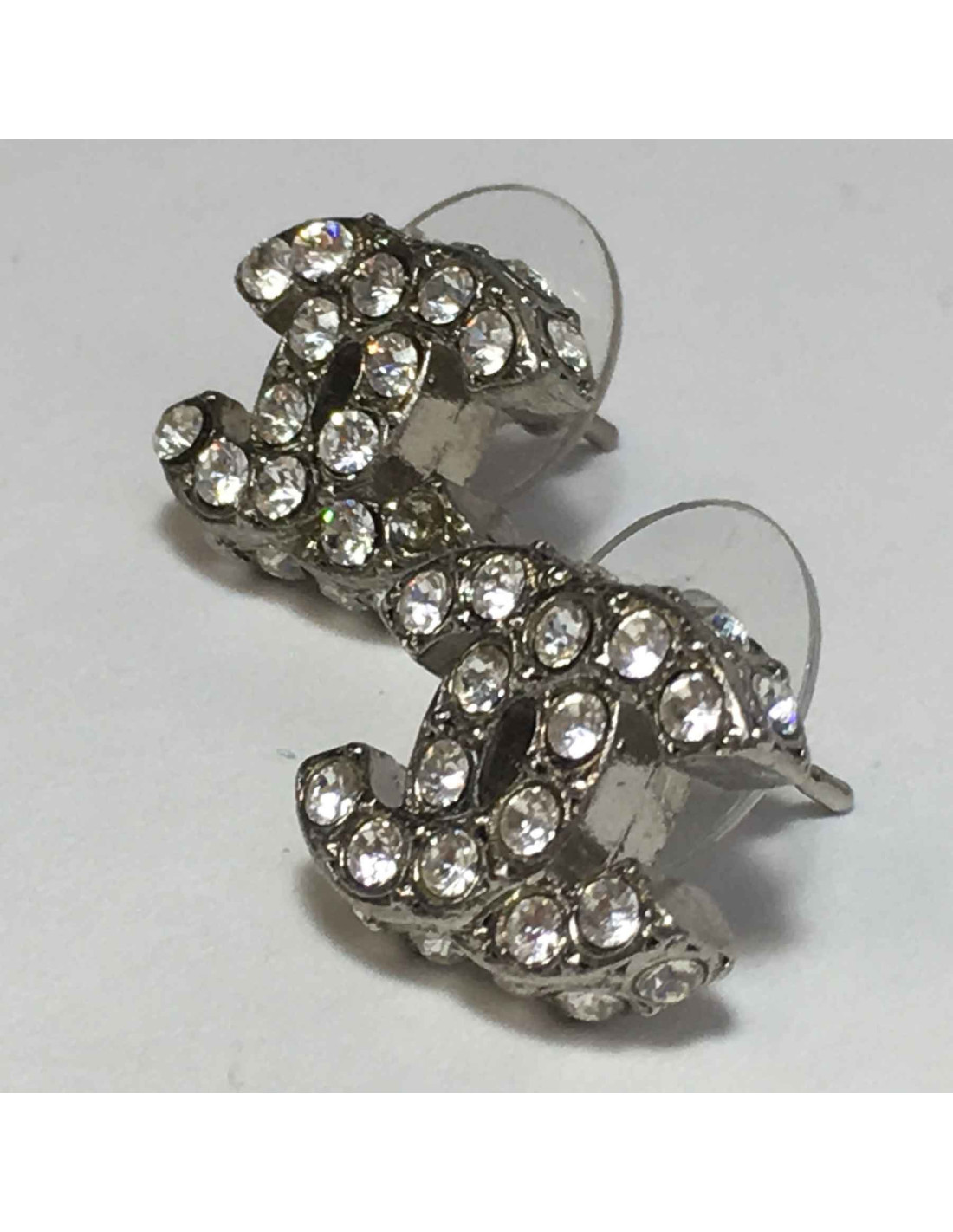 Boucles d'oreilles clous CHANEL CC en métal argenté et strass