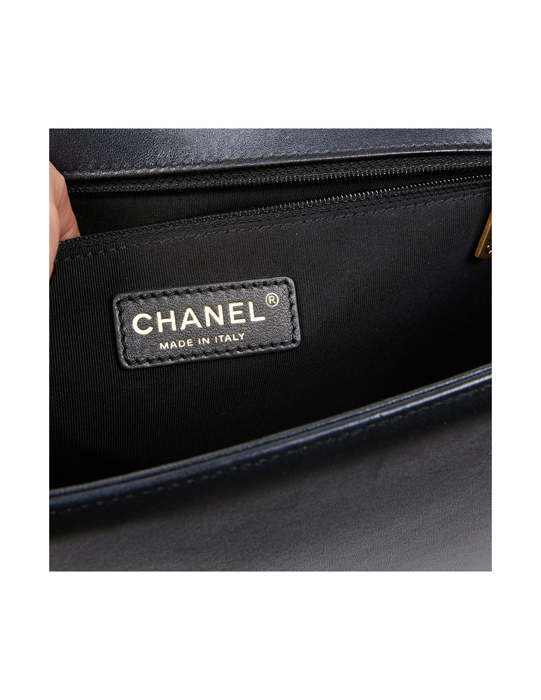 Ce grand sac "Boy" d'occasion Chanel est en cuir noir irisé matelassé. Ses attributs métalliques sont doré vieilli. La fermeture par rabat s'ouvre sur un intérieur en cuir noir. Il se porte à l'épaule par une bandoulière. Il a un grand compartiment à l'intérieur avec deux poches dont une zippée. La doublure est en tissu noir. Le modèle Boy reste l'un des grands classiques de la marque avec son côté rock. Ce sac est en très bon état . Sous le rabat et par endroits du sac, il il a des marques très peu visibles à l'extérieur.
