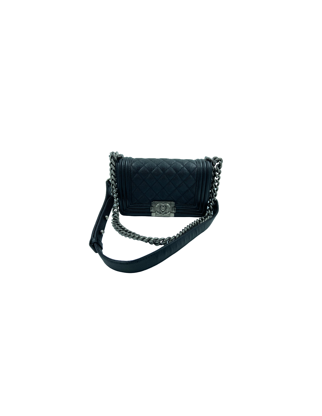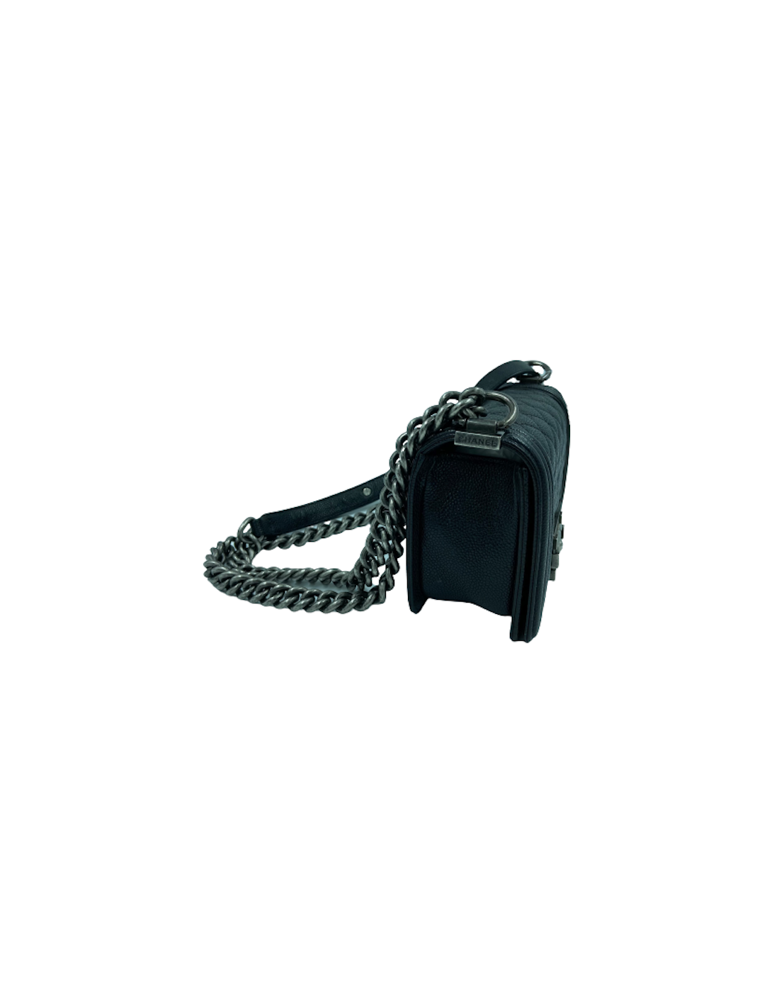 Ce mini Boy est en cuir caviar noir avec une bijouterie en métal argent vieilli. Il n'a aucune usure et est en très bon état.