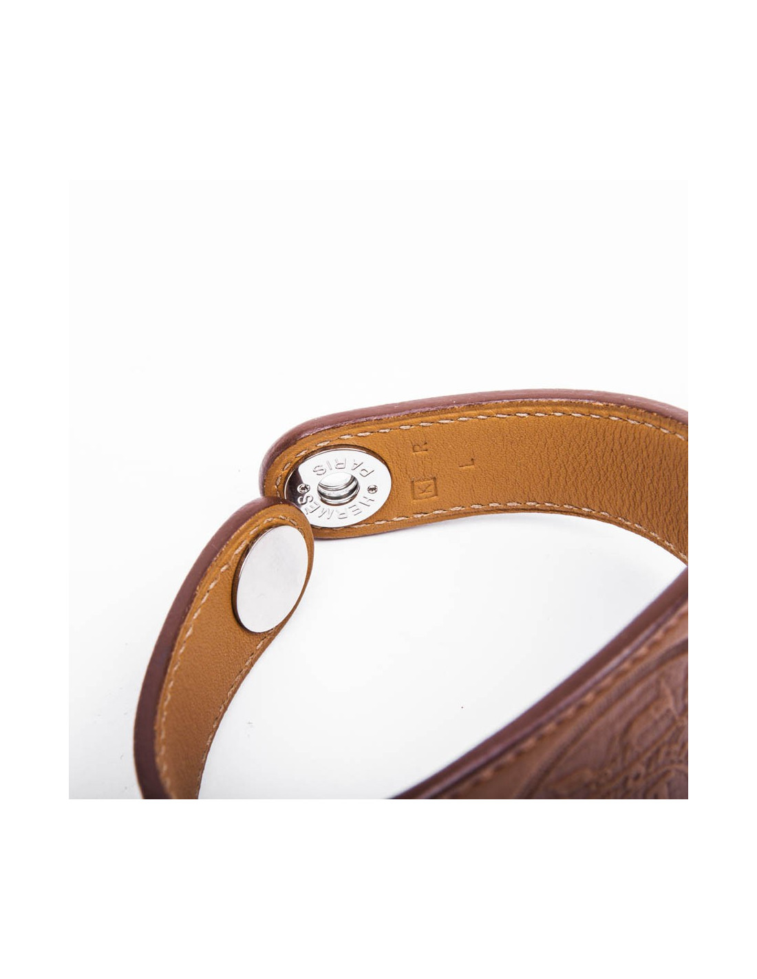 Bracelet Hermès taille L en cuir lisse de veau barénia gold et bijouterie en métal argent palladié.