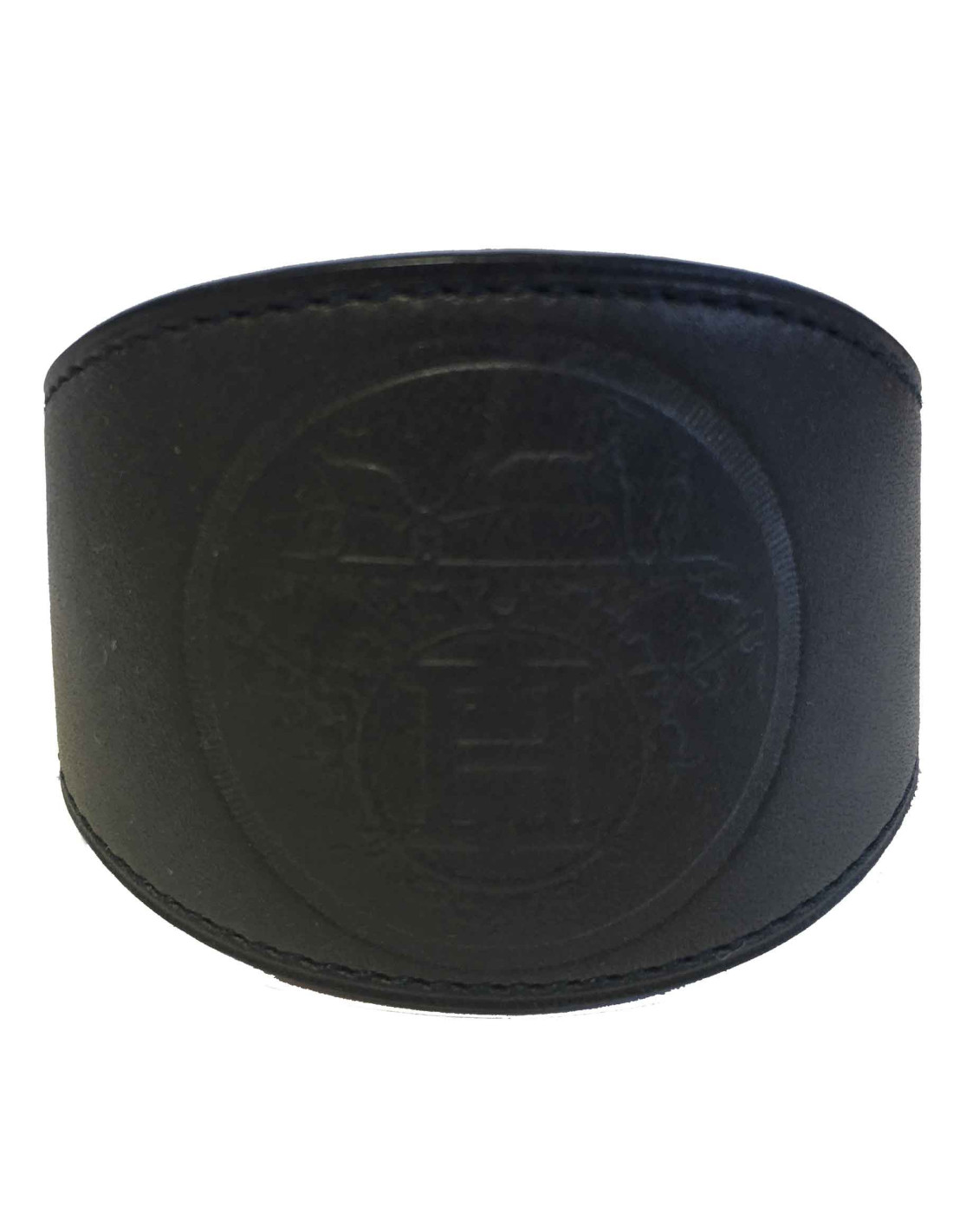 Bracelet en cuir marron très foncé (proche du noir) Hermès, non ajustable, il se ferme par un bouton pression en métal argenté.