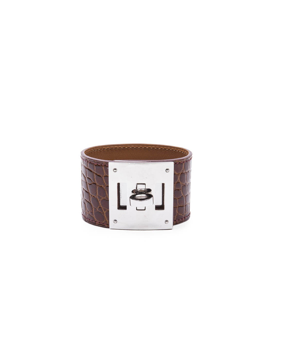Manchette Hermès en cuir de crocodile marron noisette. Elle a un fermoir à trois niveaux en argent palladié. Lettre R dans un