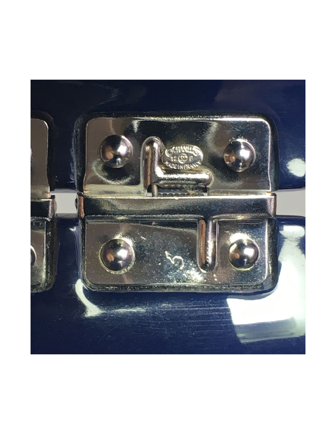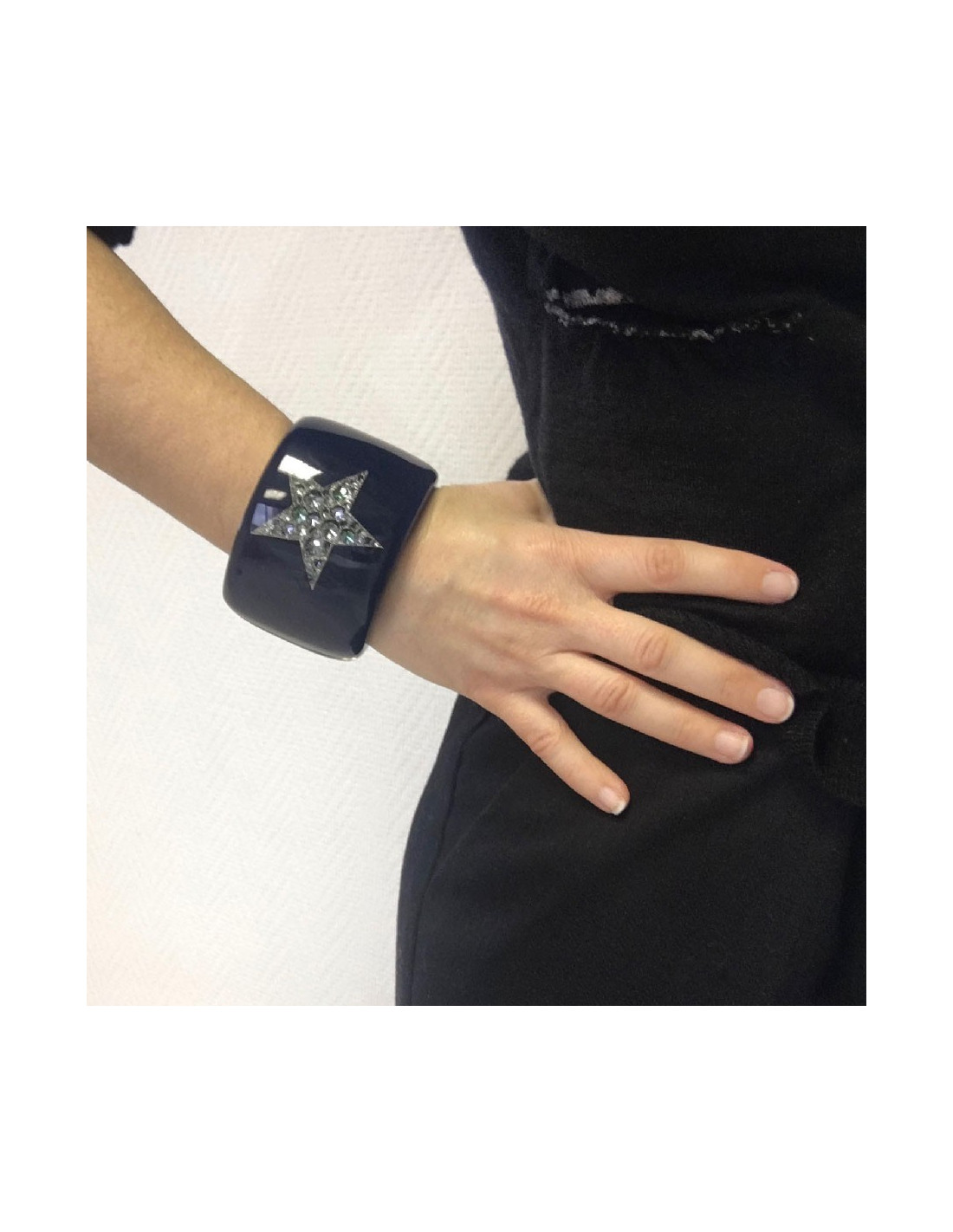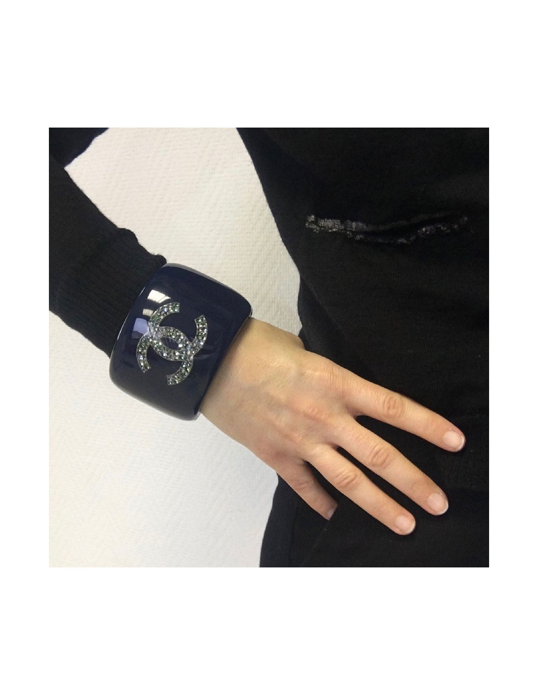 Manchette CHANEL en résine bleu laqué, CC et étoile avec inclusions de strass
