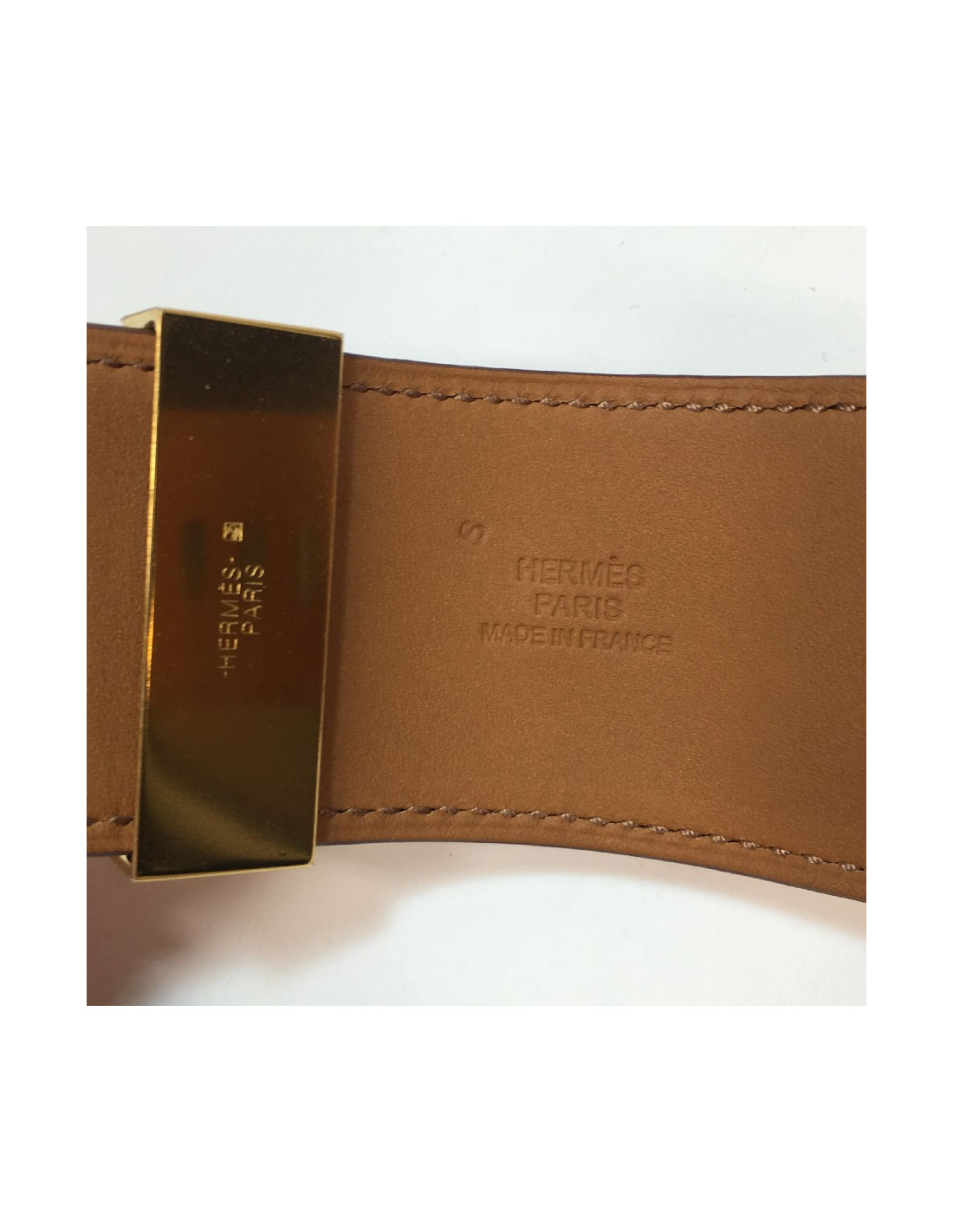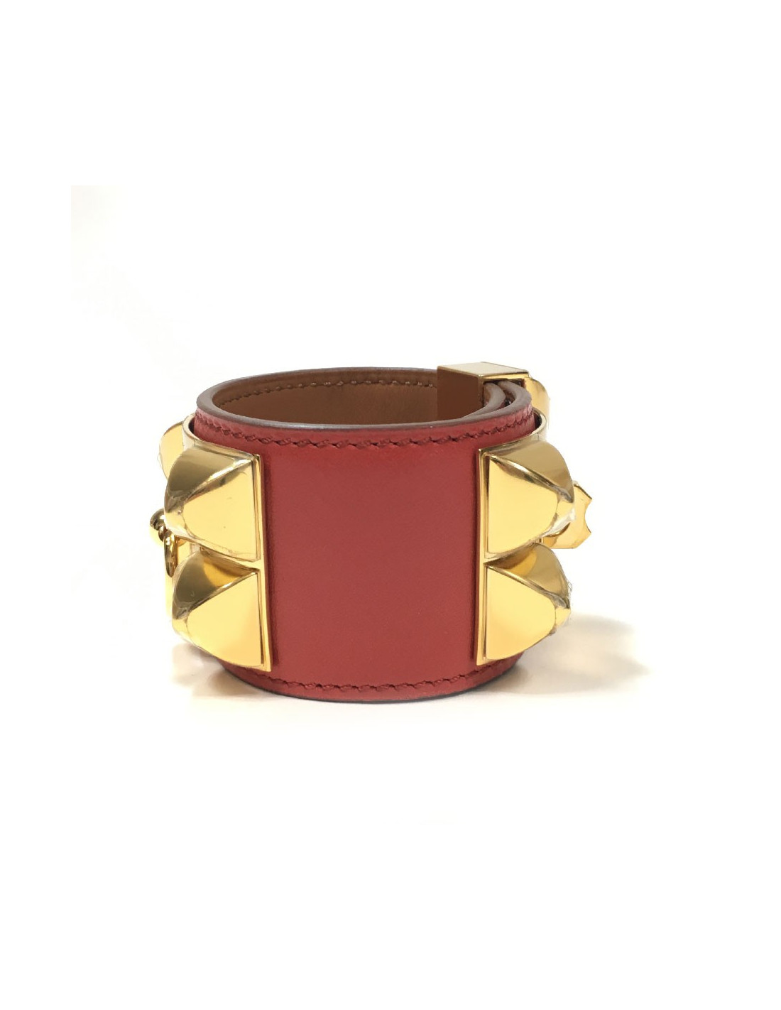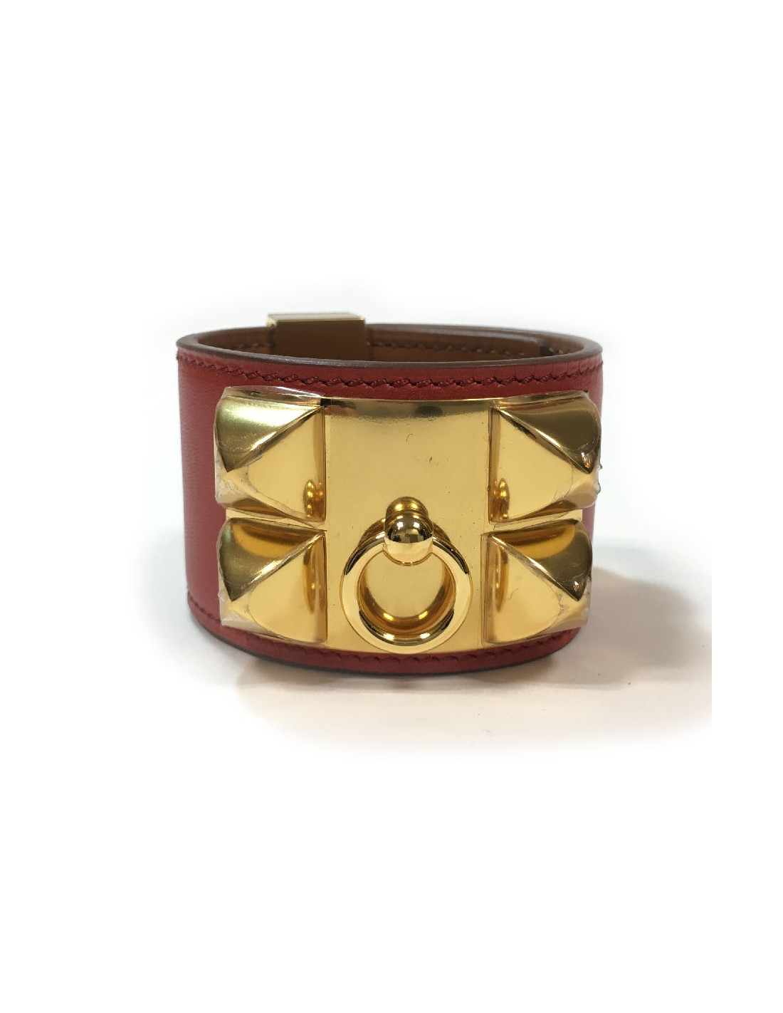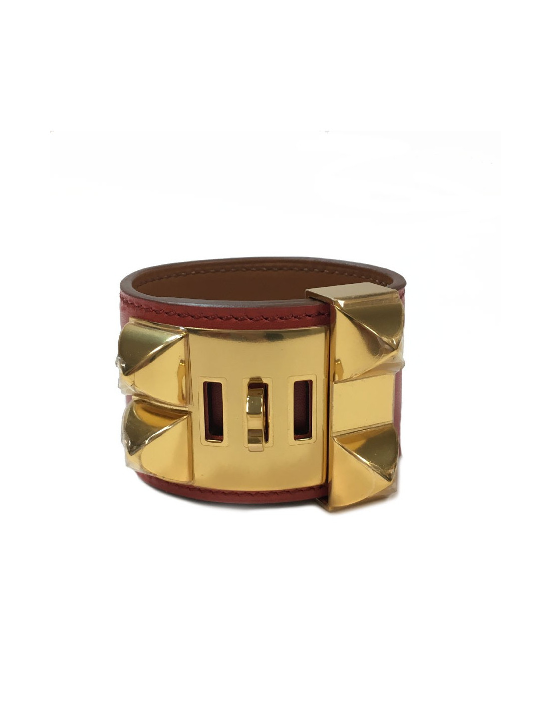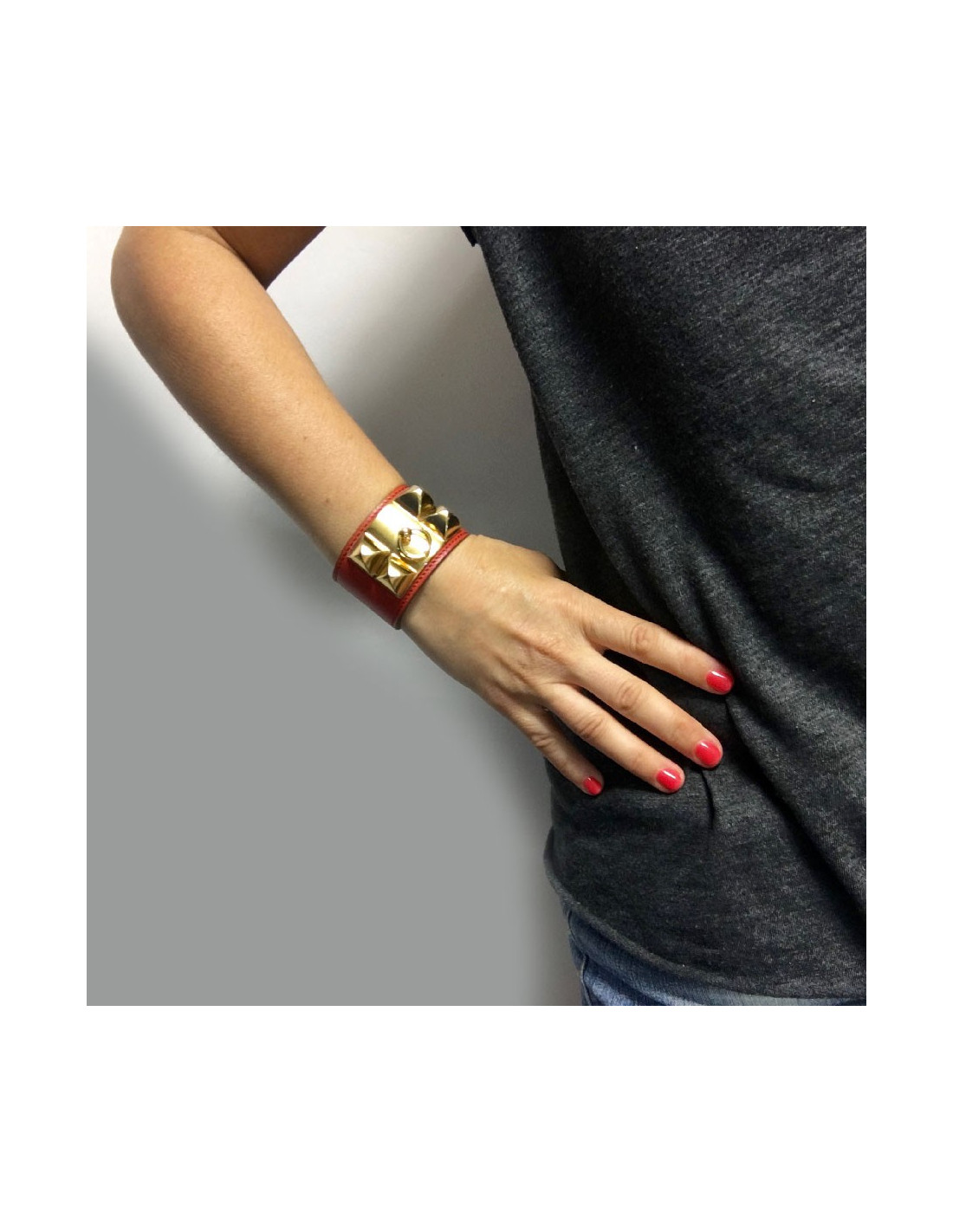 Manchette Hermès CDC en veau couleur sanguine et bijouterie dorée.