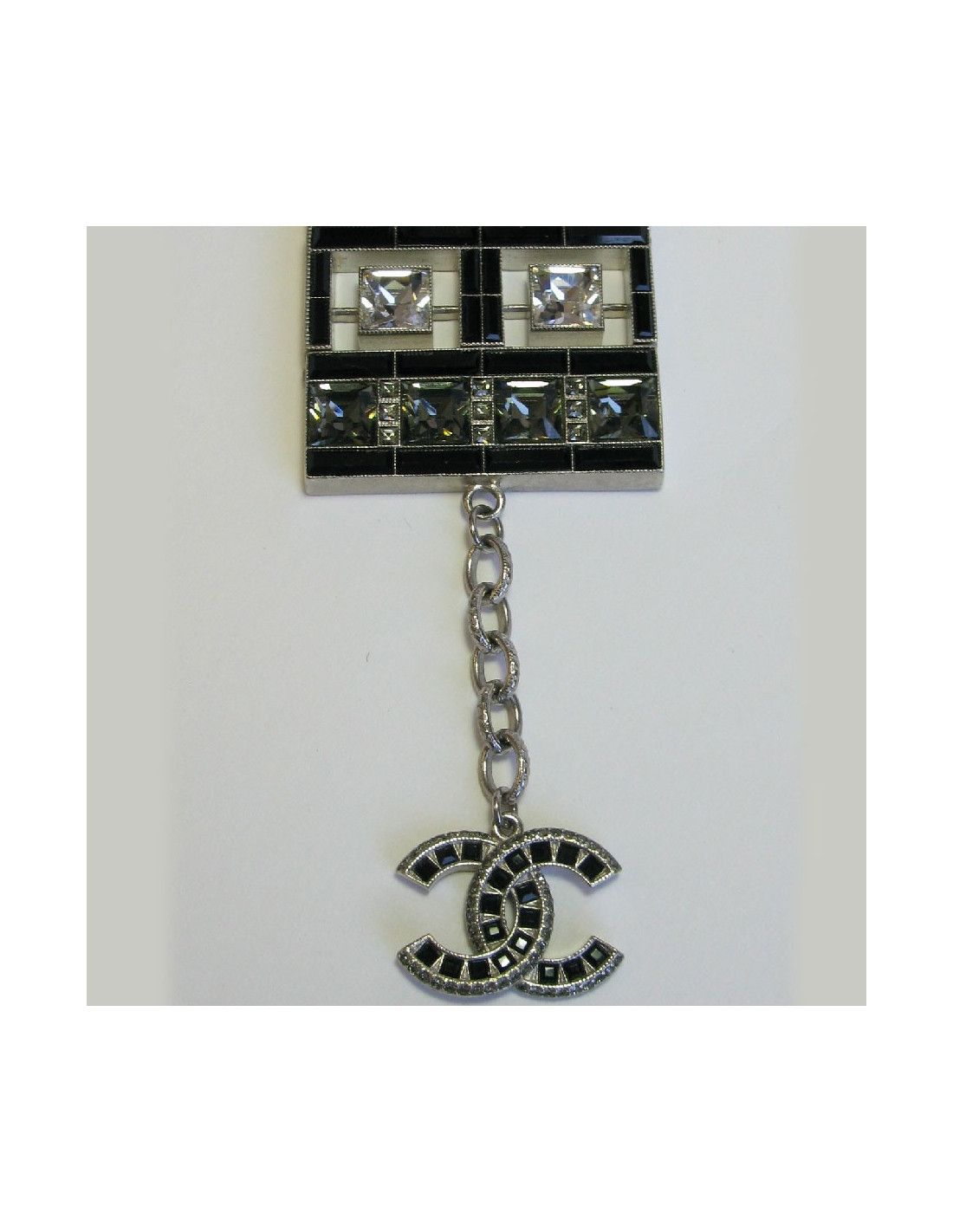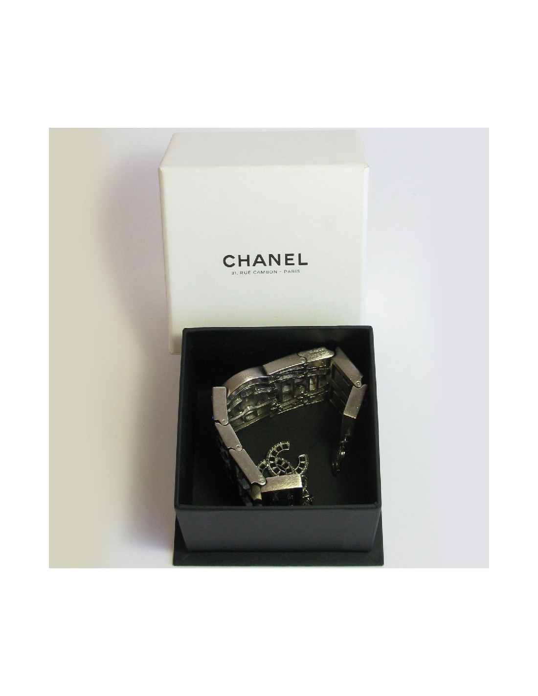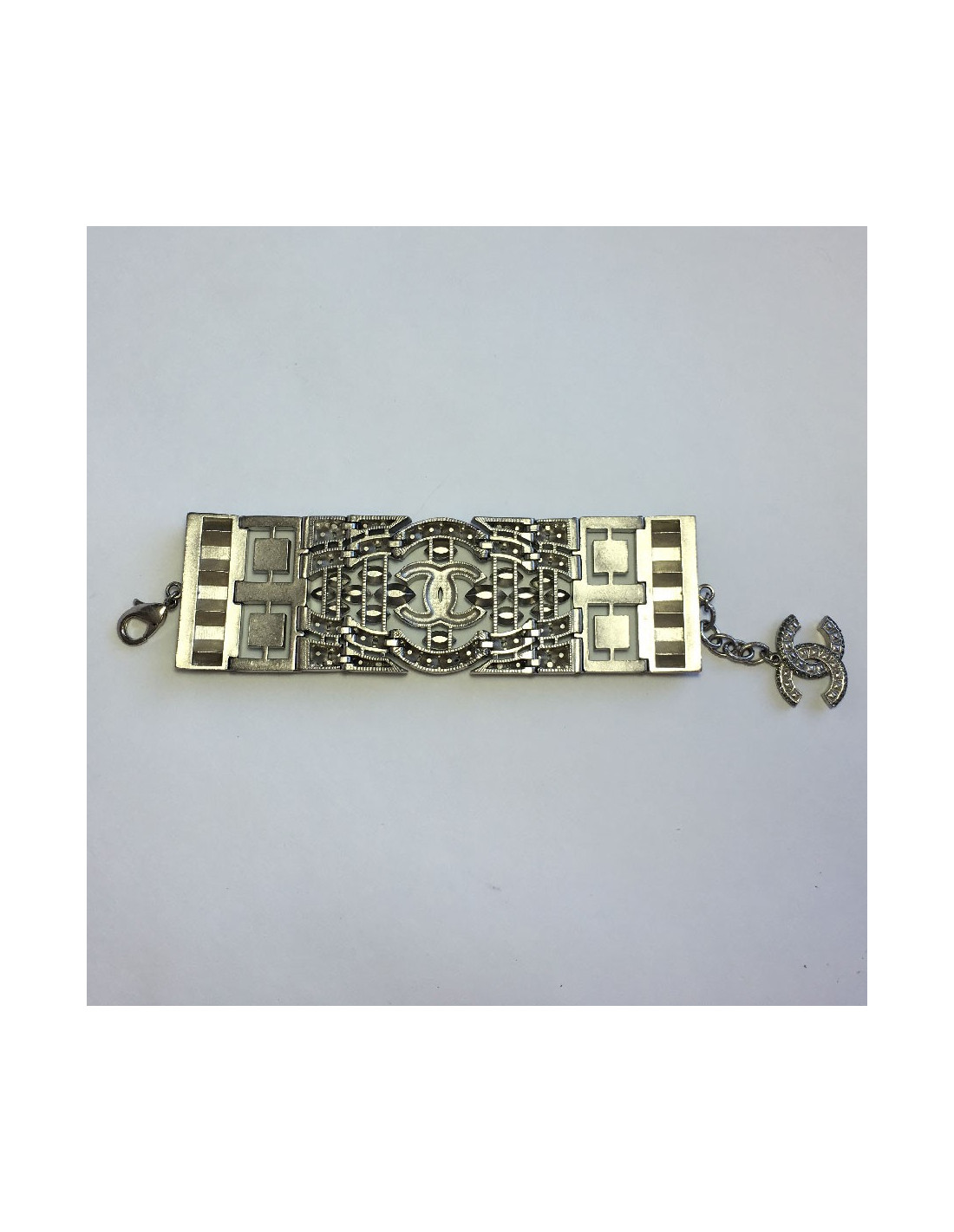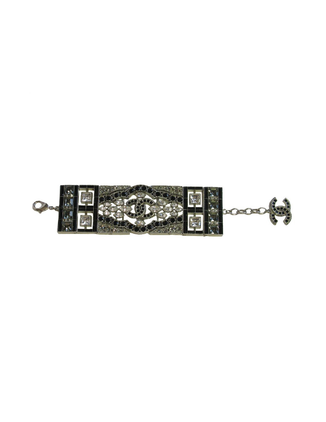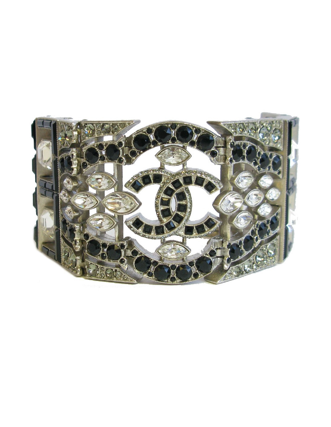 Couture! Superbe manchette articulée Chanel en métal argenté mat sertie de strass Swarovski de différentes formes. Un CC au centre.
