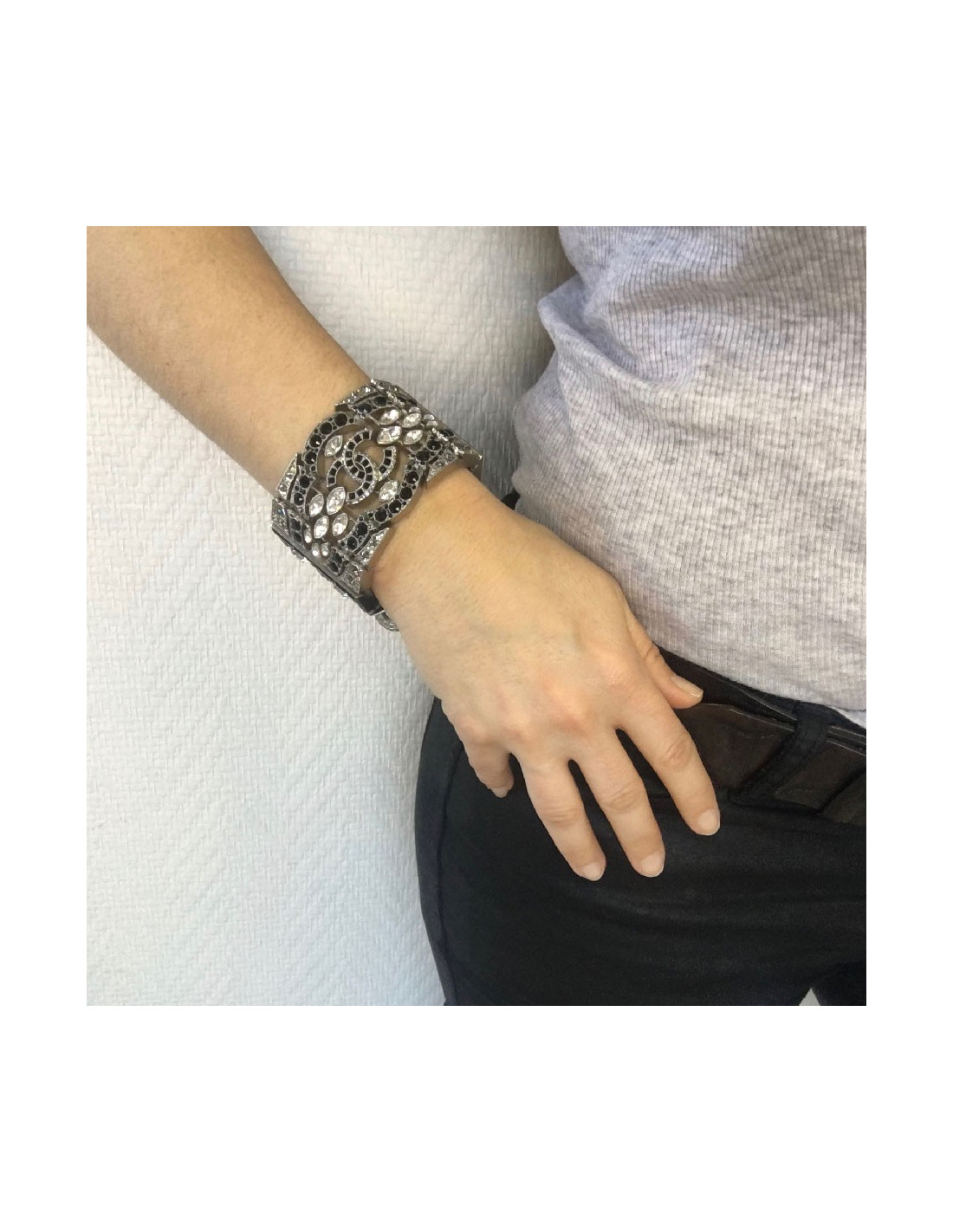 Manchette CHANEL Couture en métal argenté et strass
