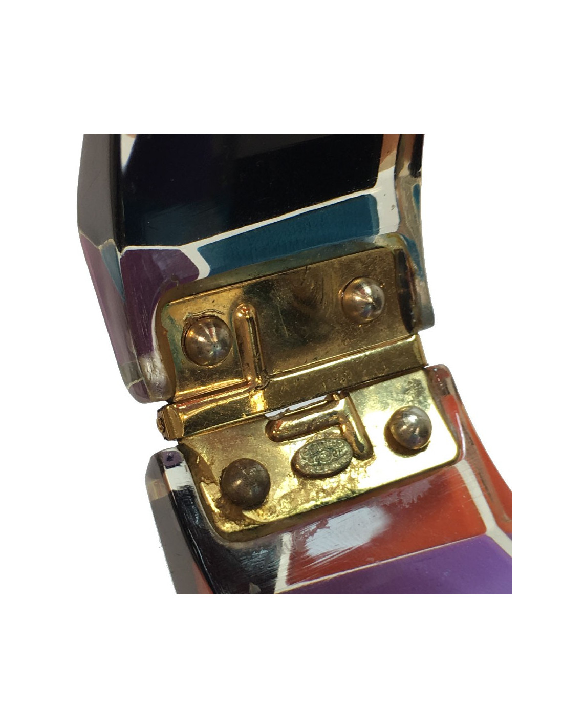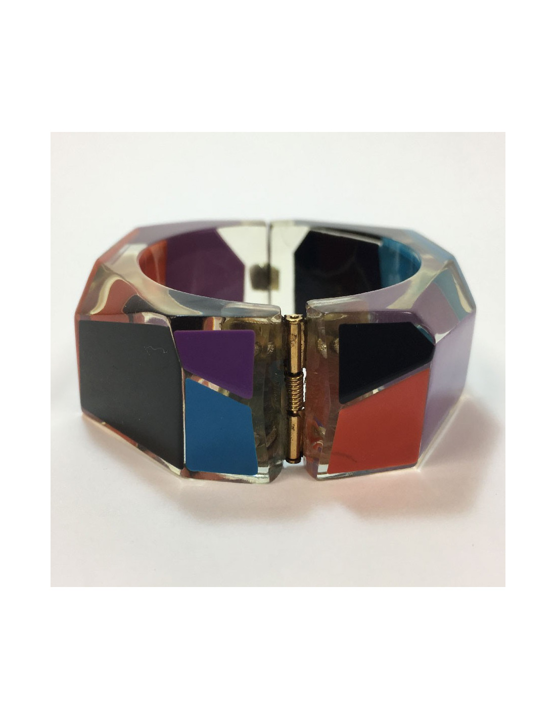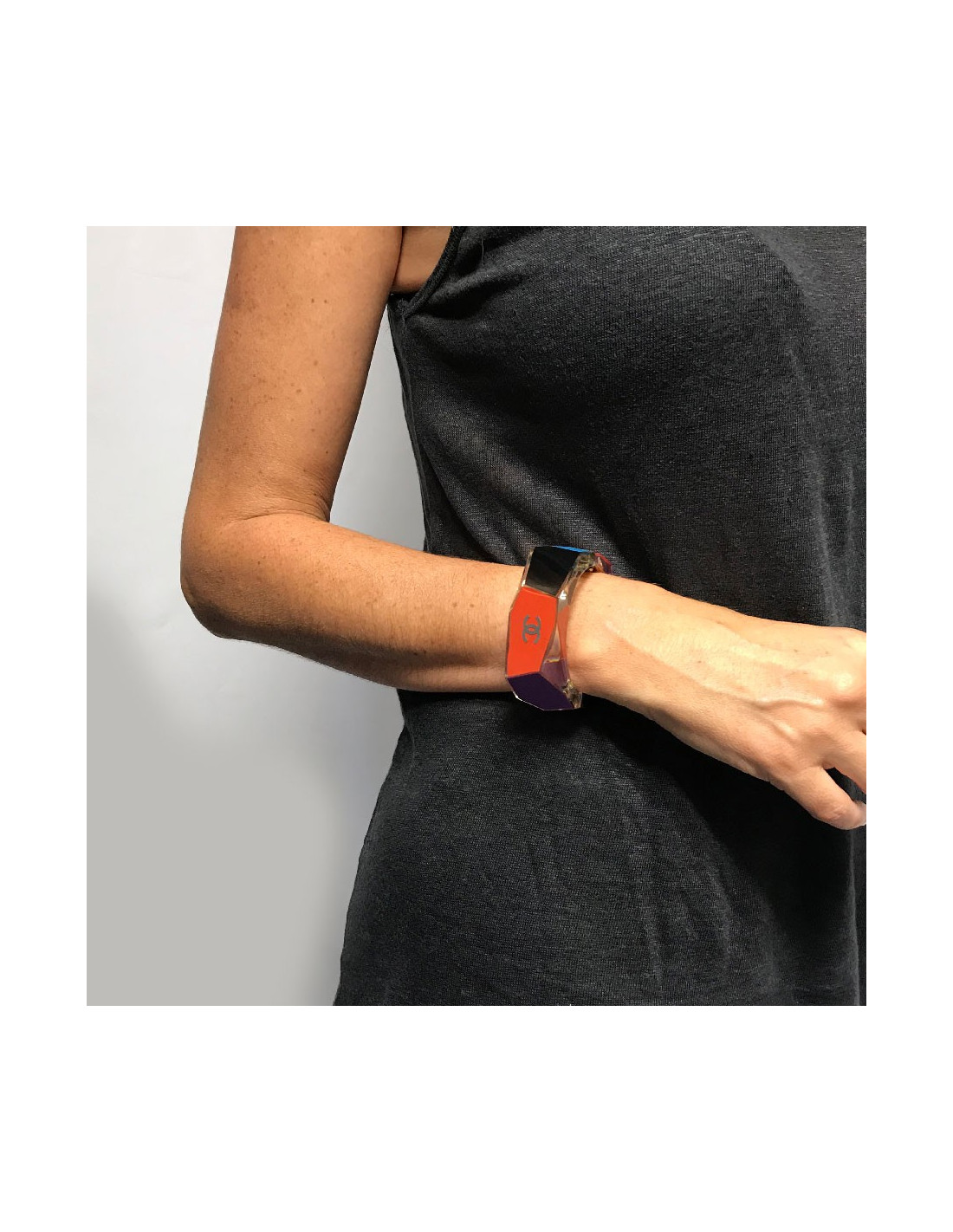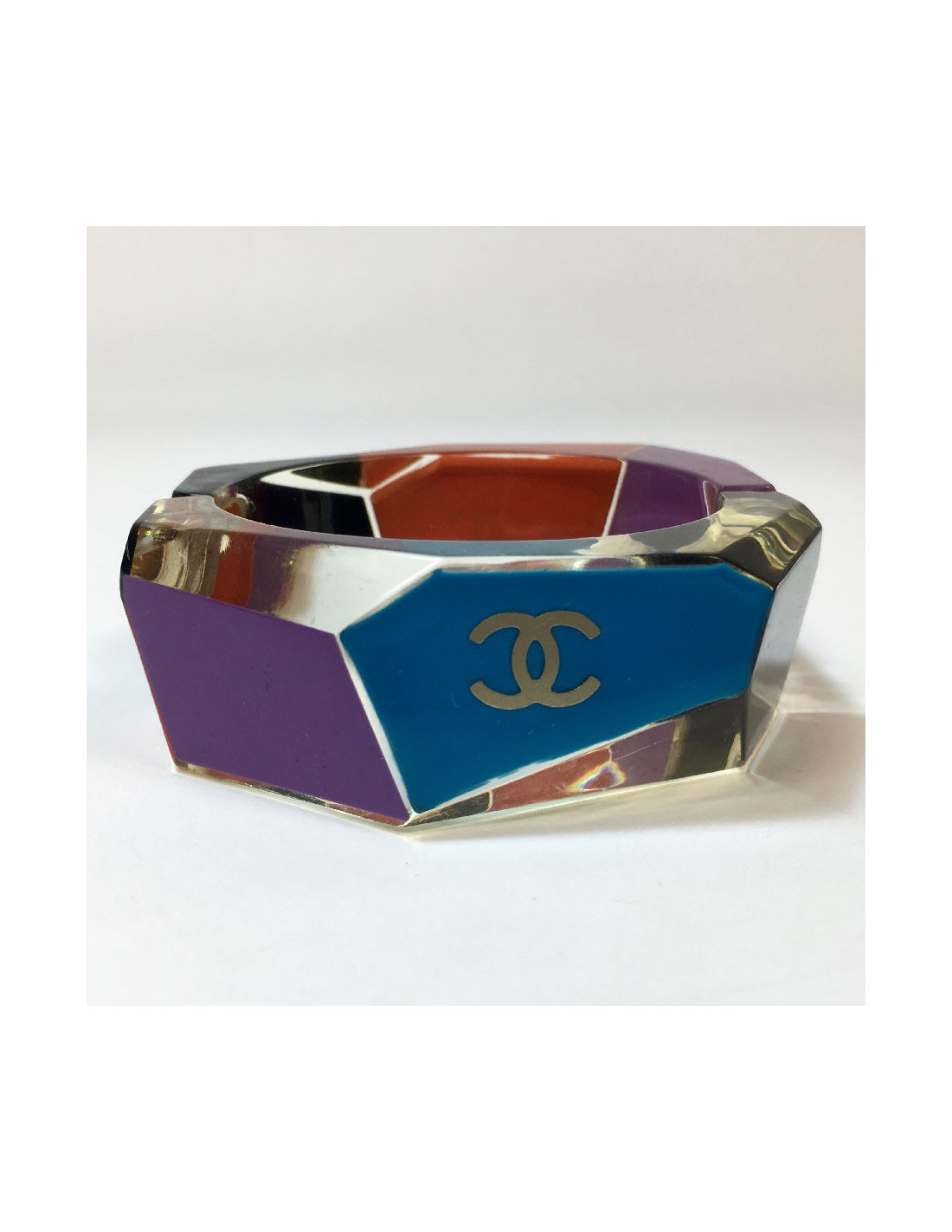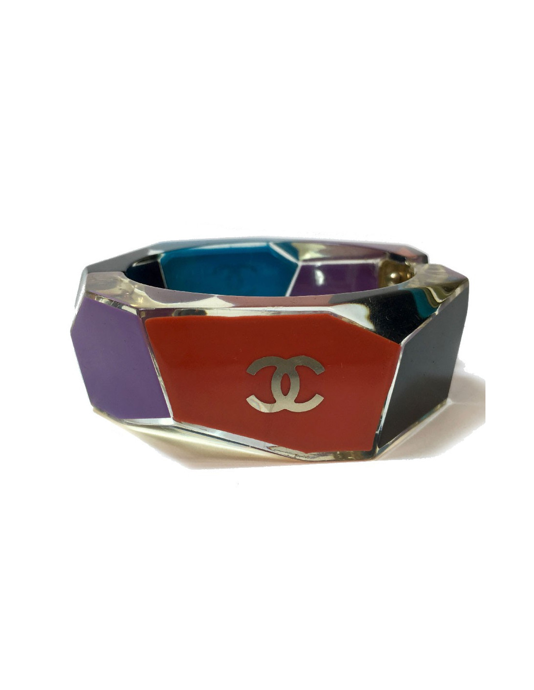Manchette Chanel en plexiglass mauve, corail, noir et bleu. Elle se ferme par un clips sur le côté. La vignette Chanel est à l’intérieur et nous indique que ce bracelet est issu d'une collection Chanel de 2007.