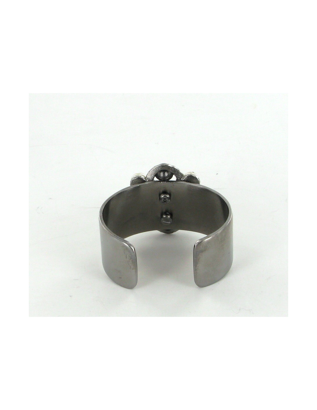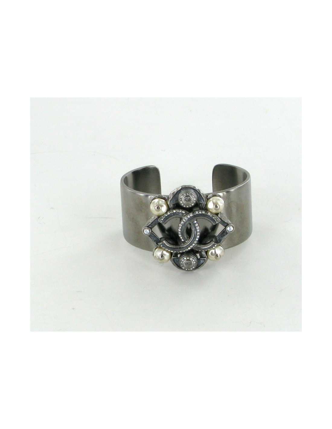 Cette élégante manchette bijou CHANEL est en métal argenté de couleur ruthénium. Le bijou mesurant 4 x 4,5 cm, représente le double CC de CHANEL agrémenté de 4 perles nacrées. Livrée dans un joli pochon.