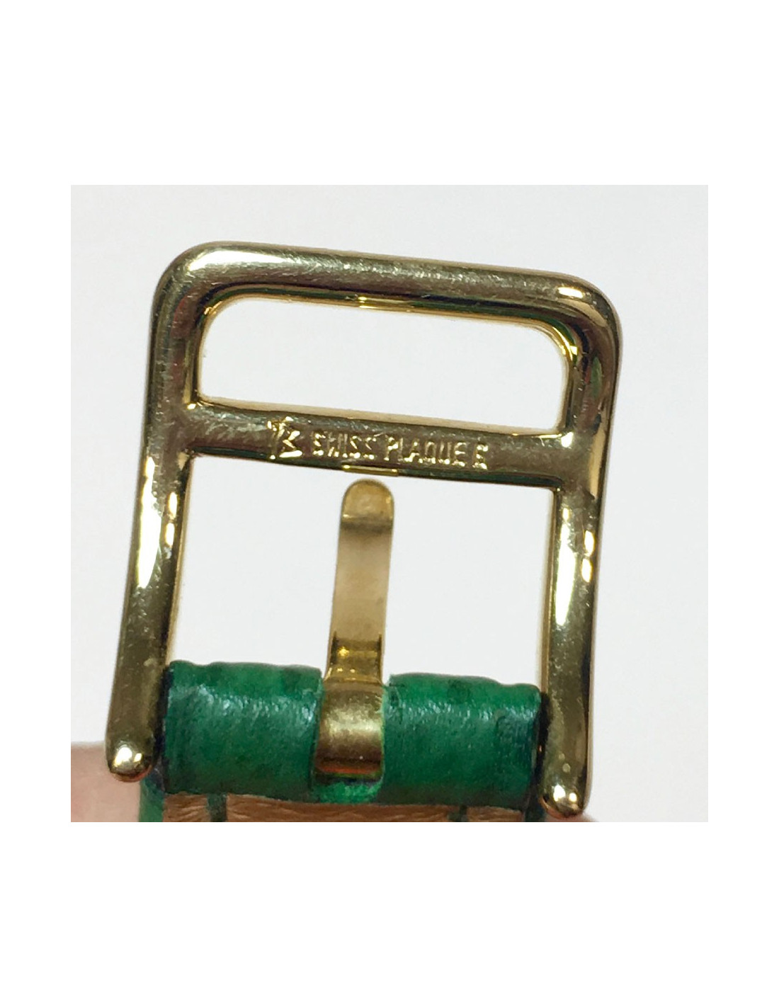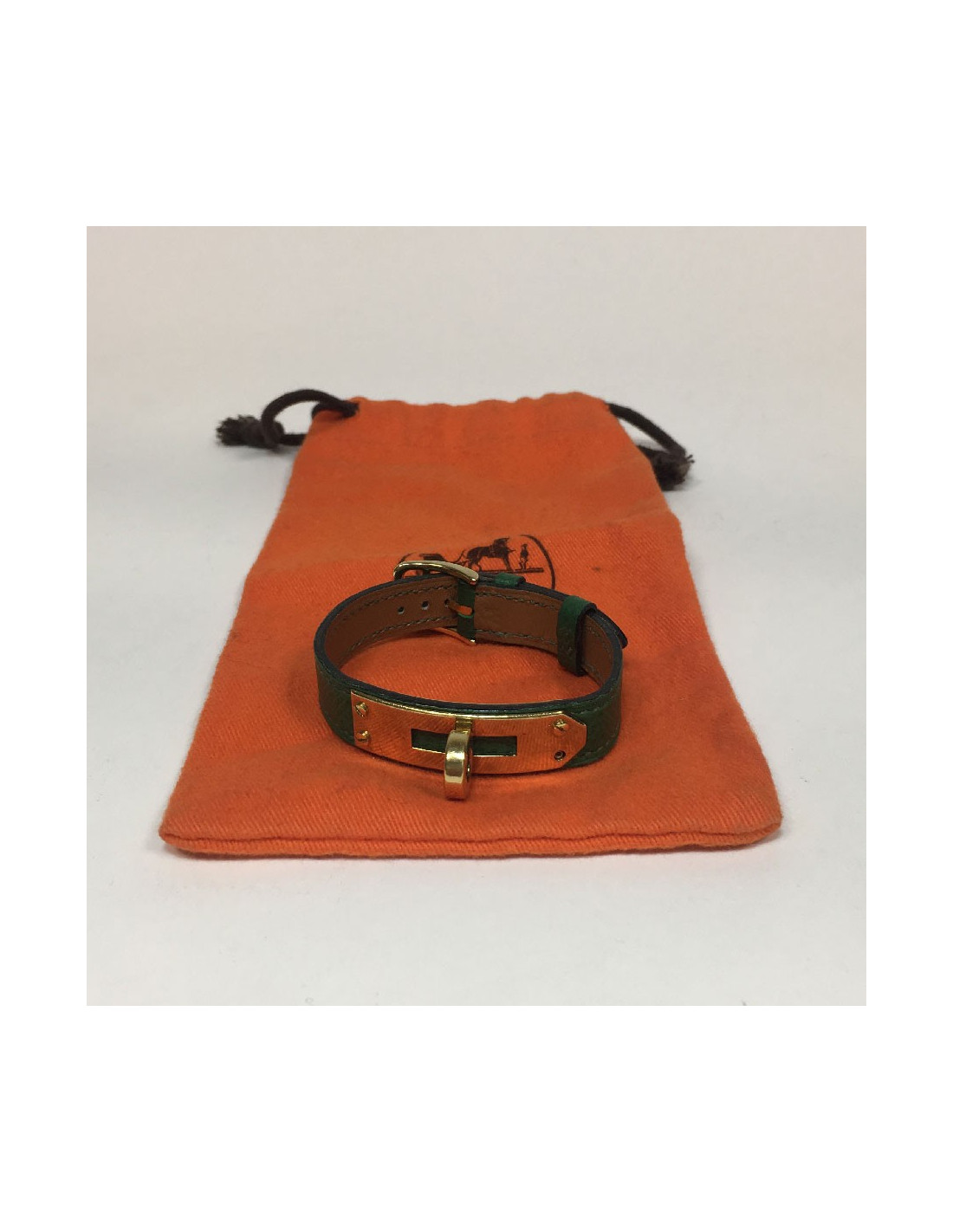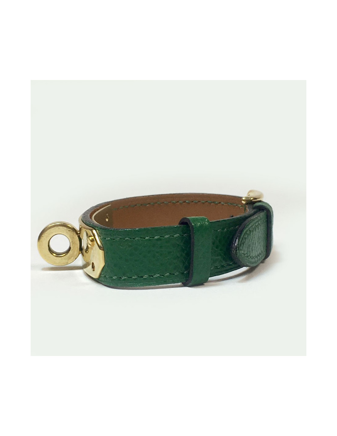 Bracelet Kelly Hermès en cuir epsom vert. Bijouterie dorée.