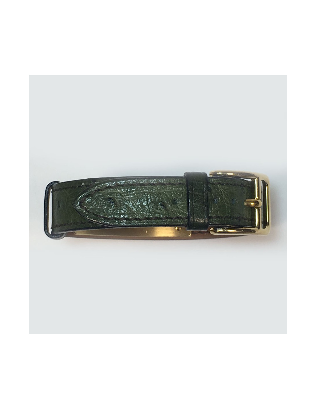 Bracelet Hermès en autruche vert foncé. Bijouterie dorée.