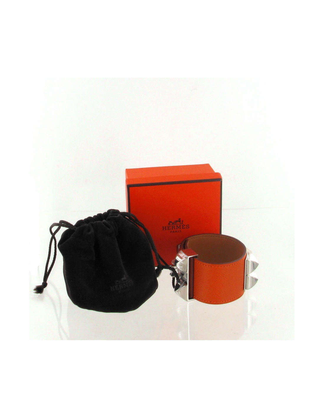 Manchette "Collier de chien" HERMES en cuir epsom orange, fermoir plaqué argenté et palladié. Cette manchette n'a jamais été portée. Trois crans possibles pour la fermer (taille unique). Lettre P. Livré avec sa boîte, son pochon d'origine, son ruban, son paquet et la facture.