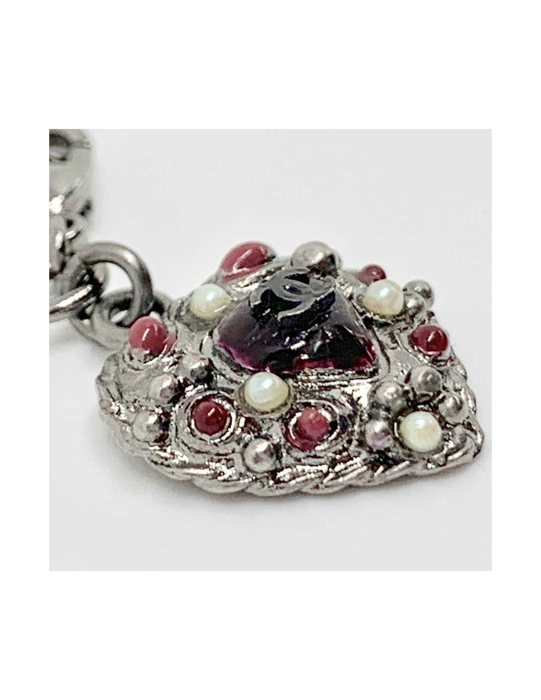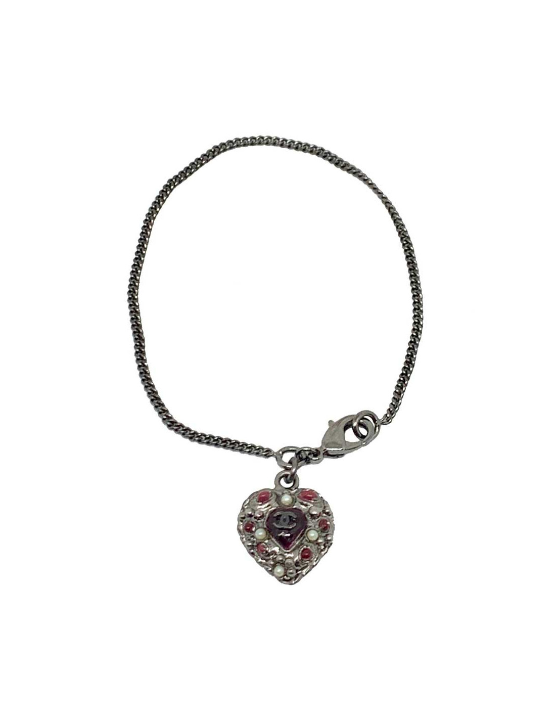 Bracelet à fine chaine ruthénium et charm coeur de la Maison CHANEL. Le coeur est serti de fines perles nacrées et de résine de couleur bordeaux. Un CC en métal se trouve au centre du coeur.