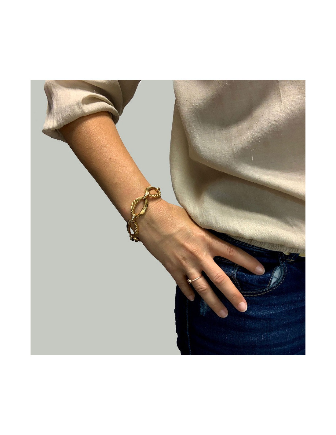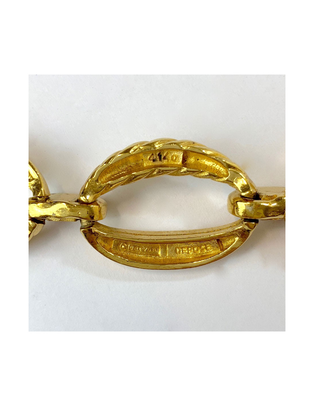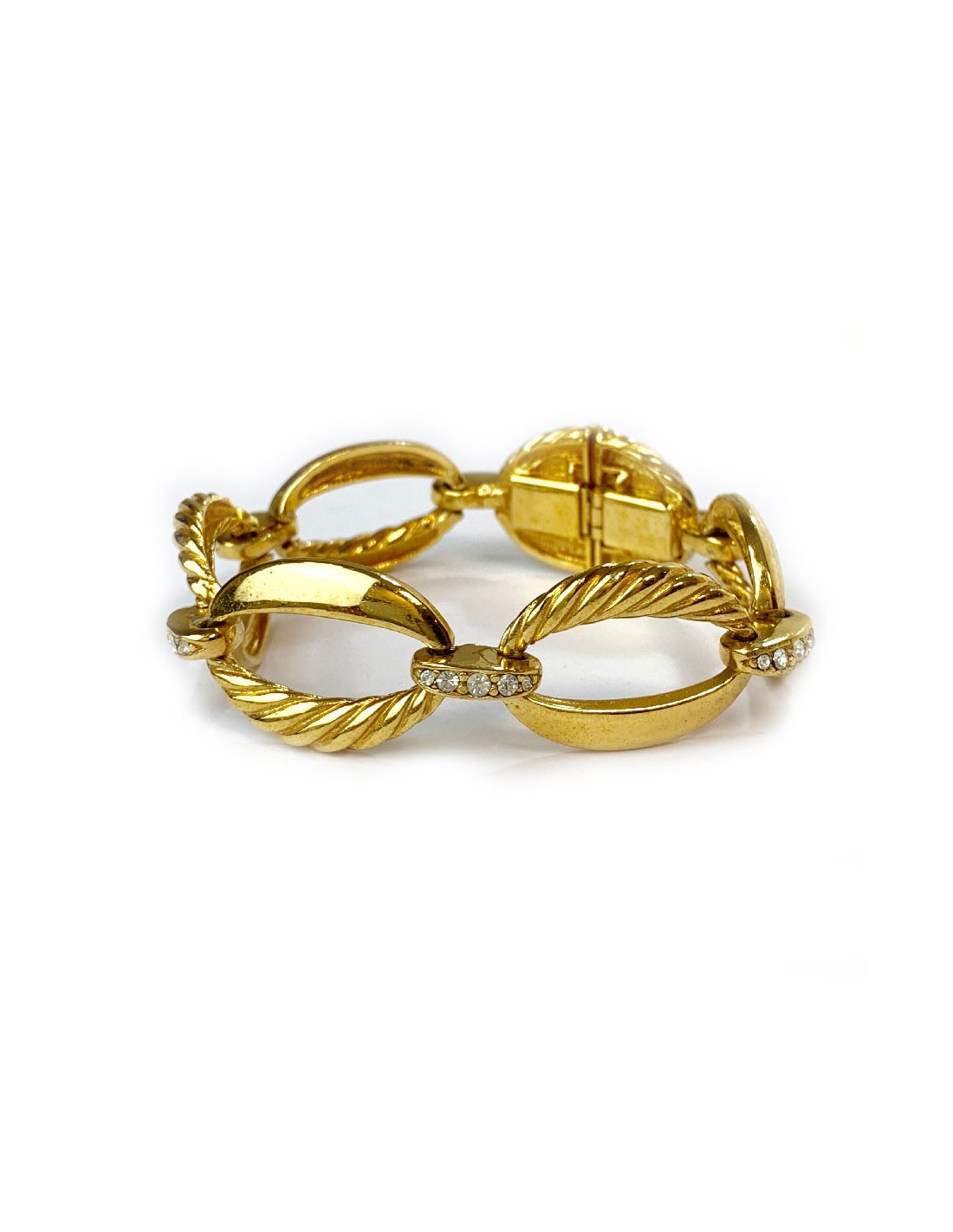 Bracelet Carven, chaîne à anneaux en métal doré. Le métal doré est de 2 textures, lisse et torsadé, serti sur quelques anneaux de strass. Il est numéroté 4140.