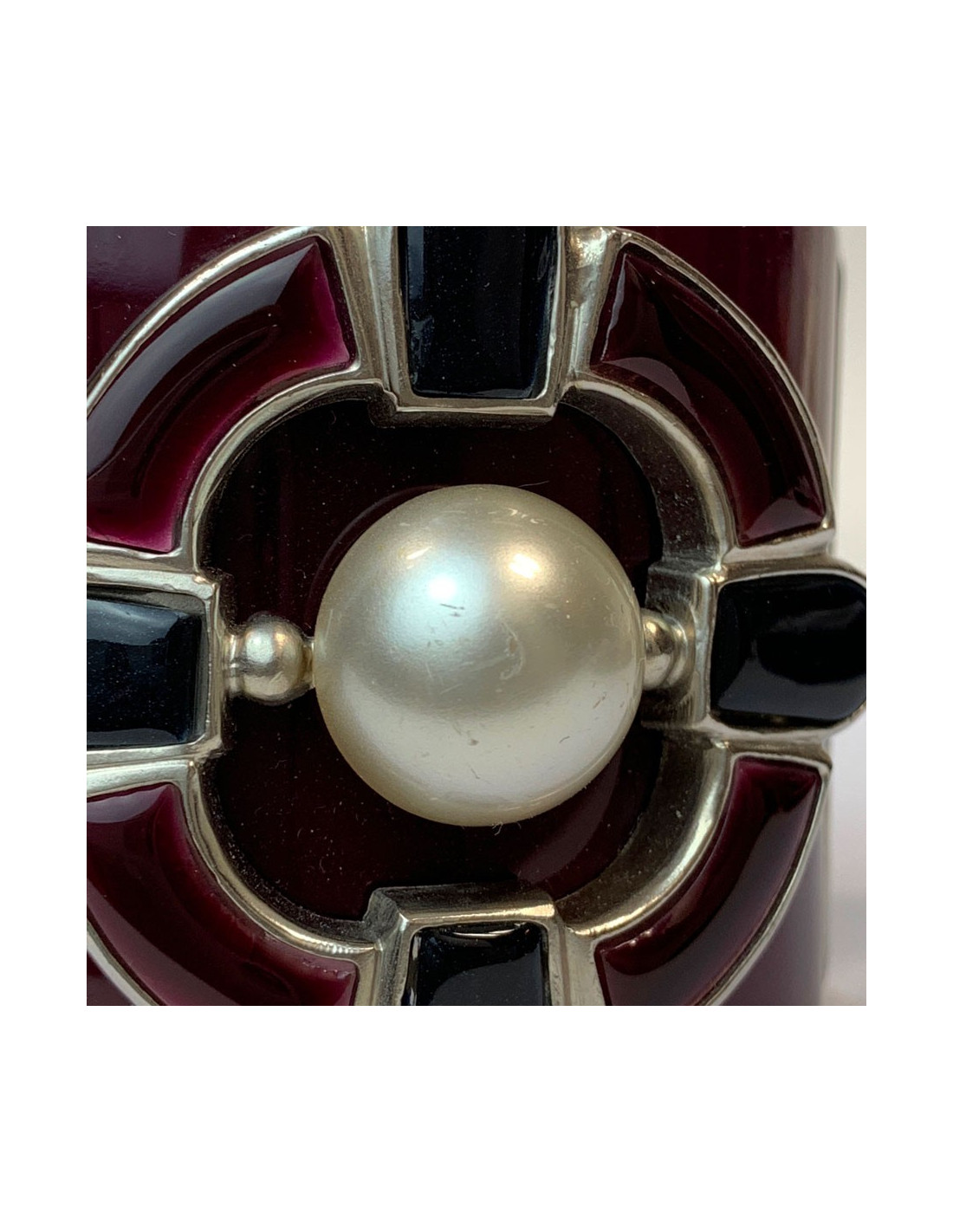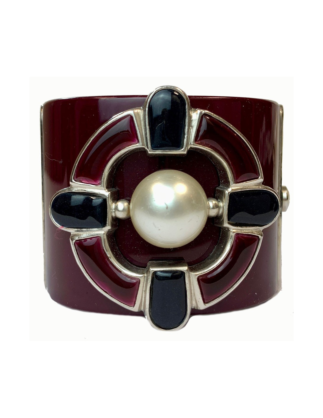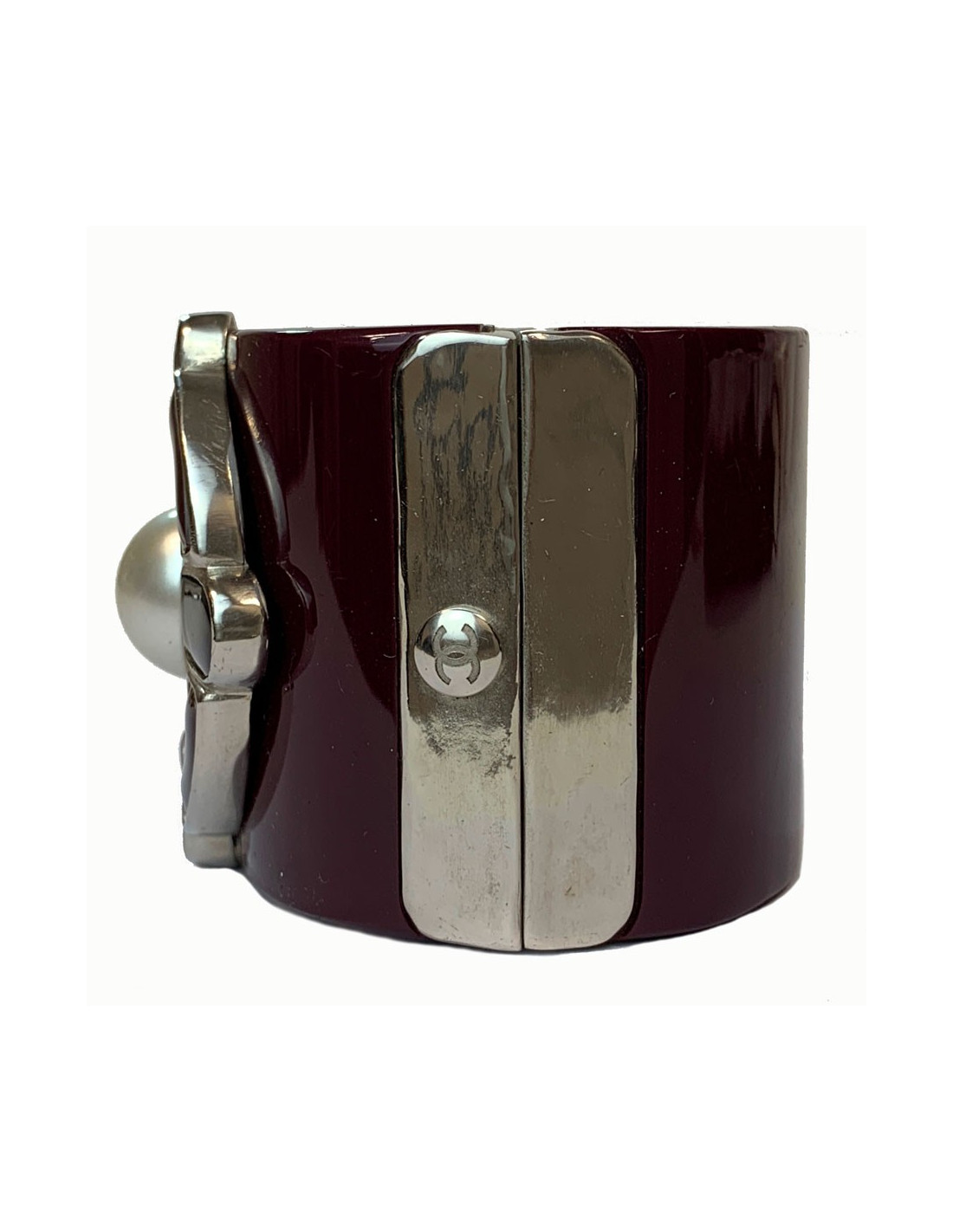 Couture! Cette manchette CHANEL en plexiglass violet est belle. Agrémentée d'une pièce en métal doré sertie de résine violette et d'une perle nacrée au centre. La bijouterie est en métal argenté.