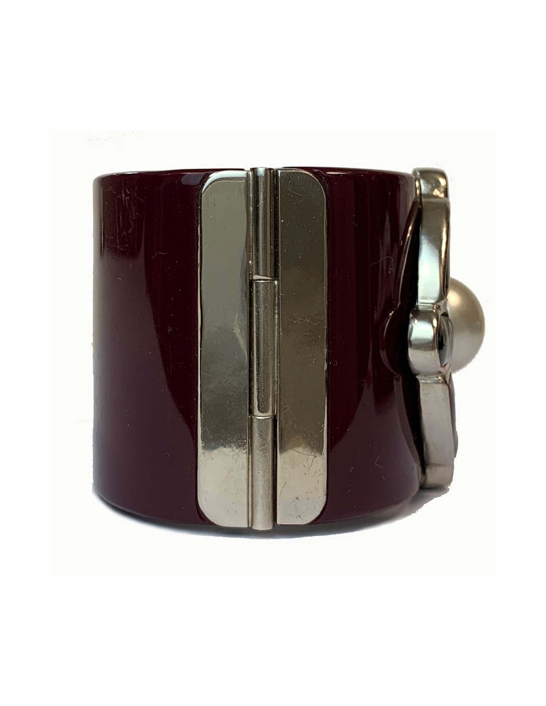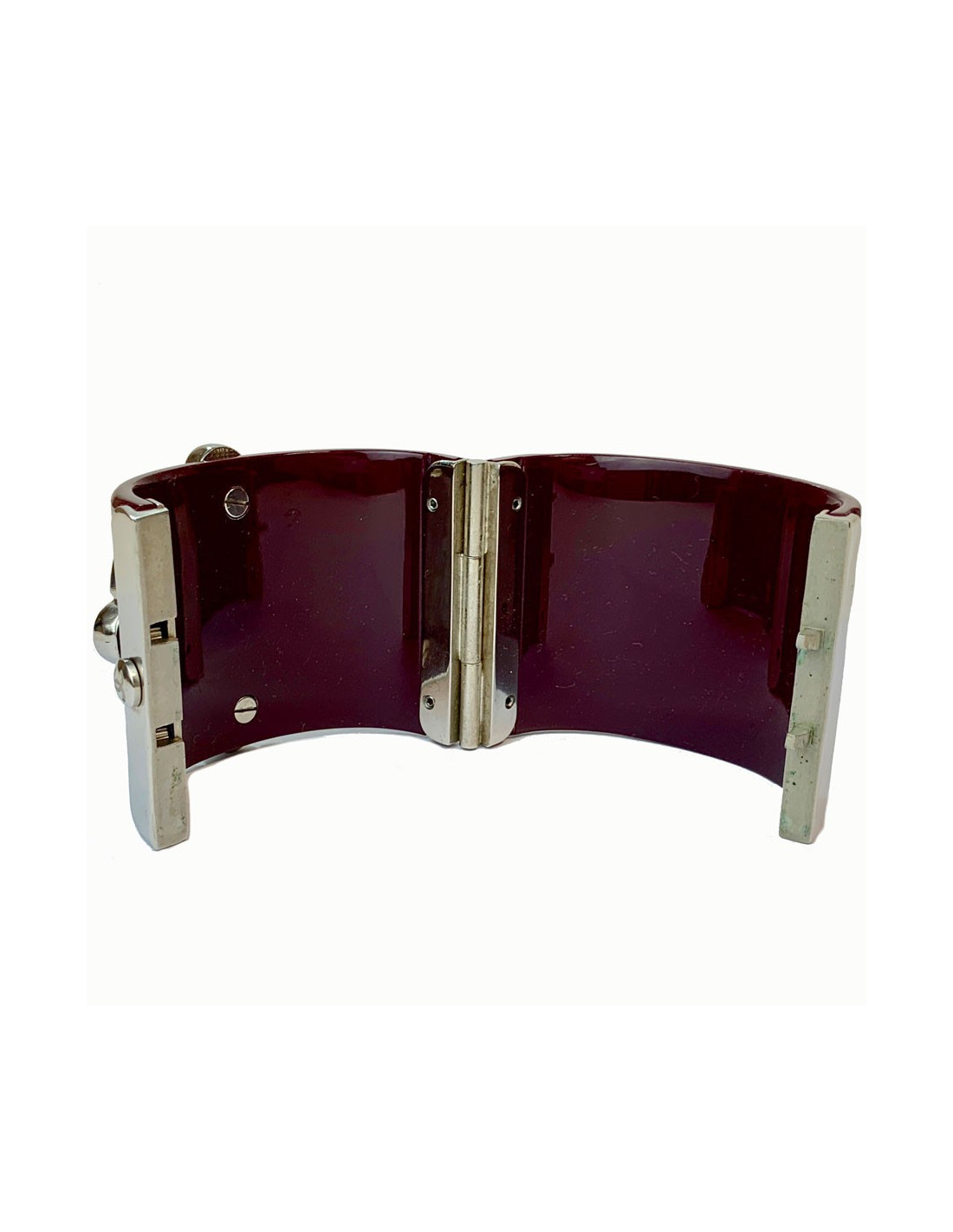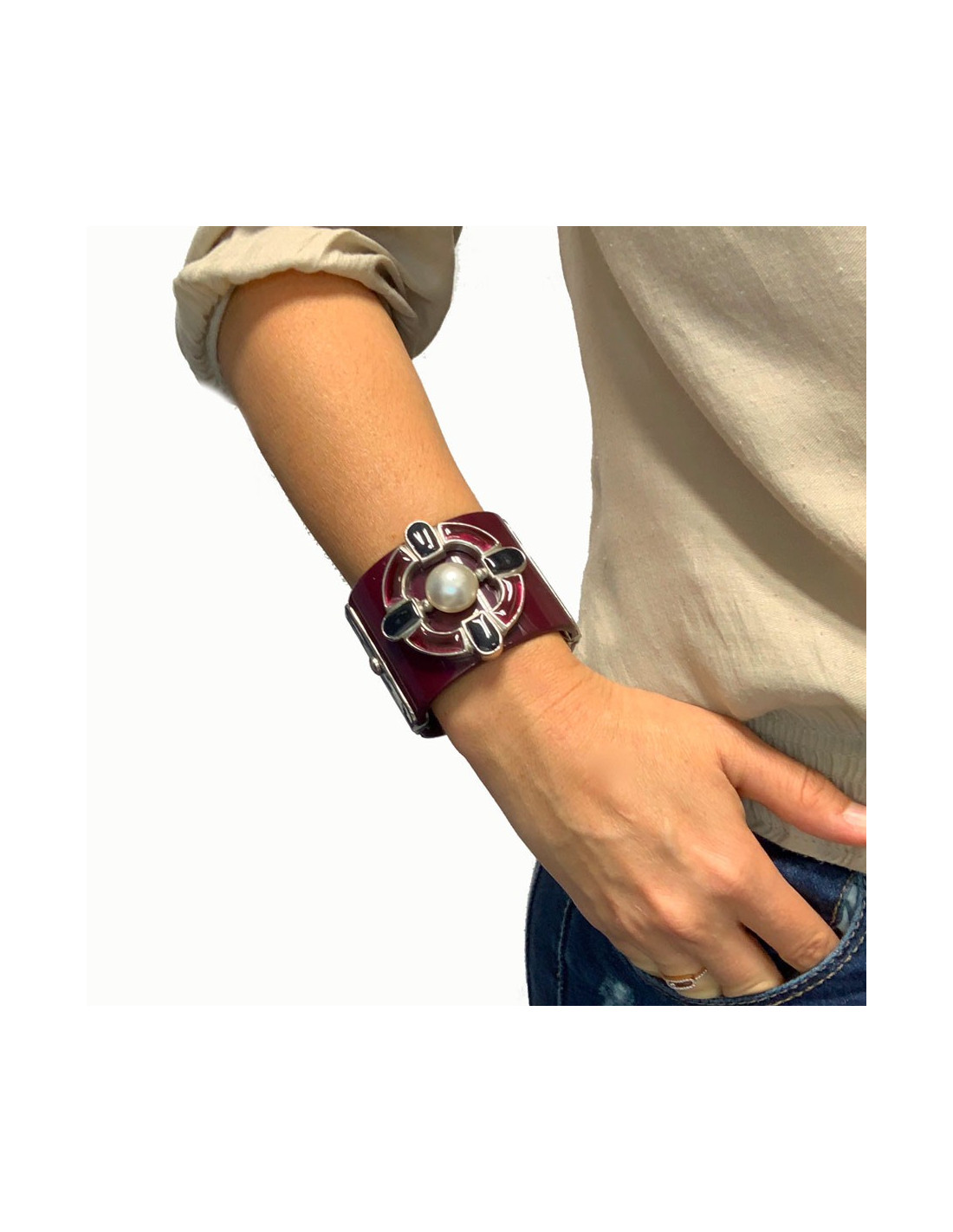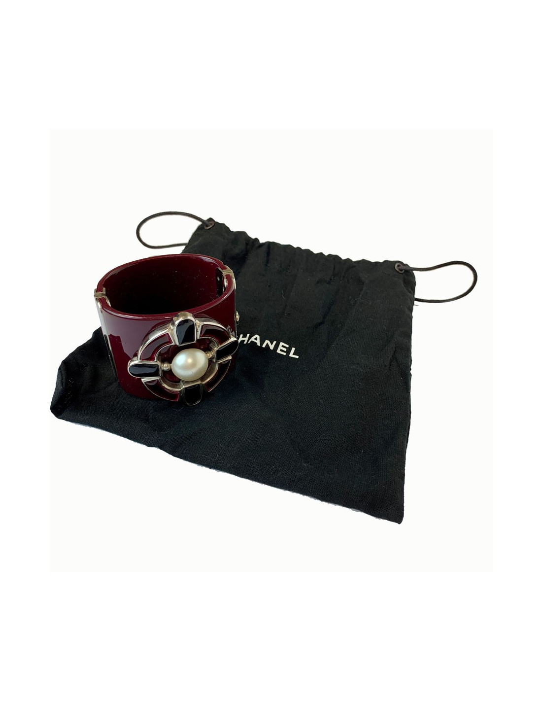 Couture! Cette manchette CHANEL en plexiglass violet est belle. Agrémentée d'une pièce en métal doré sertie de résine violette et d'une perle nacrée au centre. La bijouterie est en métal argenté.