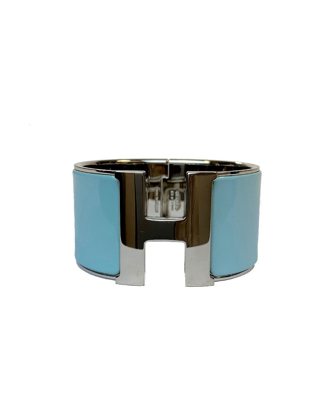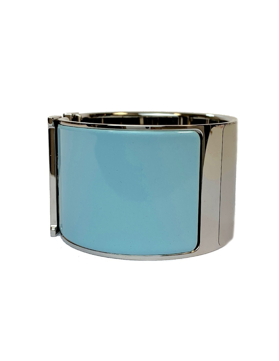 Manchette Hermès émail bleu glacier modèle Clic H, en taille XL. Finition palladium. La manchette est dans un état parfait. Elle porte la mention Made in France.