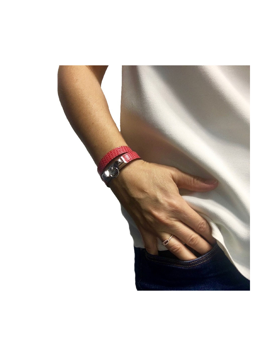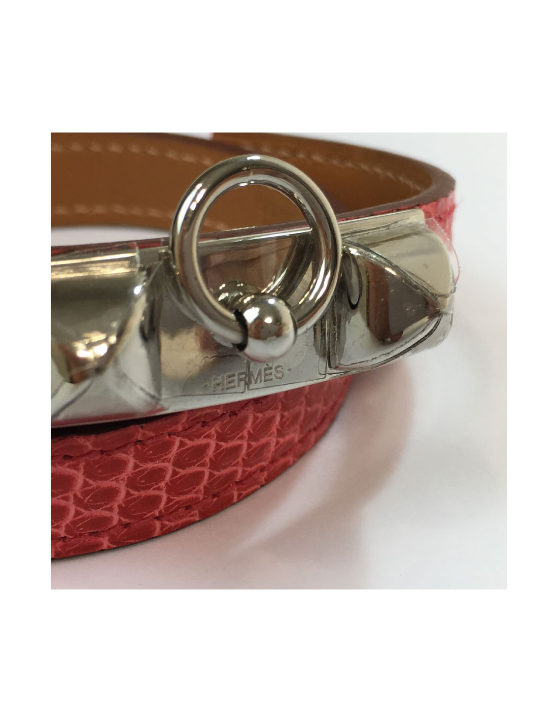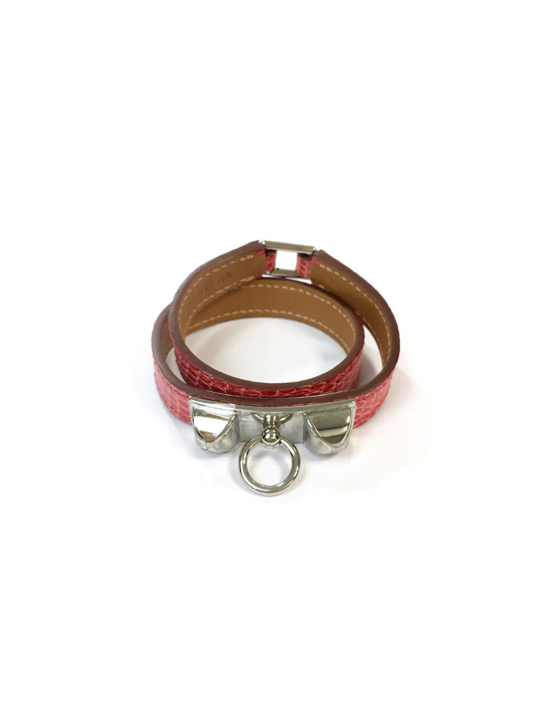 Bracelet Hermès Rivale double tour en cuir lézard lisse couleur bougainvillier. Bijouterie en métal palladié.