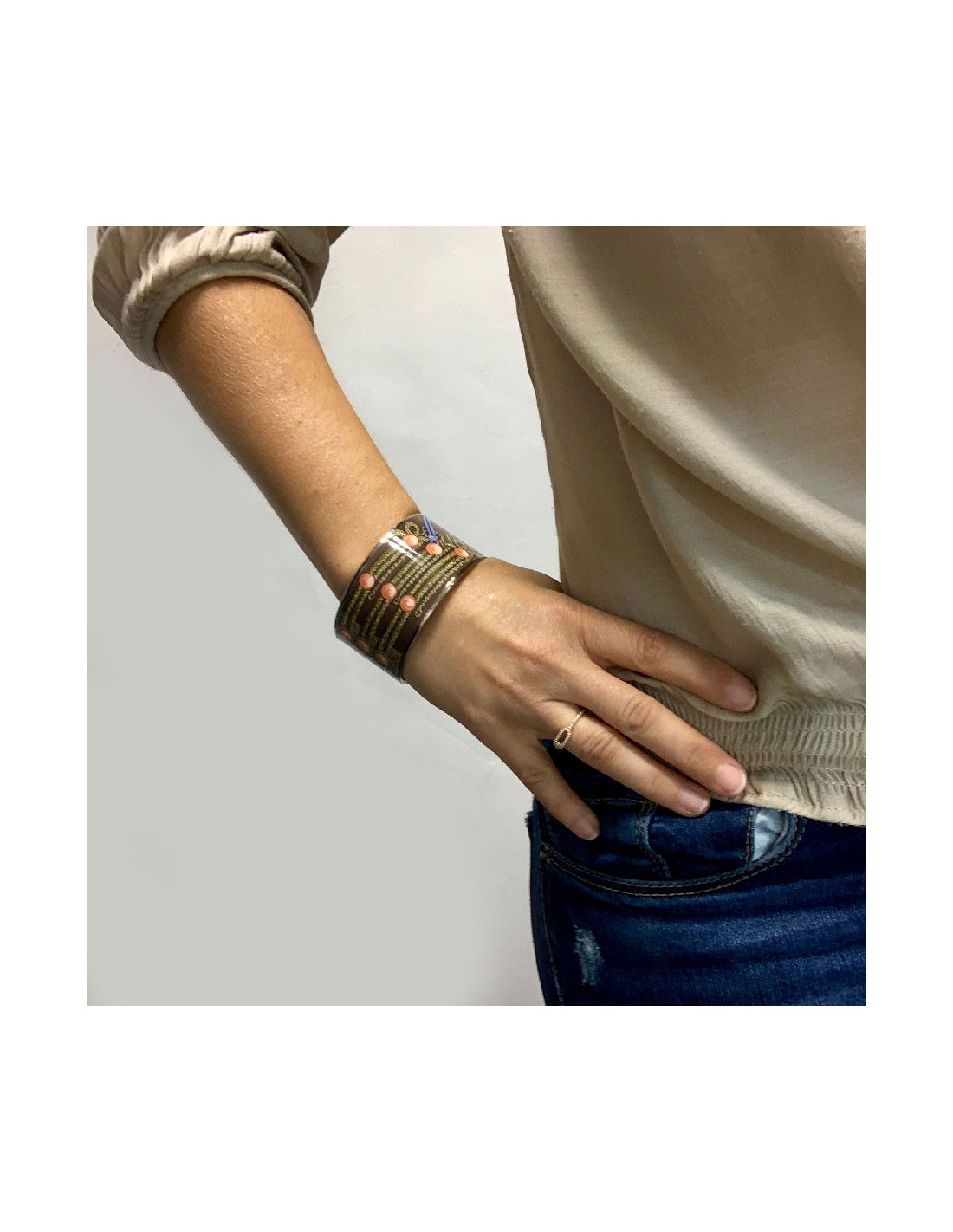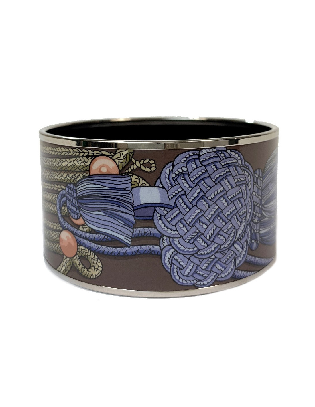 Superbe bracelet de la maison HERMES, modèle 'Brandebourg', grand modèle. Il est en émail marron, bleu et corail, avec une finition palladié.