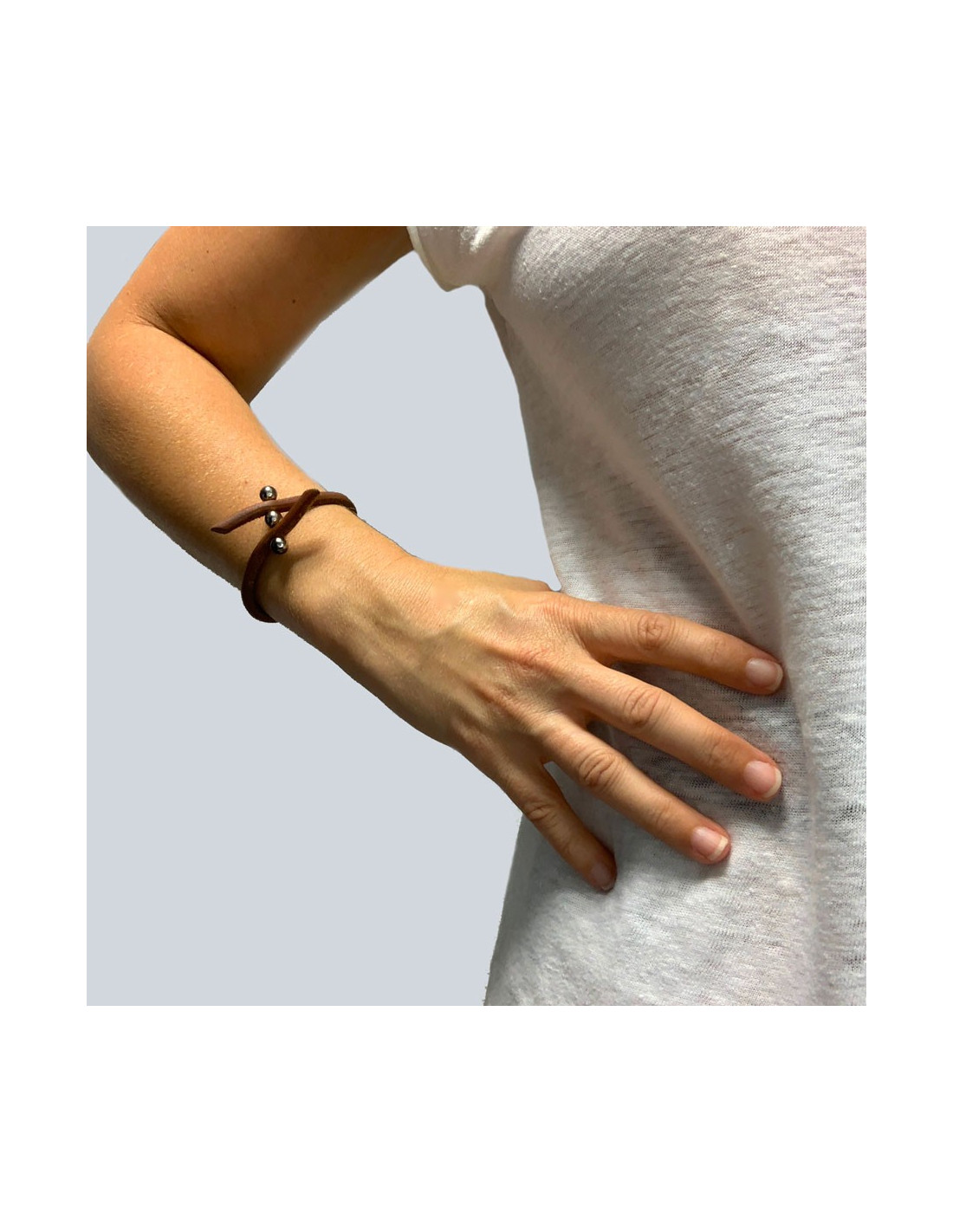 Bracelet HERMES original, en cuir marron et bijouterie argentée. Il suffit de dévisser une des boules argentées pour ouvrir le bijou.