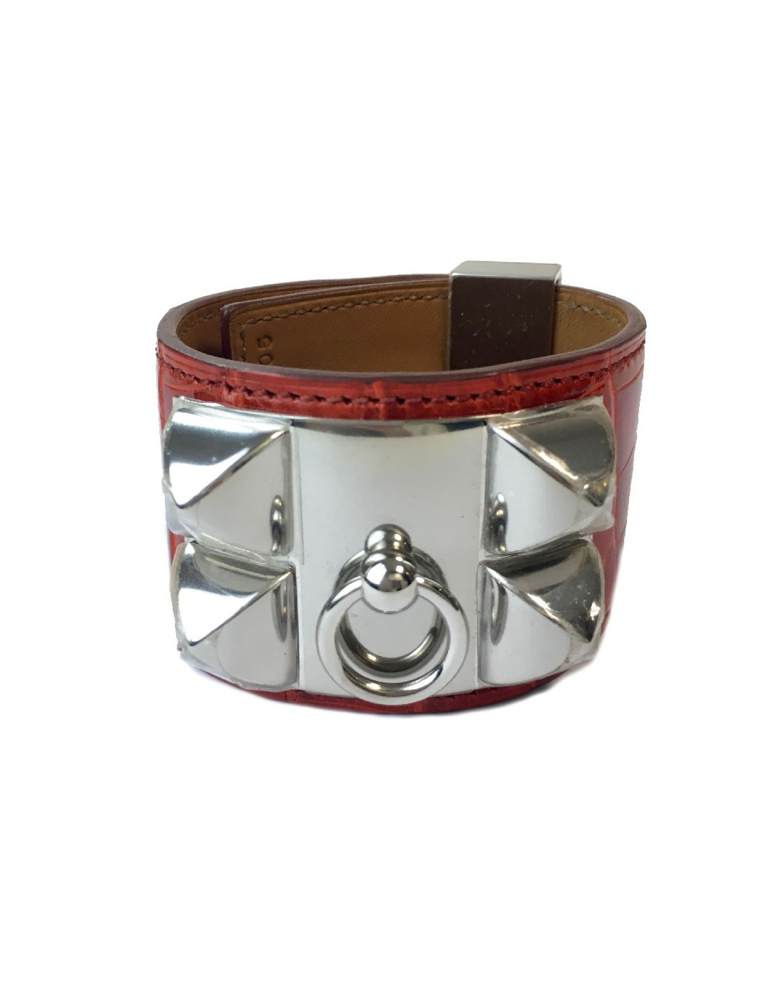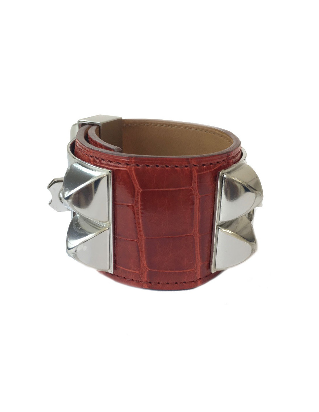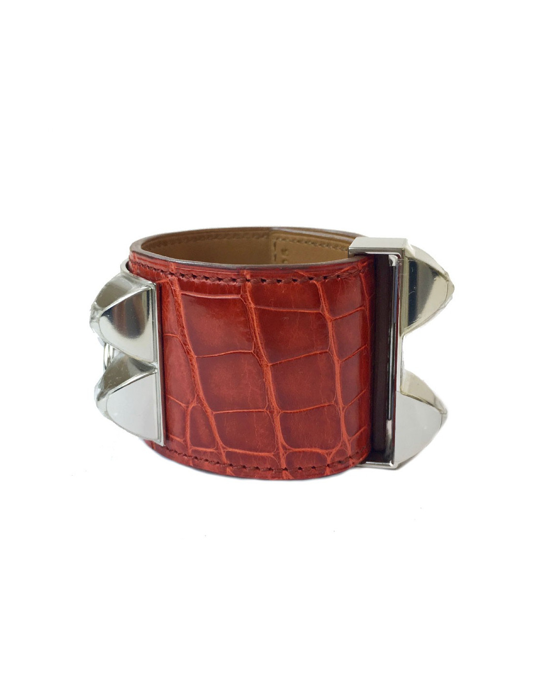 Manchette Médor HERMES en crocodile orange et bijouterie dorée