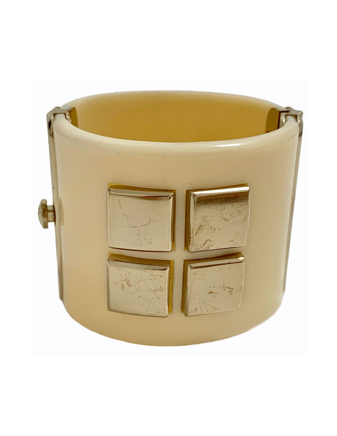 Cette manchette de la maison CHANEL est en plexiglass ivoire décorée de 4 carrés en métal doré. Le fermoir est un fermoir poussoir sur lequel un CC est gravé.