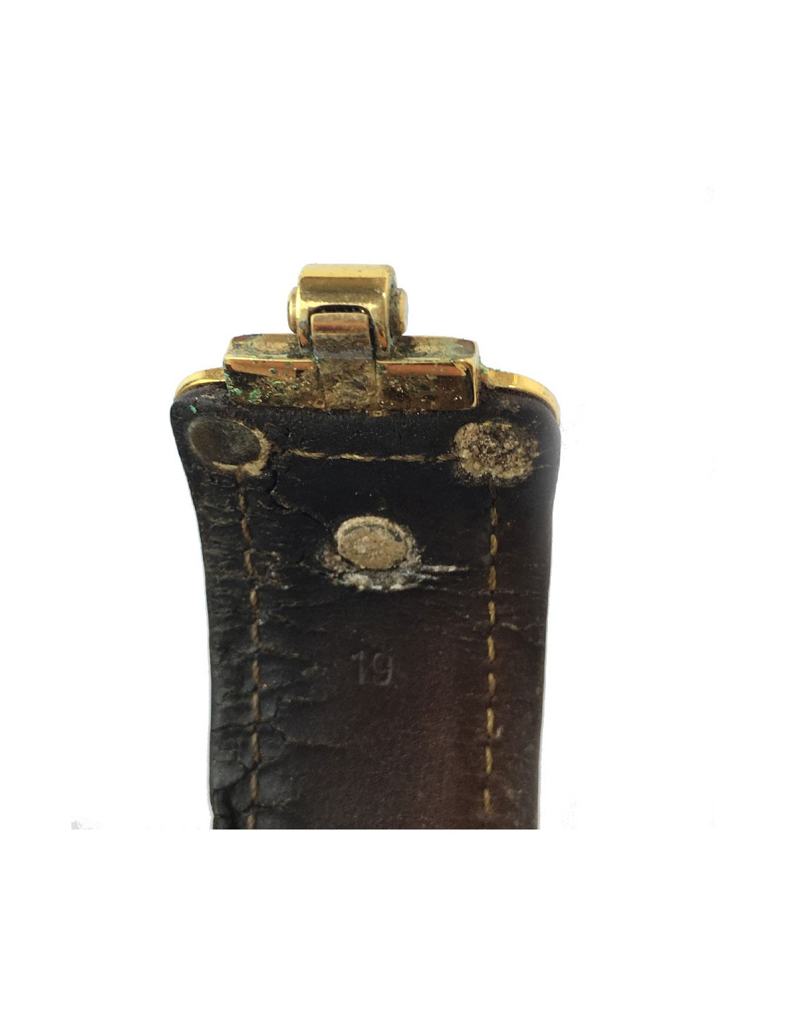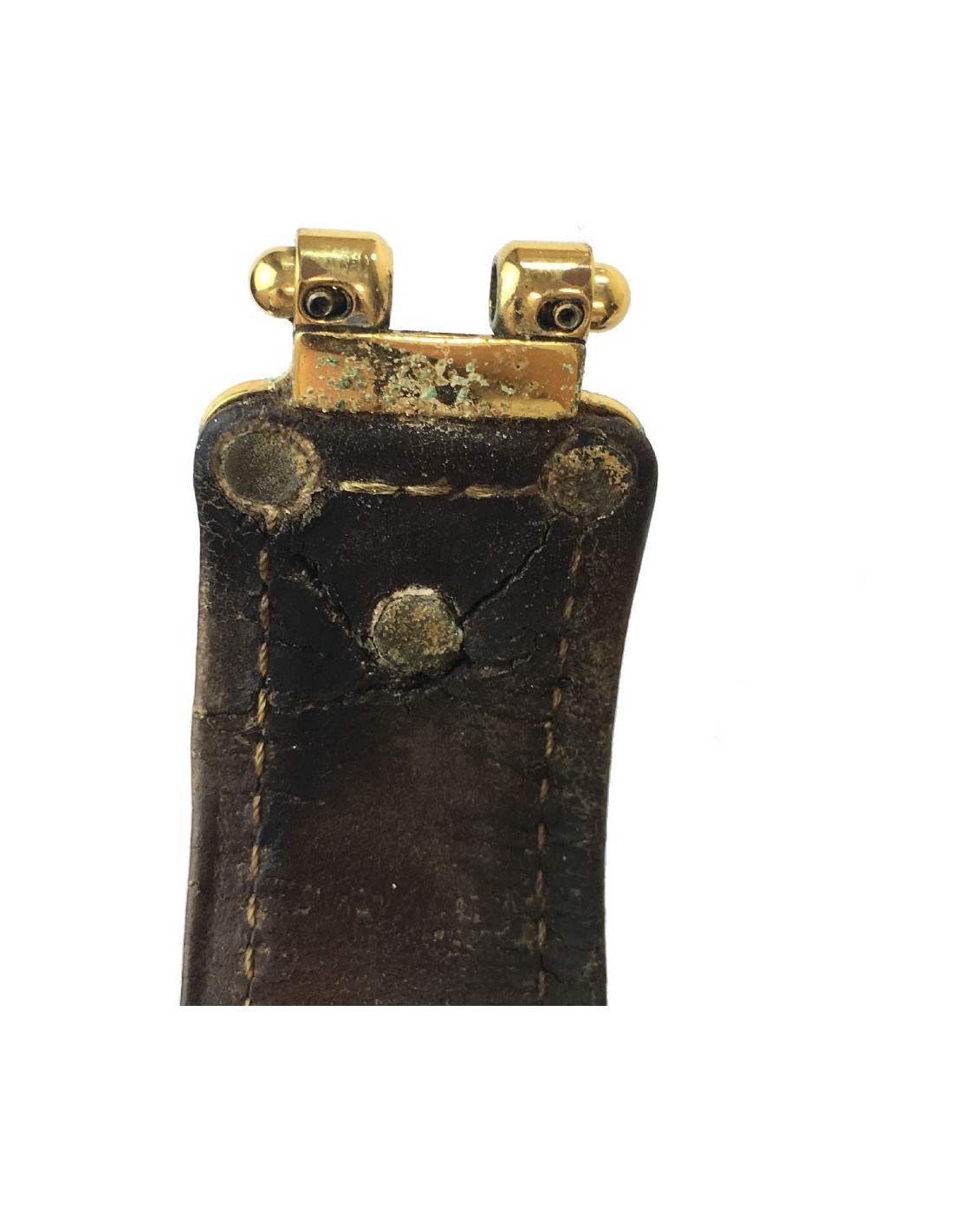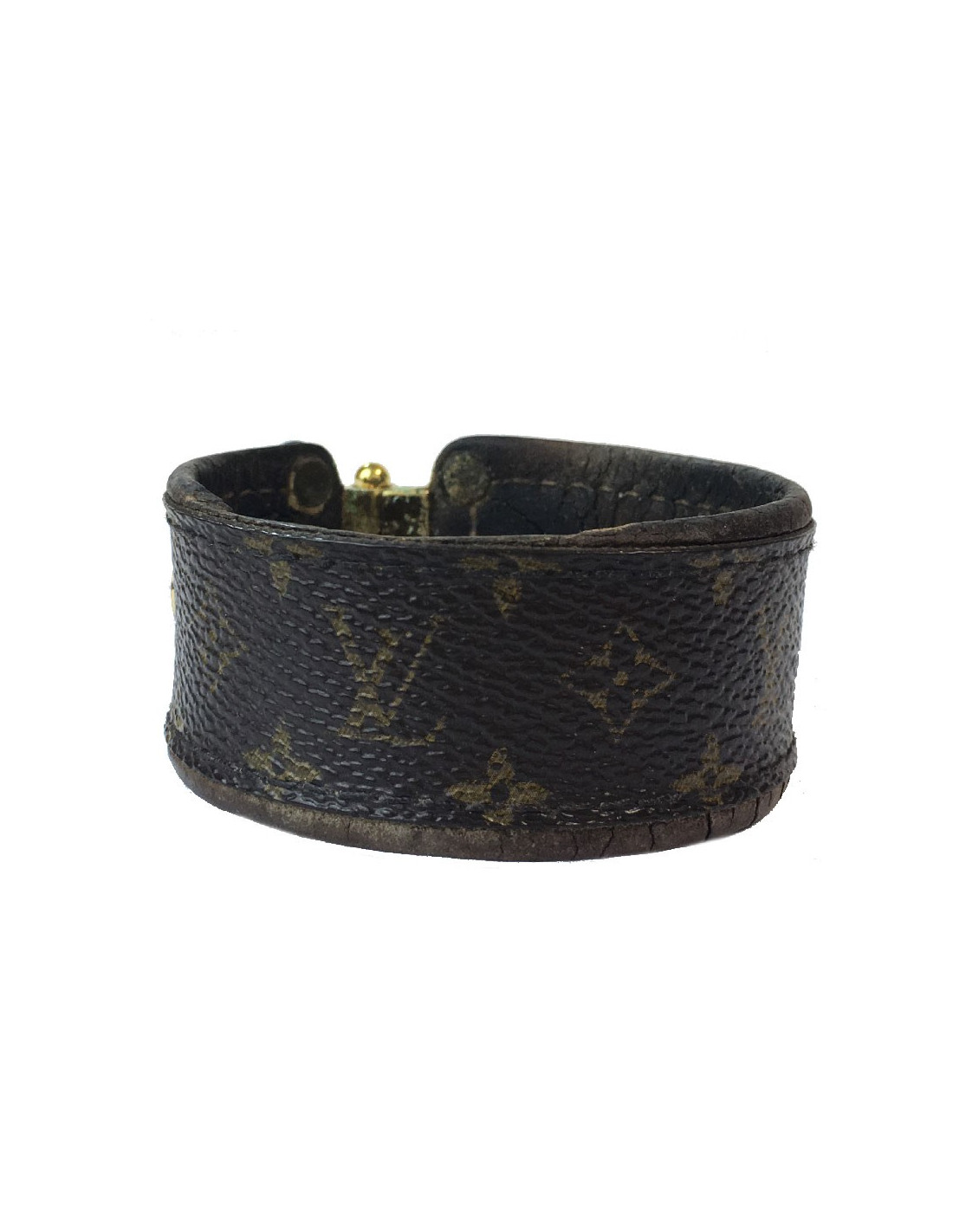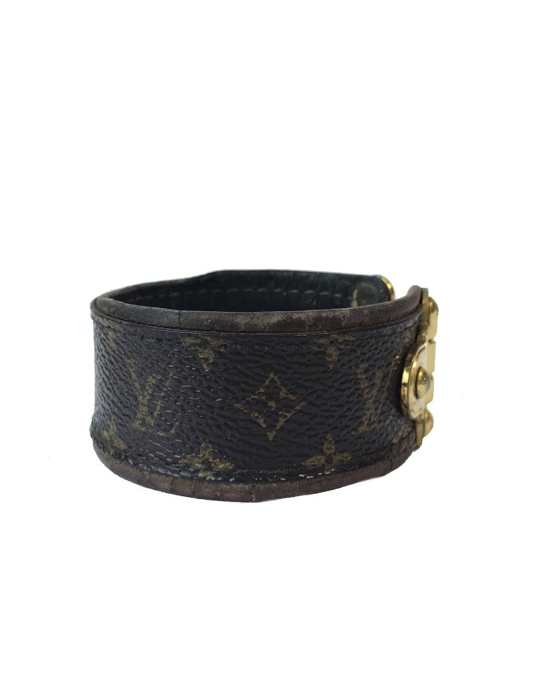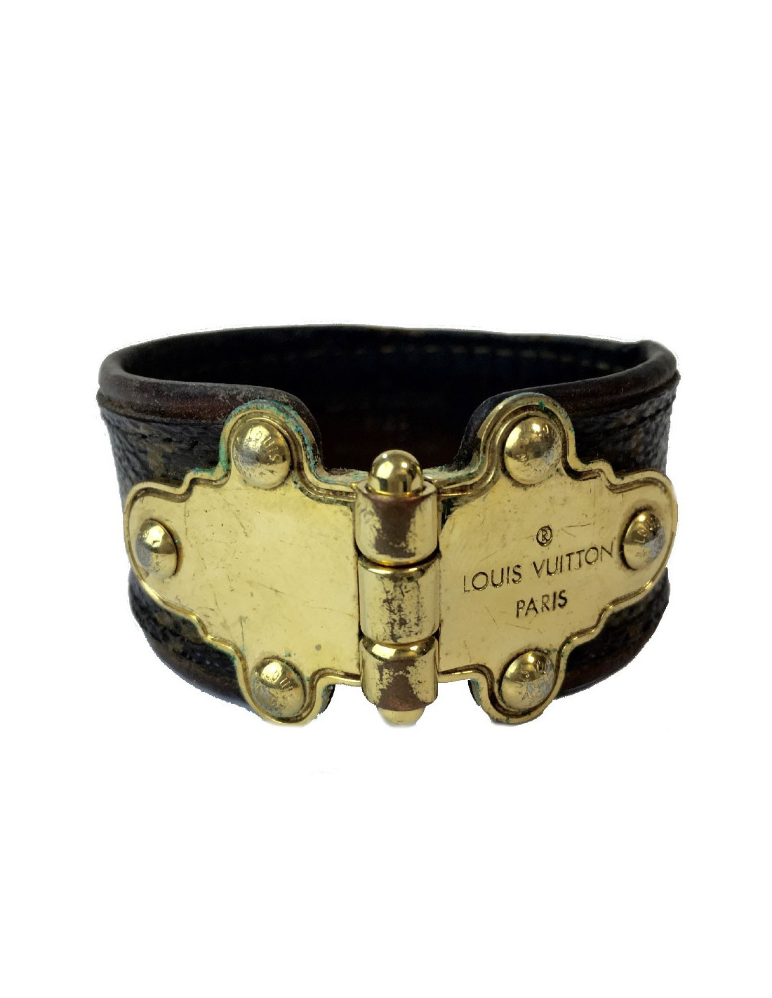 Ce bracelet Louis Vuitton est en toile Monogram marron. Il est doublé de cuir. La bijouterie est en métal dorée. Il est en état correct, le cuir craquèle à l'intérieur (voir photo). Usure dû à l'usage.