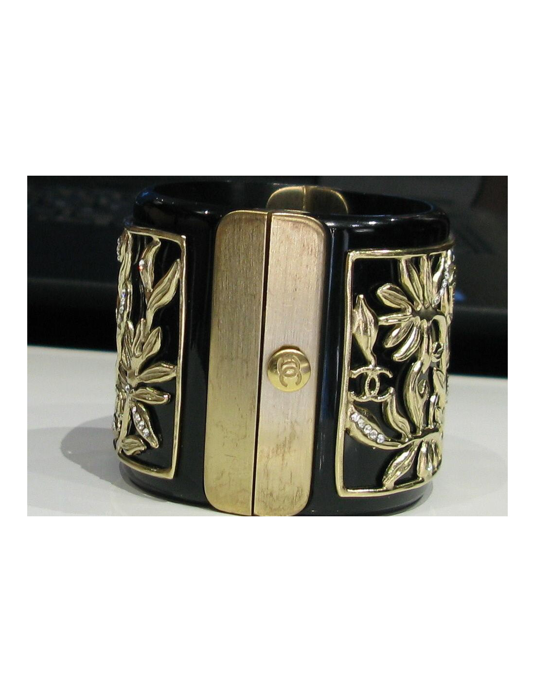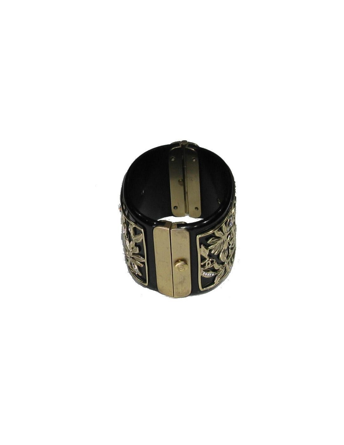 Cette manchette exceptionnelle, de la très réputée Maison CHANEL est en résine noire et en métal couleur or pâle. Elle est ornée de branchages strassés en métal doré de couleur or pâle. Le fermoir siglé "CC" est aimanté. Très bon état. Livrée avec une boîte et son pochon.