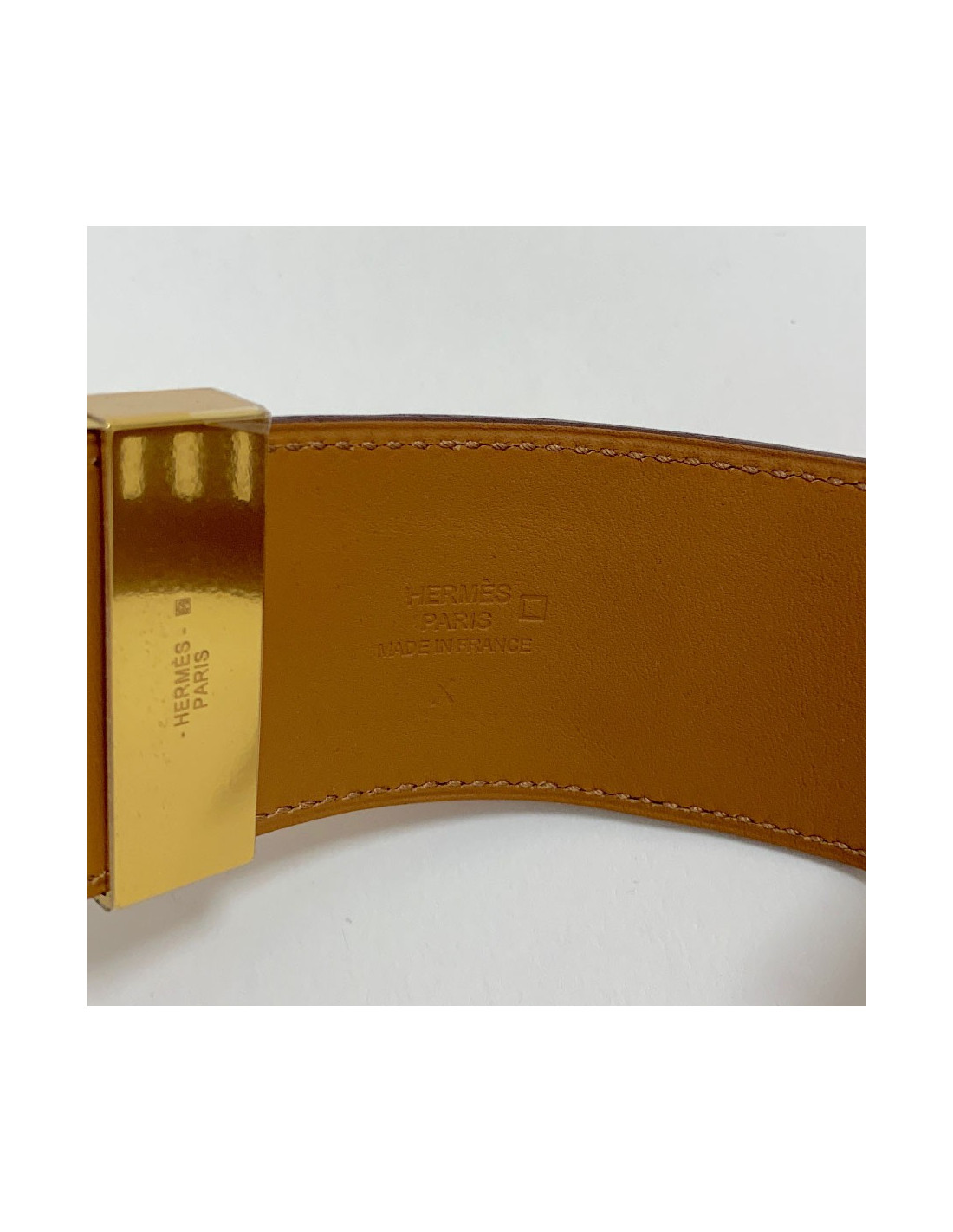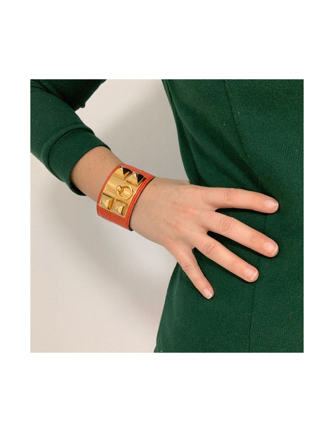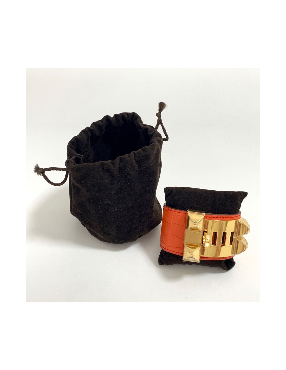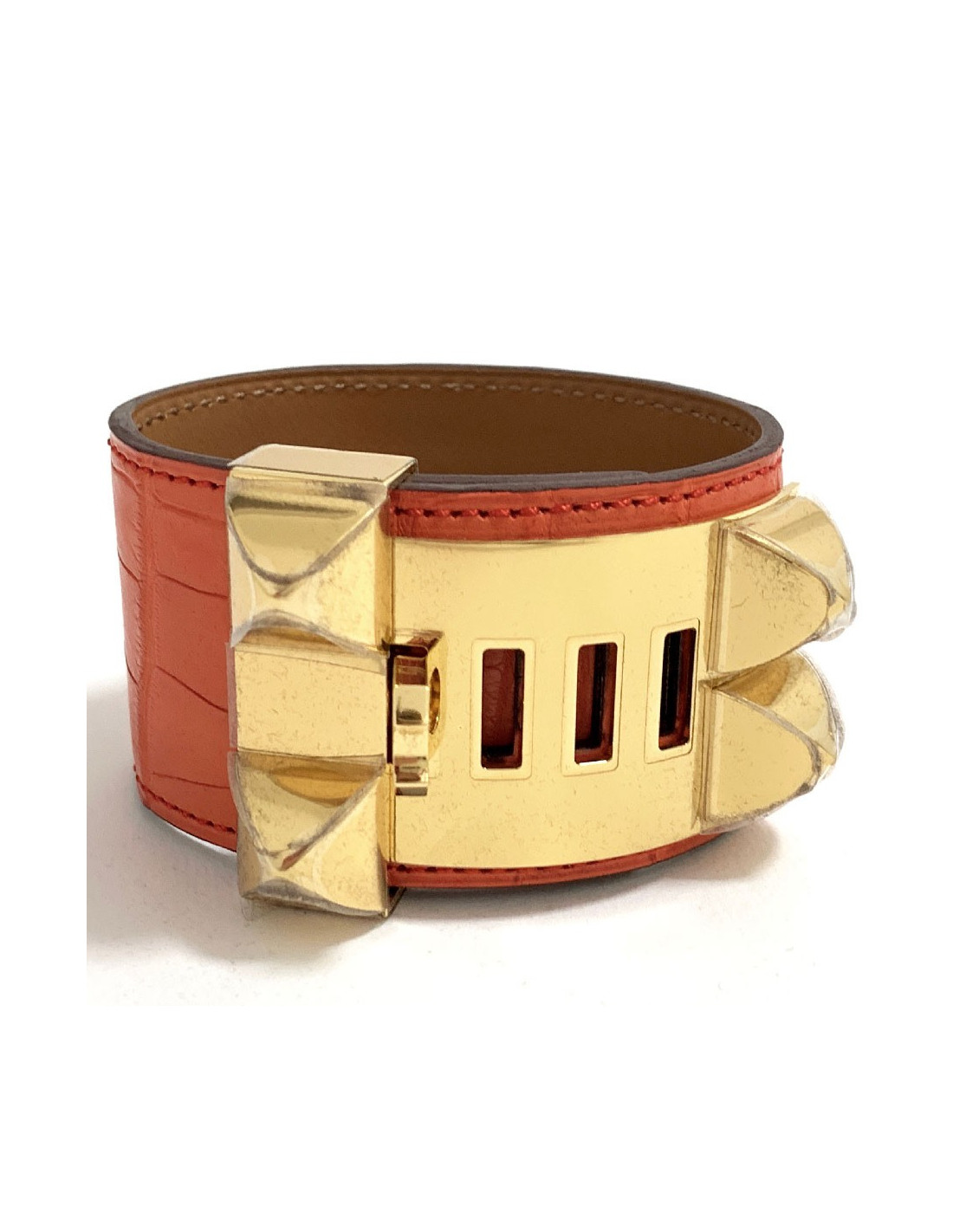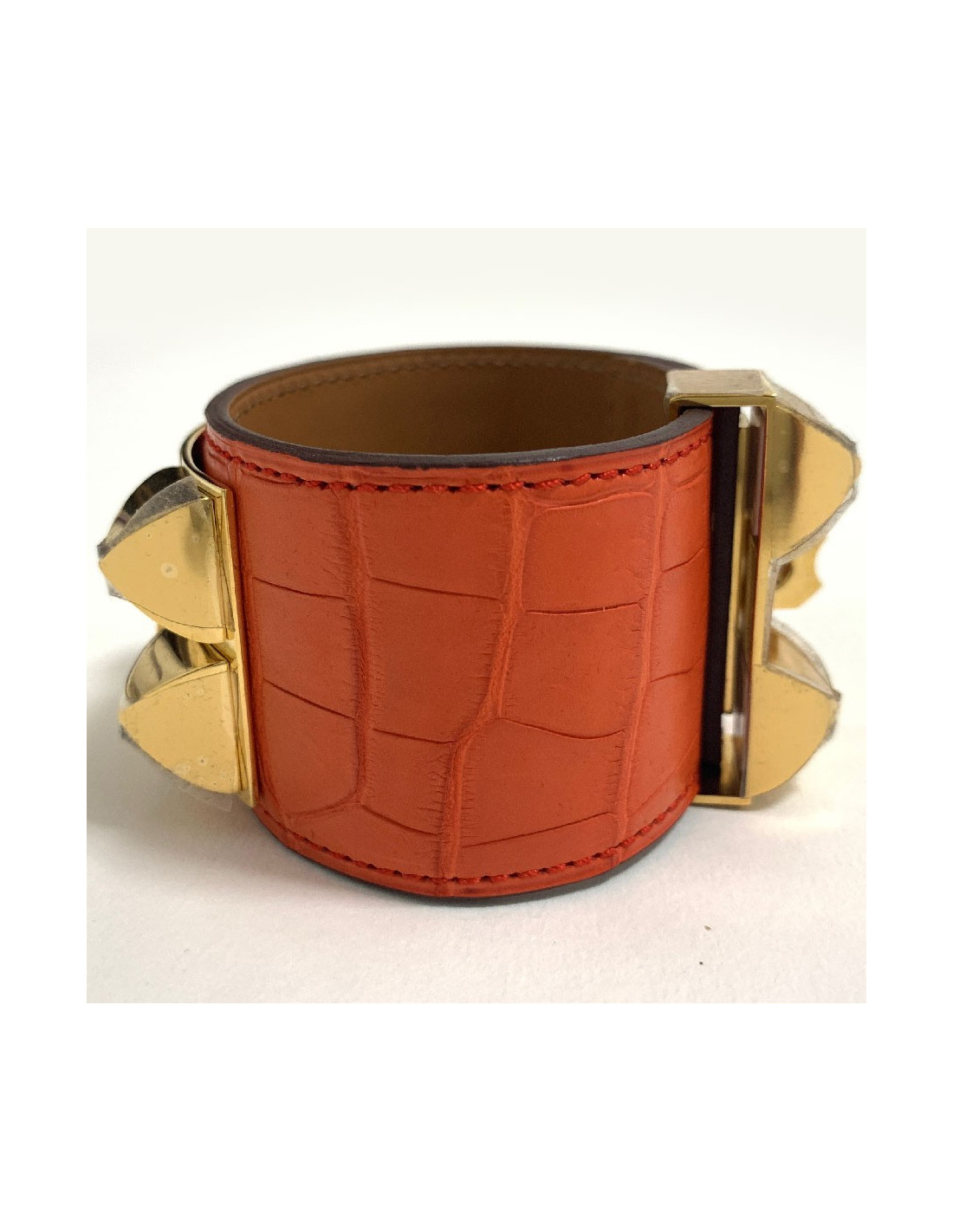 Superbe bracelet HERMES, modèle Collier de Chien, en crocodile orange. L'accastillage est en finition plaqué or. Cette manchette porte encore les plastiques de protections sur sa bijouterie.