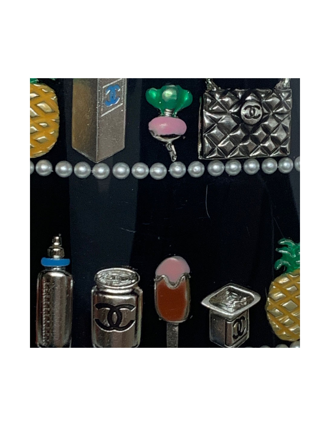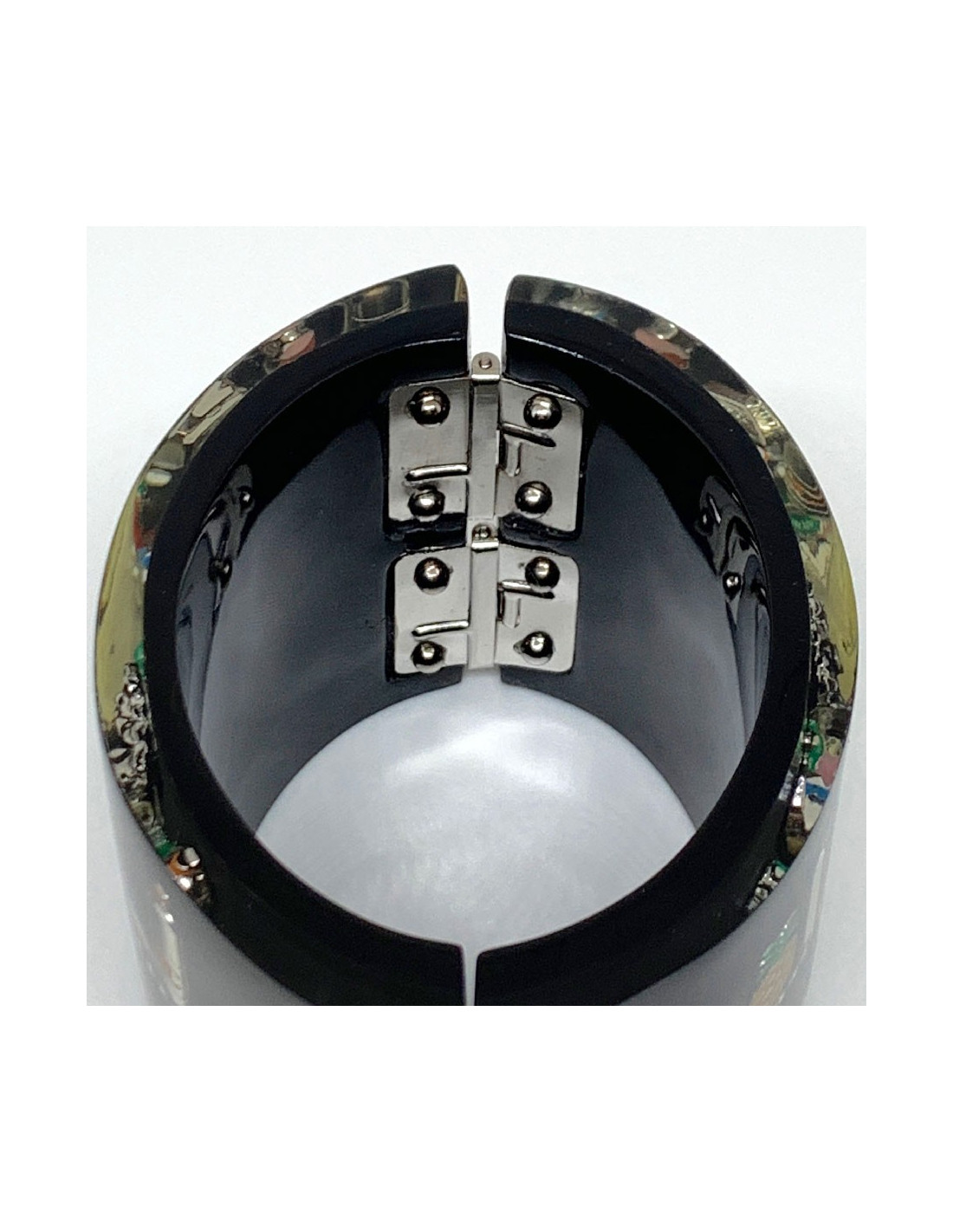 Splendide bijou de la Maison CHANEL. Manchette issue des défilés, en résine noire et inclusion de perles nacrées et divers objets représentant les symboles de la marque.