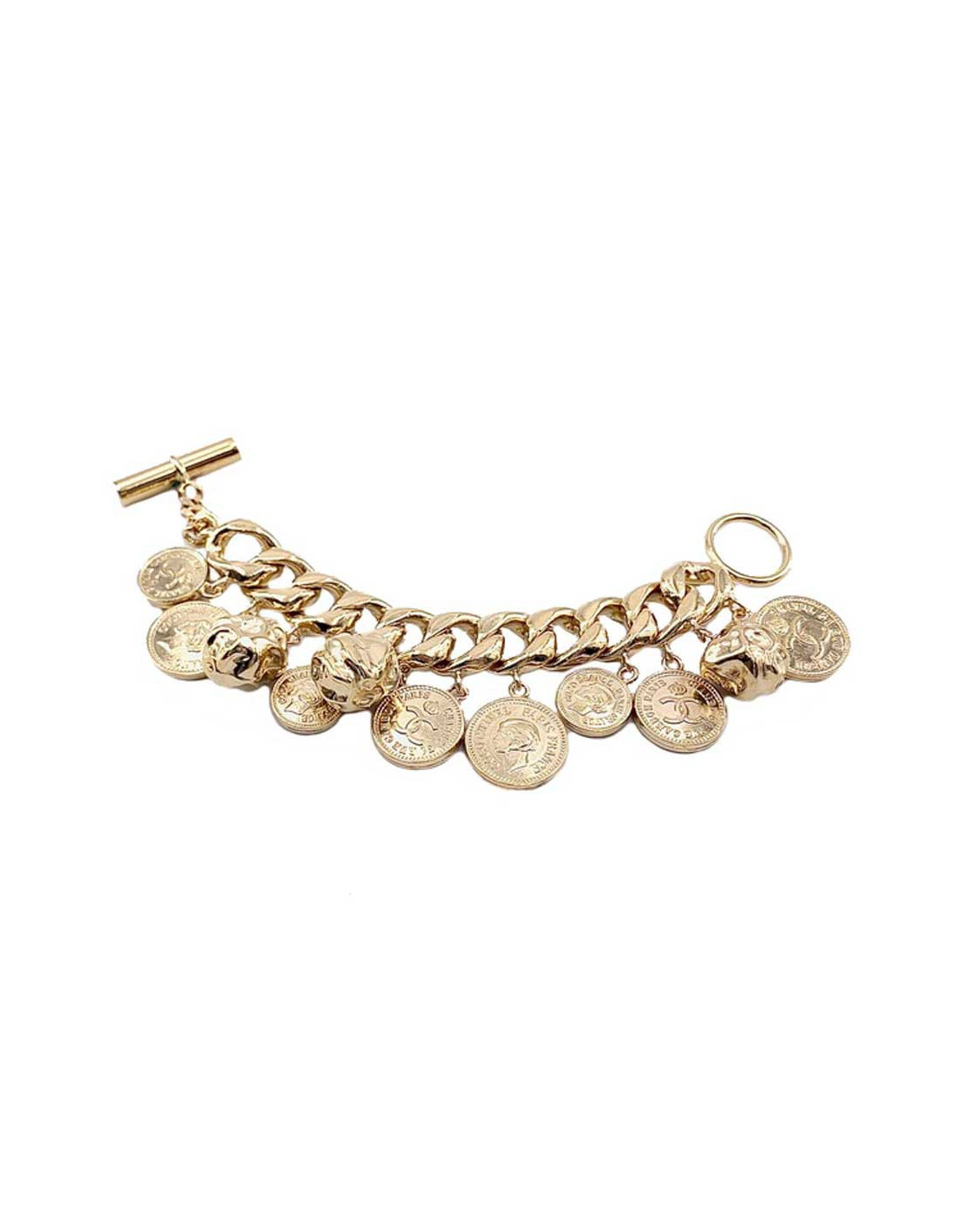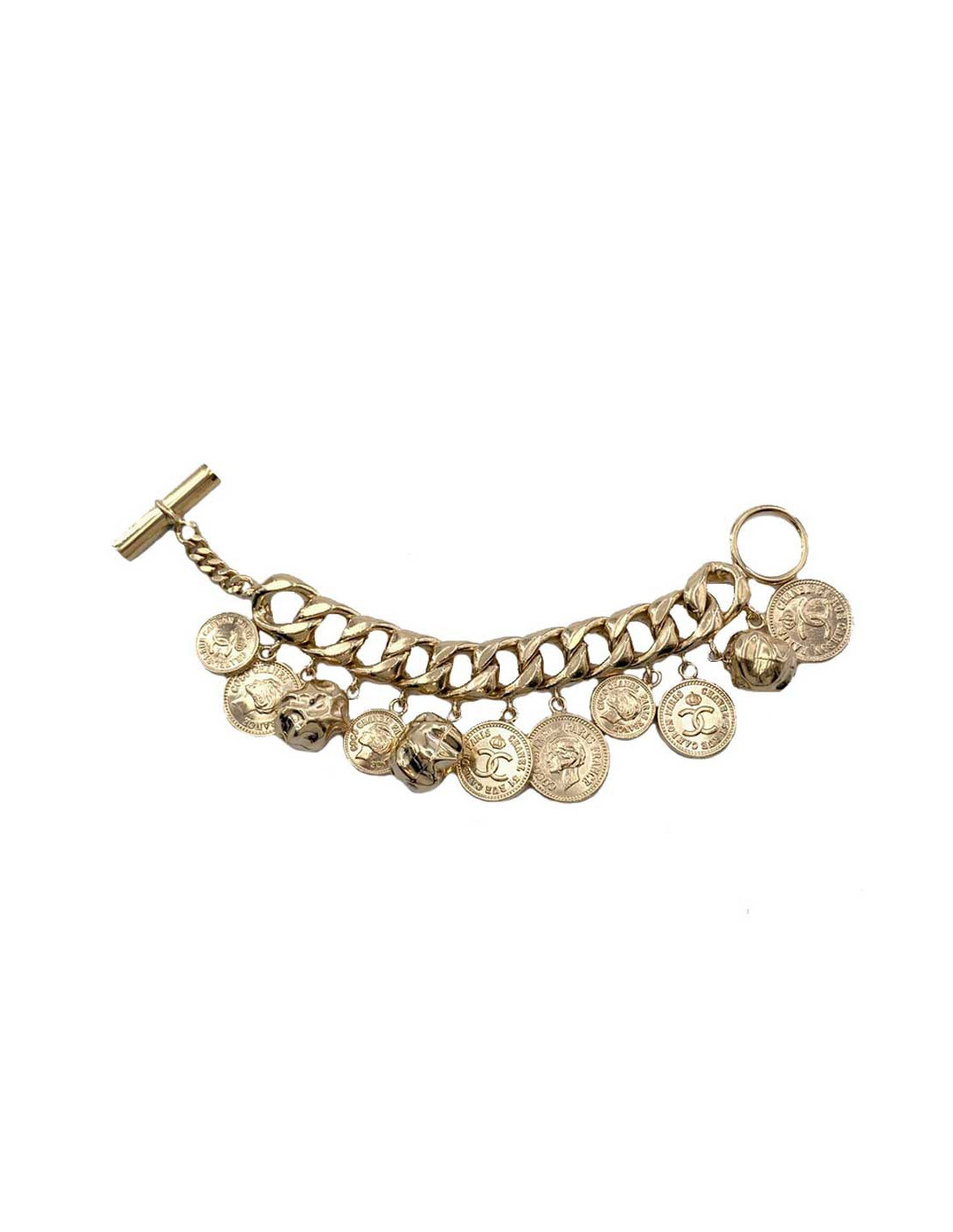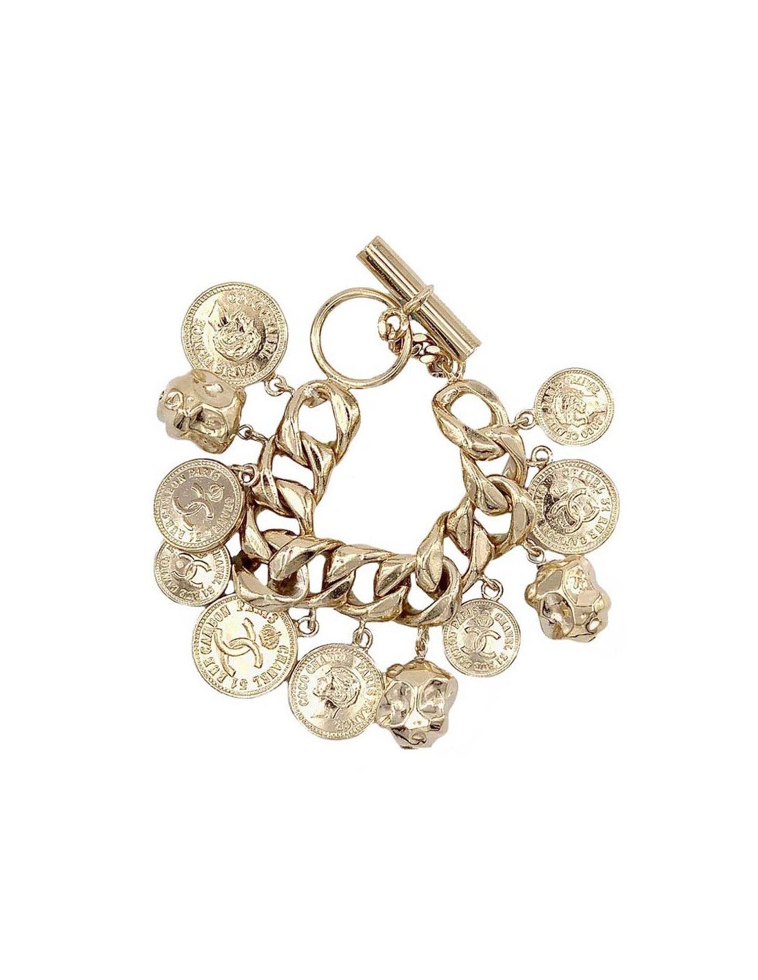 Le bracelet est de la Maison CHANEL. Il se présente sous forme de chaîne en métal doré à l'or fin sur laquelle sont suspendues des pièces CC 31 Rue Cambon Paris. Le bijou s'attache à l'aide d'un fermoir chaîne d'ancre.