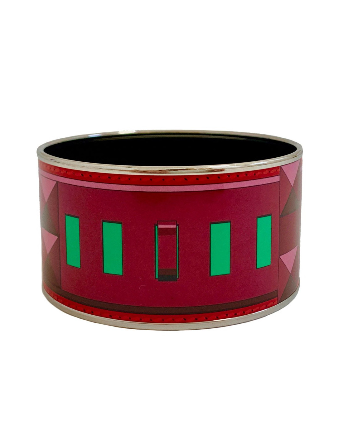 Manchette large HERMES en émail rouge, violet, vert. Motif: collier de chien. Bordure en plaqué or.