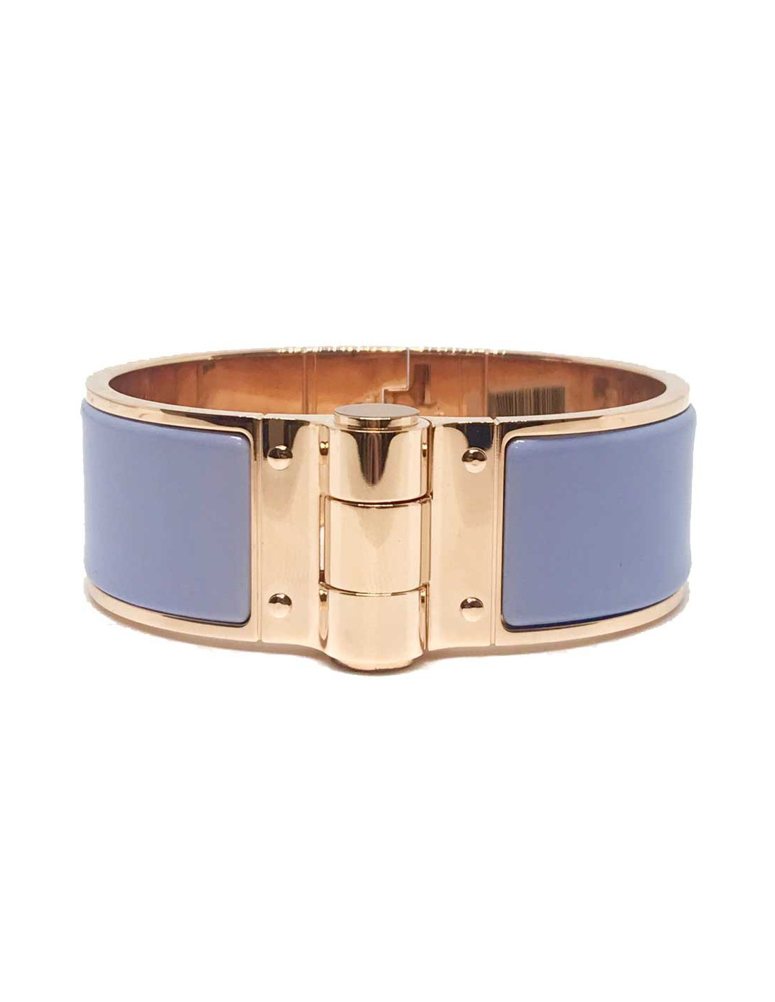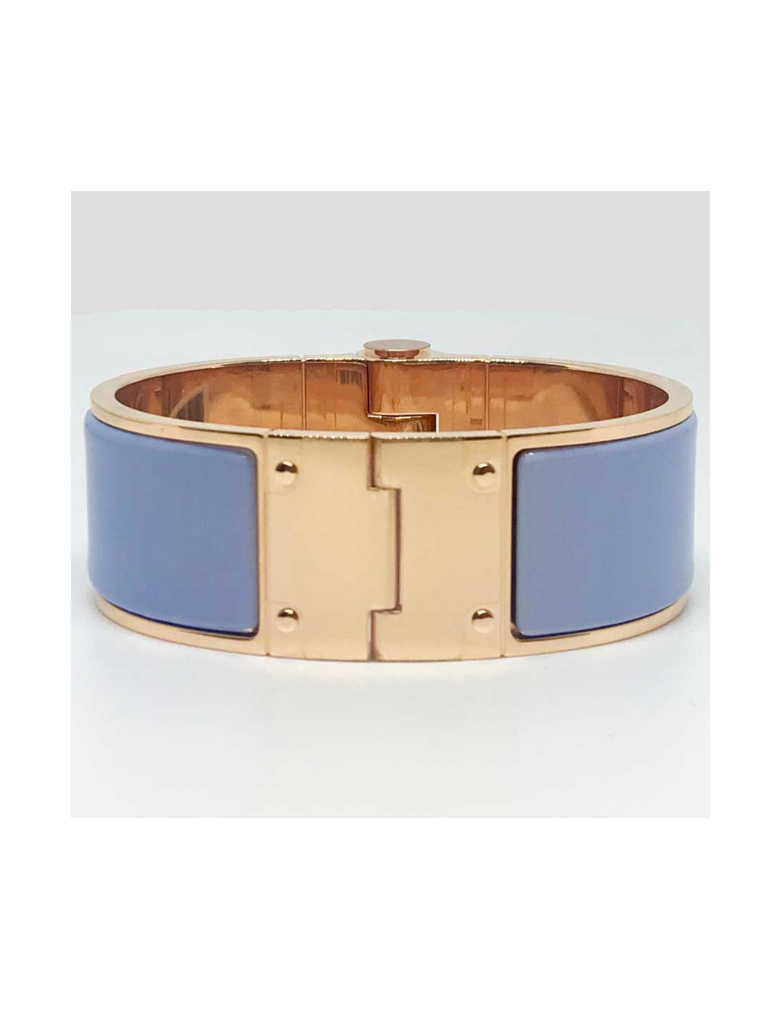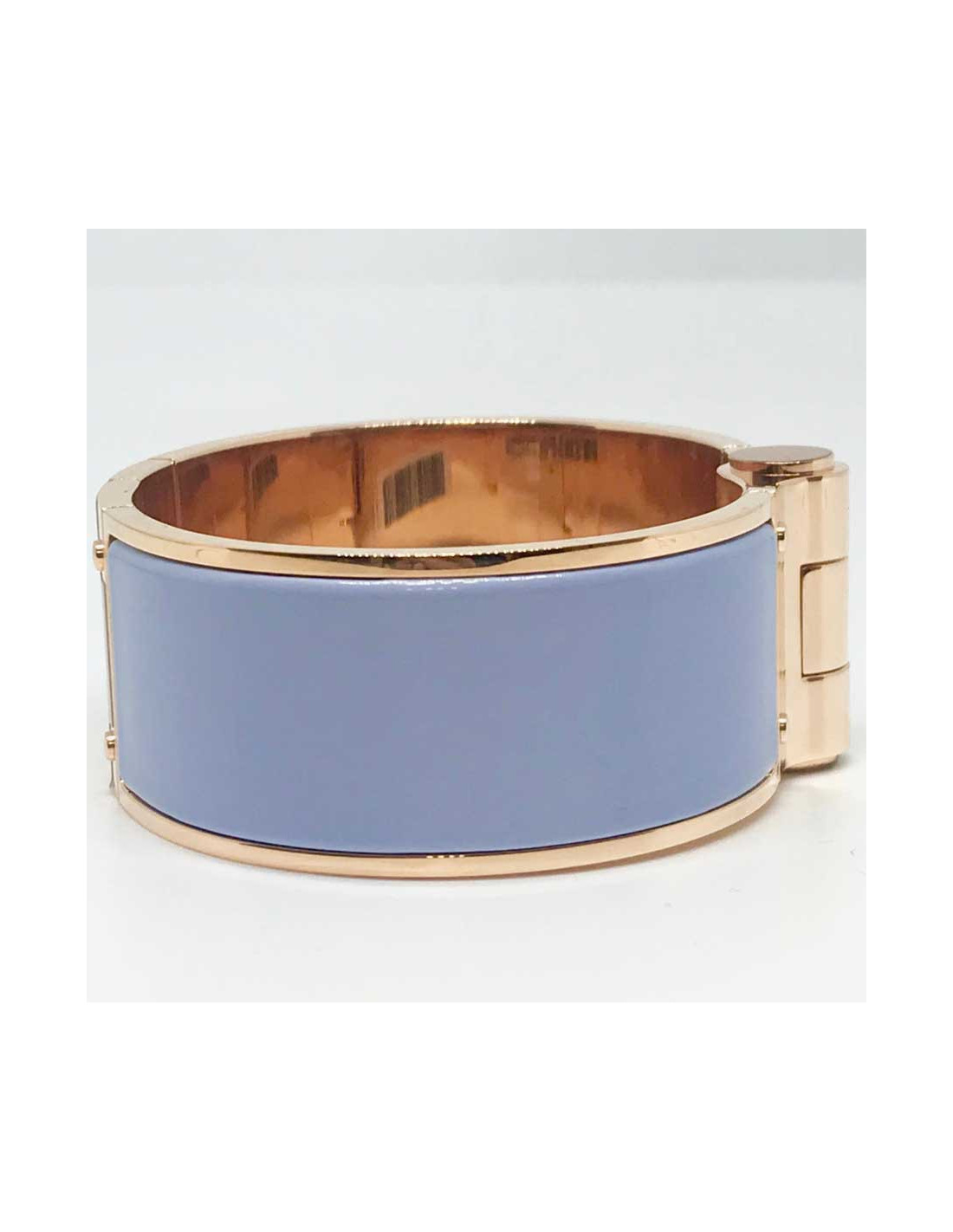 Ravissant bracelet Charnière en émail uni bleu lupin et plaqué or rose. Ce bracelet n'a jamais été porté, il est dans un état impeccable, excepté un leger coup sur l'un des bouton poussoir, à peine visible (voir photo). C'est une taille M. L'ouverture et la fermeture s'effectuent par une articulation de la charnière, en poussant le bouton sur lequel est inscrit Hermes Paris. Le bracelet porte la mention "Made in France".