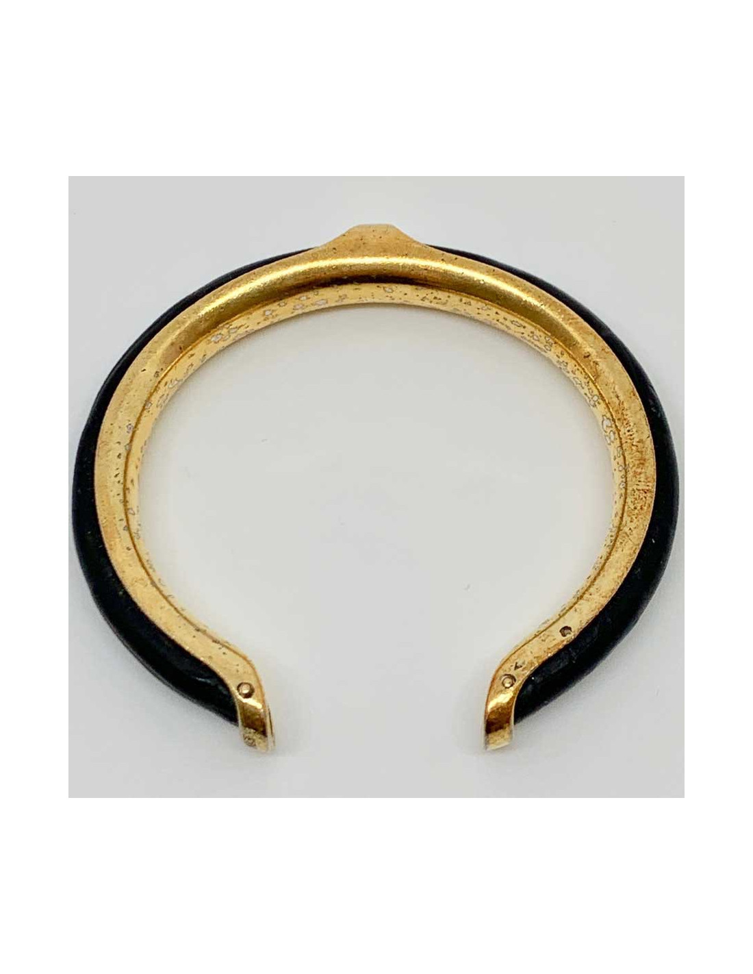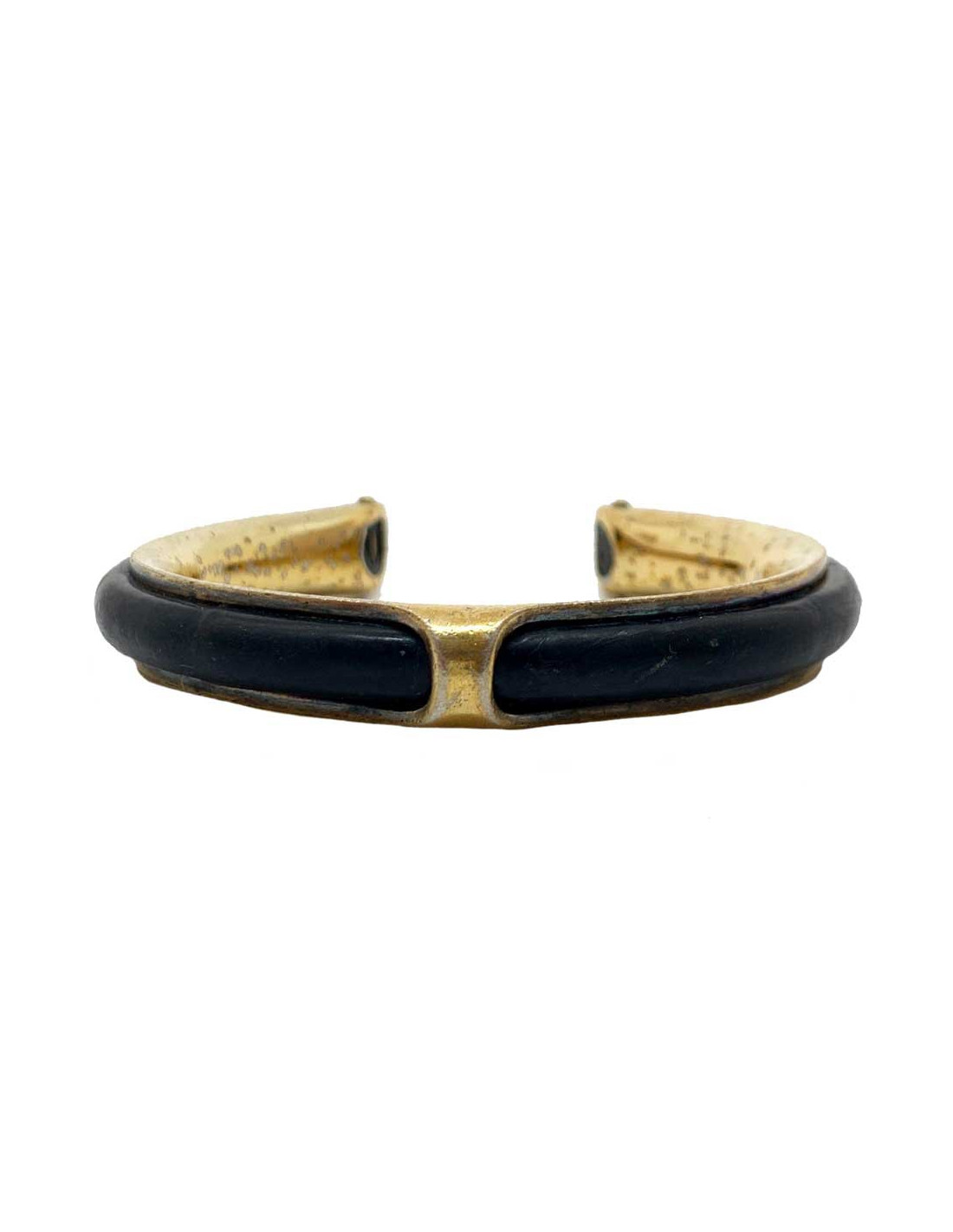 Bracelet vintage de la Maison HERMES. Il est laiton doré et cuir noir. La marque HERMES est gravée sur une extrémité du bijou ainsi que les poinçons des orfèvres.