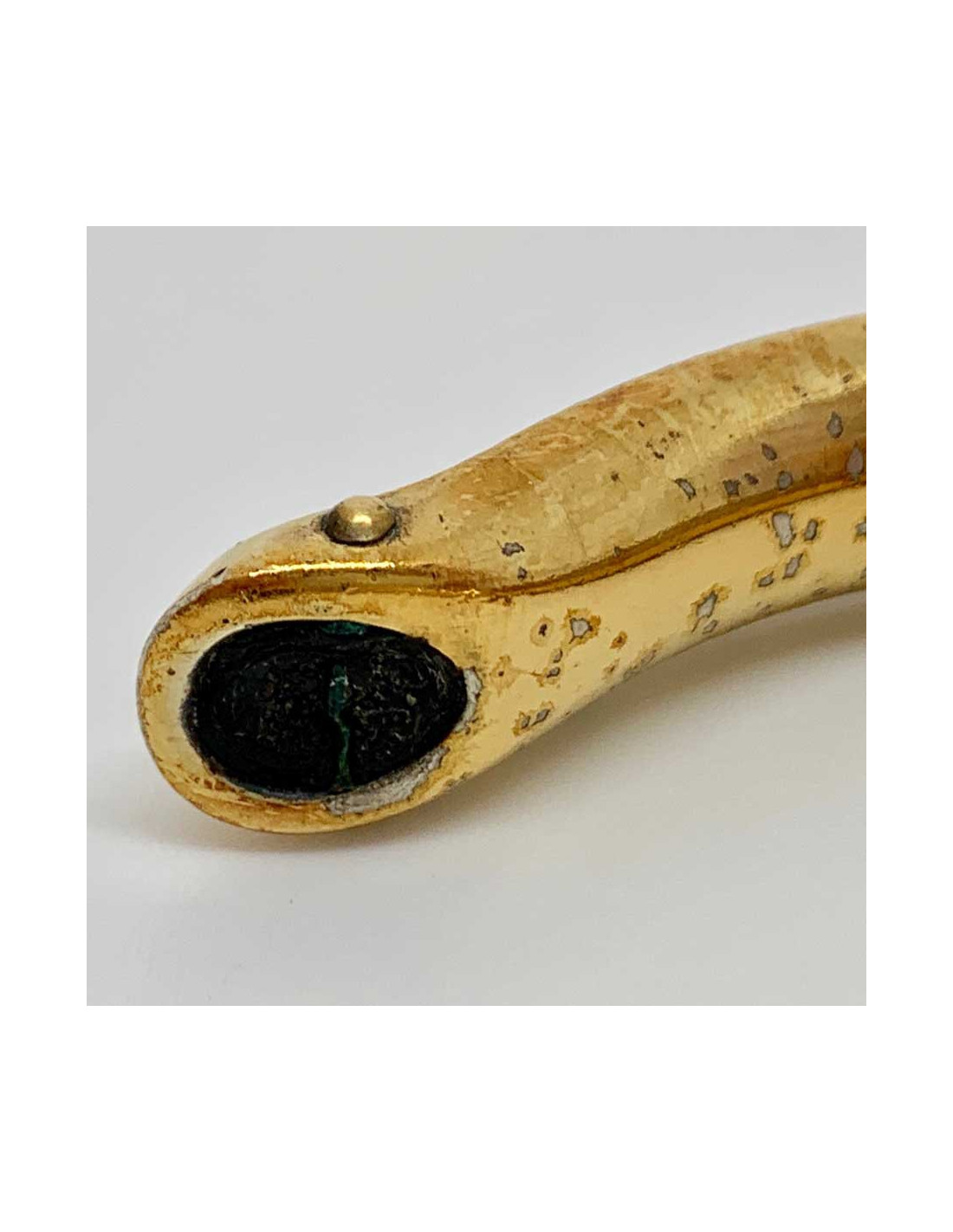 Ce bracelet est dans un état correct. En effet le cuir noir est patiné et le métal doré est piqué sur son ensemble (voir photos).