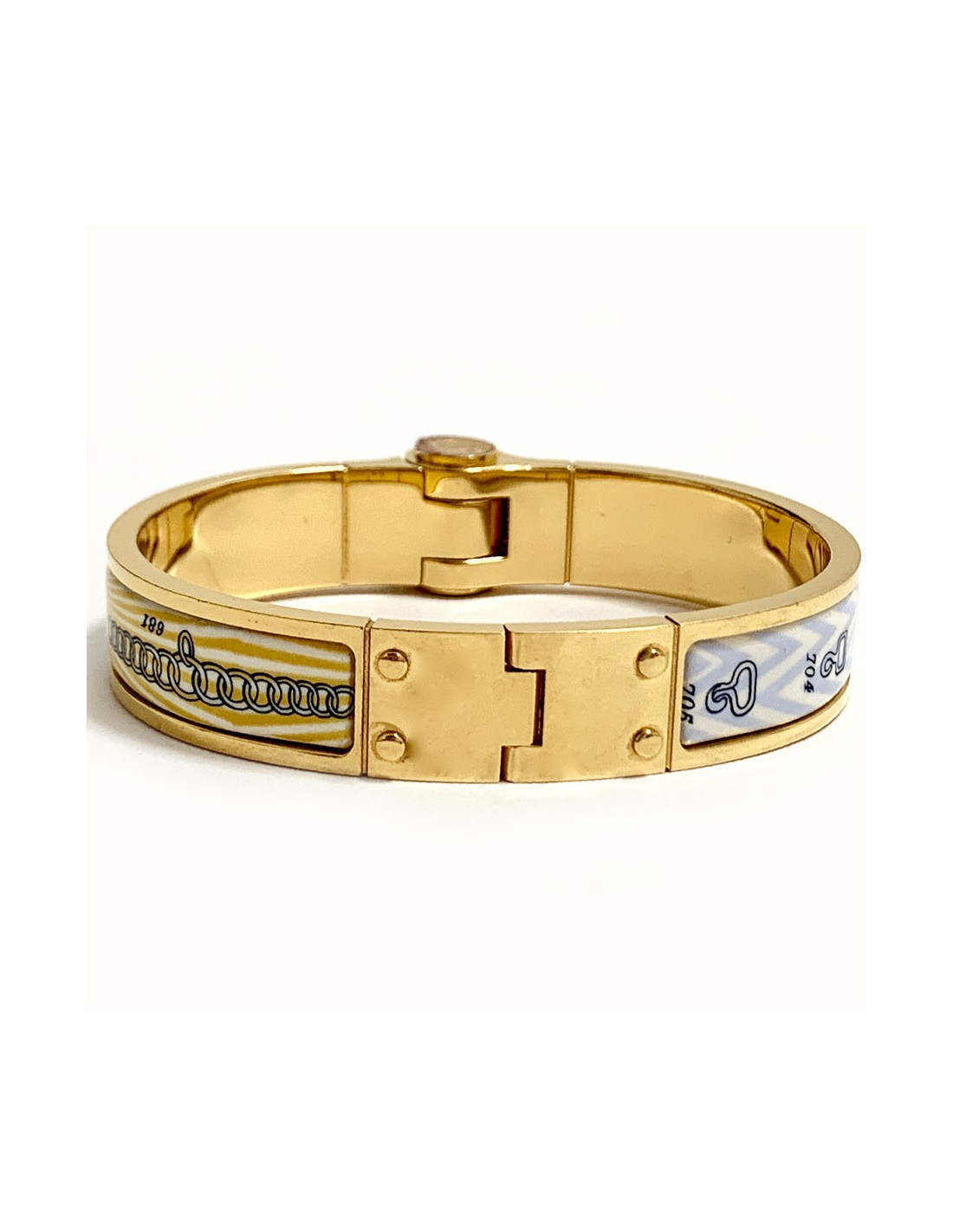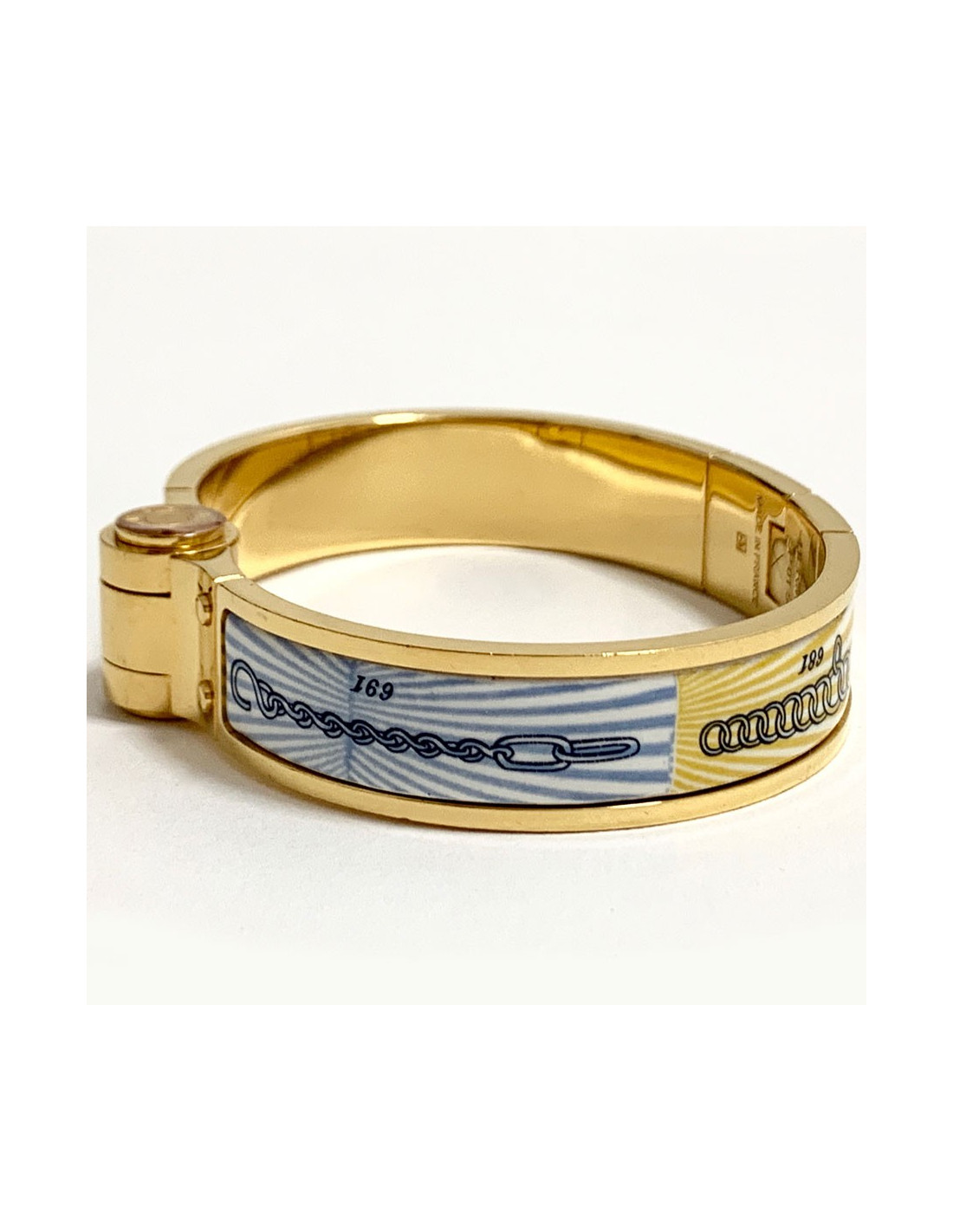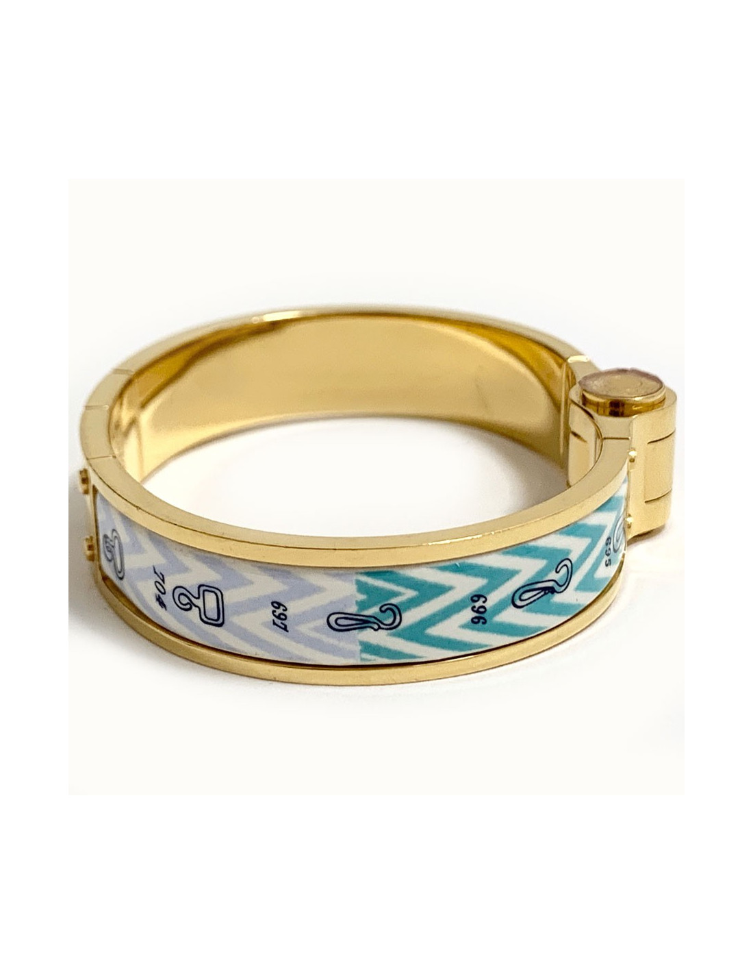 Très beau bracelet fin, modèle charnière, de la Maison HERMES. En laiton finition plaqué or et émail couleur pollen et azur. Motif chevron.