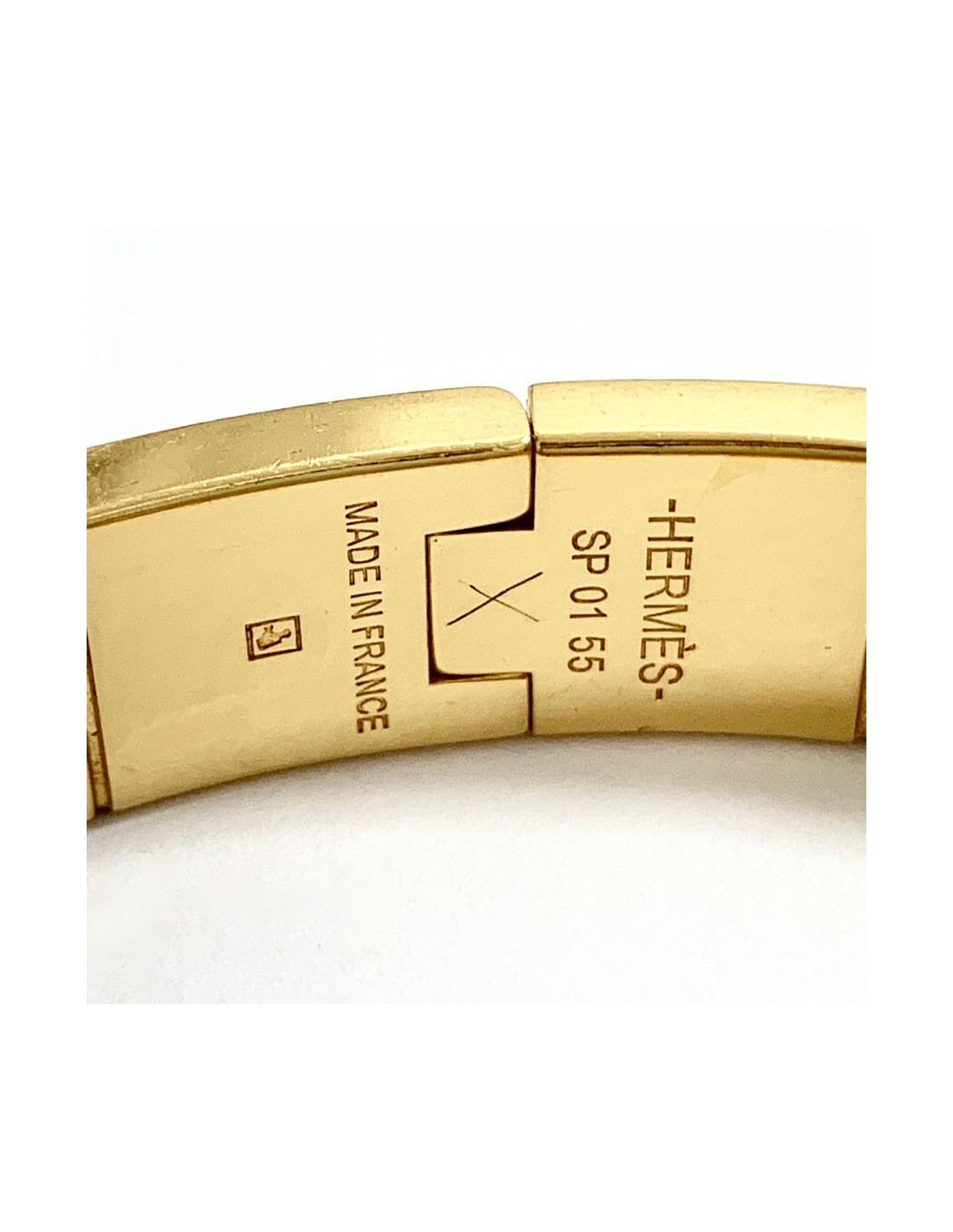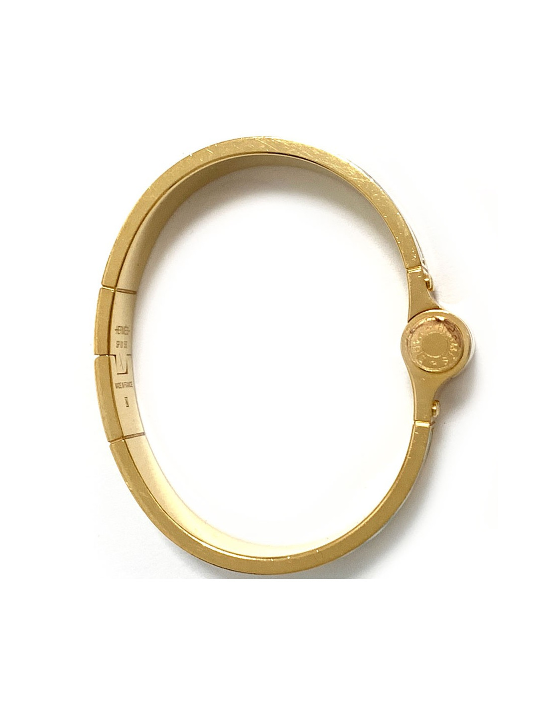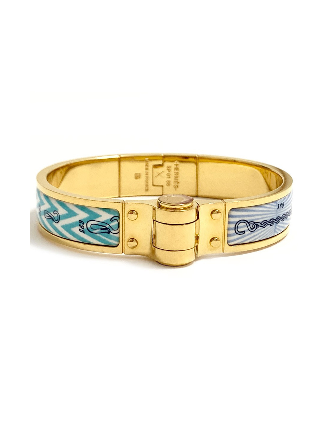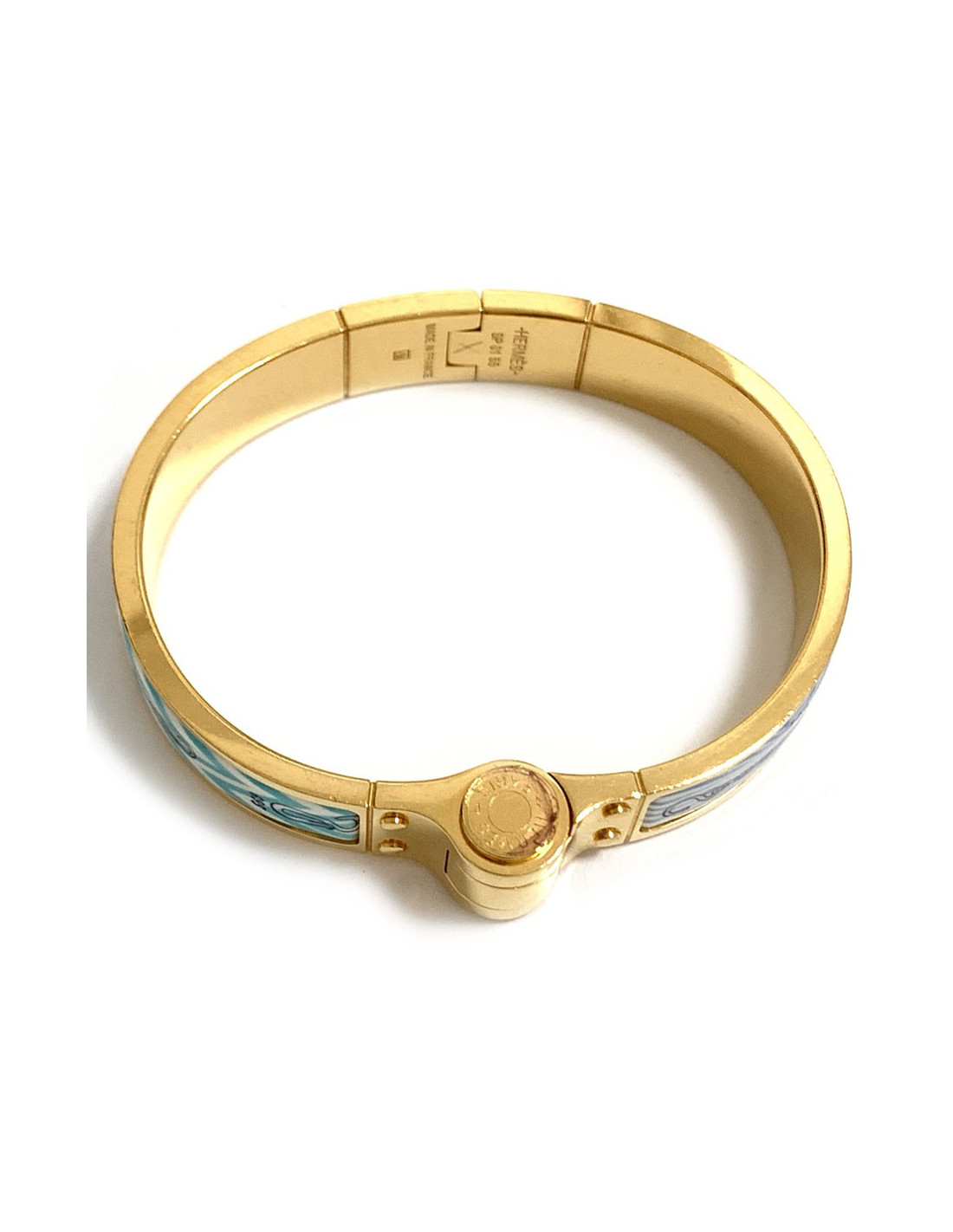 Très beau bracelet fin, modèle charnière, de la Maison HERMES. En laiton finition plaqué or et émail couleur pollen et azur. Motif chevron.