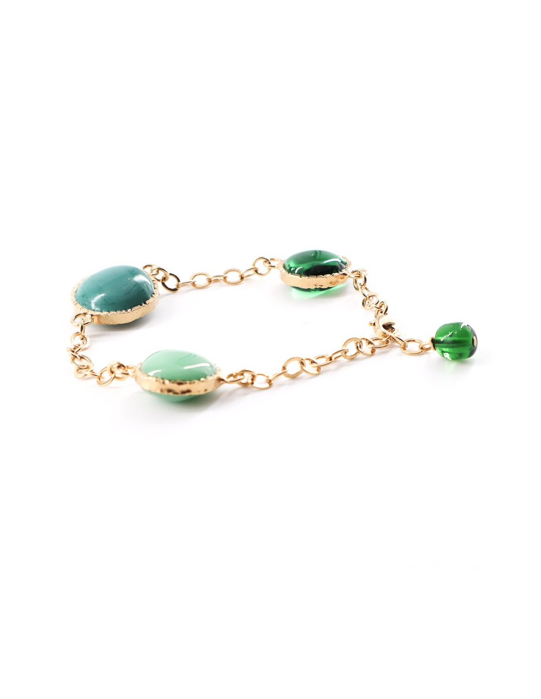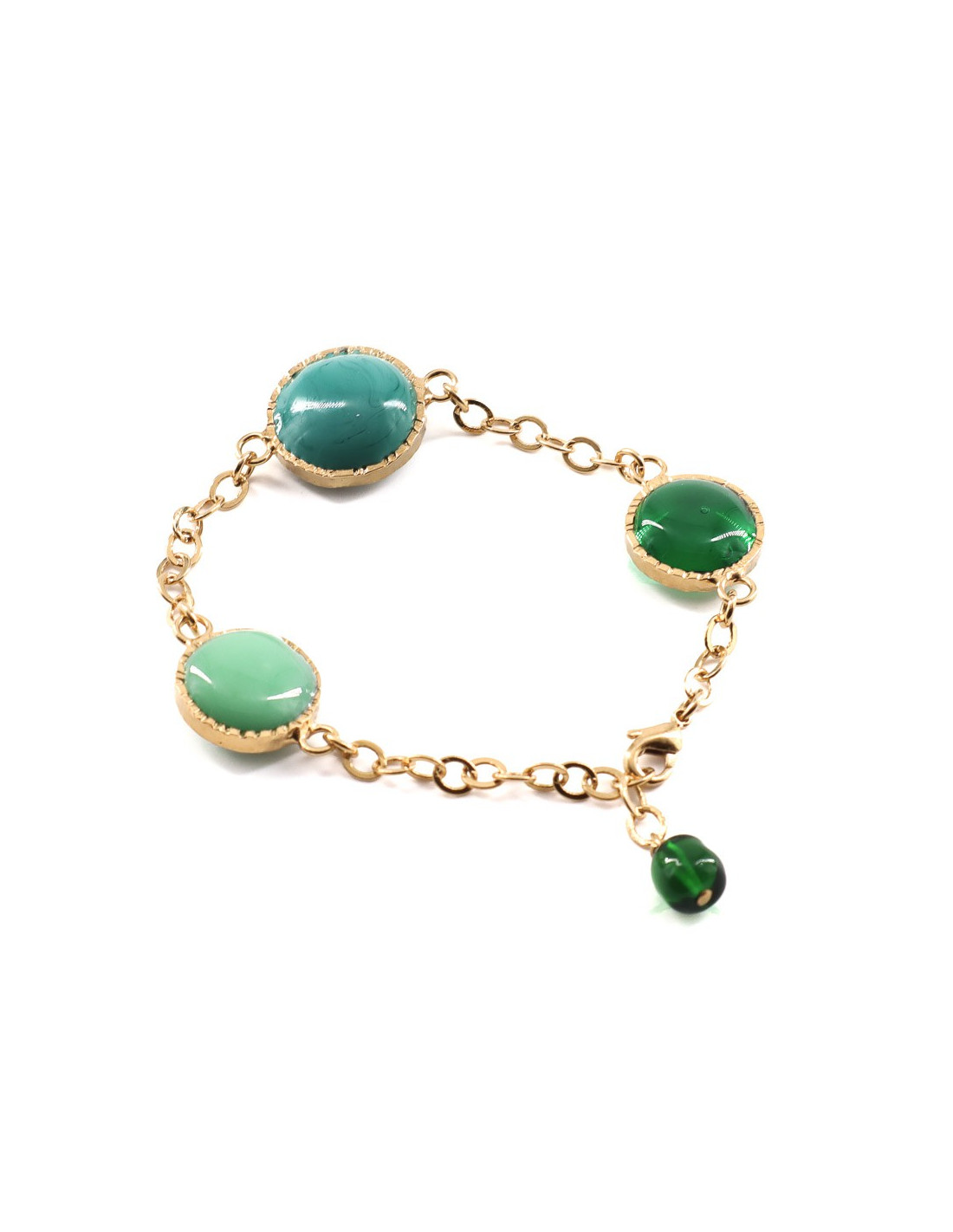 Ravissant bracelet réalisé à la main par les artisans français de la Maison Marguerite de Valois. Cette dernière a servi, et ce durant plusieurs décennies, les plus grands créateurs mondiaux. Tout son savoir-faire réside dans le travail de la pâte de verre comme elle nous le montre ici avec ce bracelet chaîne en métal doré à l'or fin sur lequel s'apposent trois cabochon ronds de pâte de verre verte.