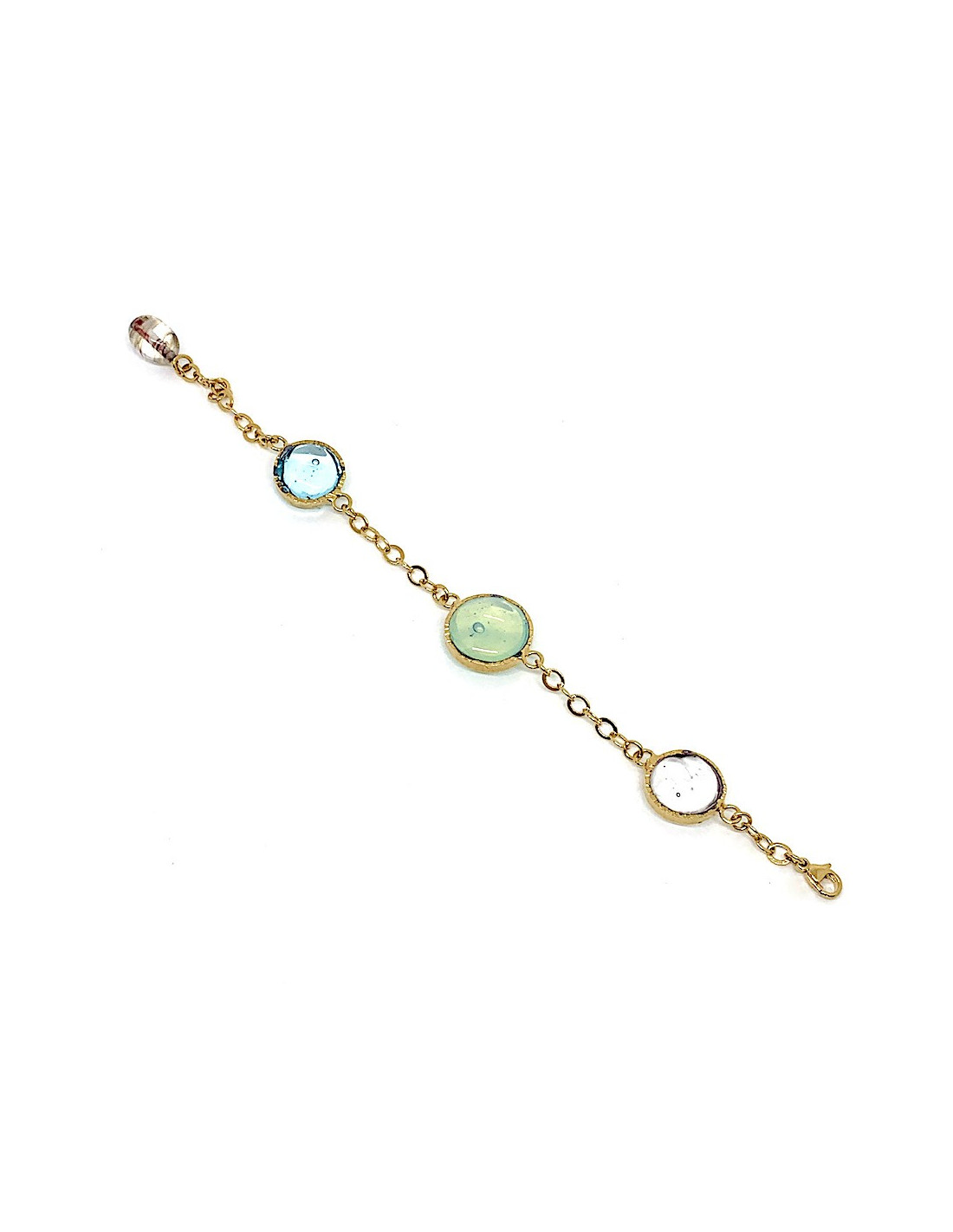 Bracelet en métal doré à l'or fin et cabochons en pâte de verre dans les tons de céladon transparent, bleu ciel transparent et transparent.